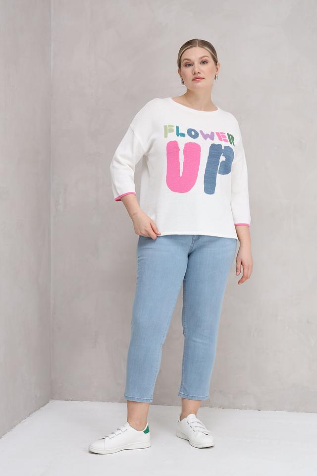 Этот пуловер от Lecomte – отличный выбор для создания непринужденного и яркого образа. Он выполнен в белом цвете и украшен крупной, многоцветной надписью "Flower Up", которая придает ему оригинальность и позитивный настрой.
