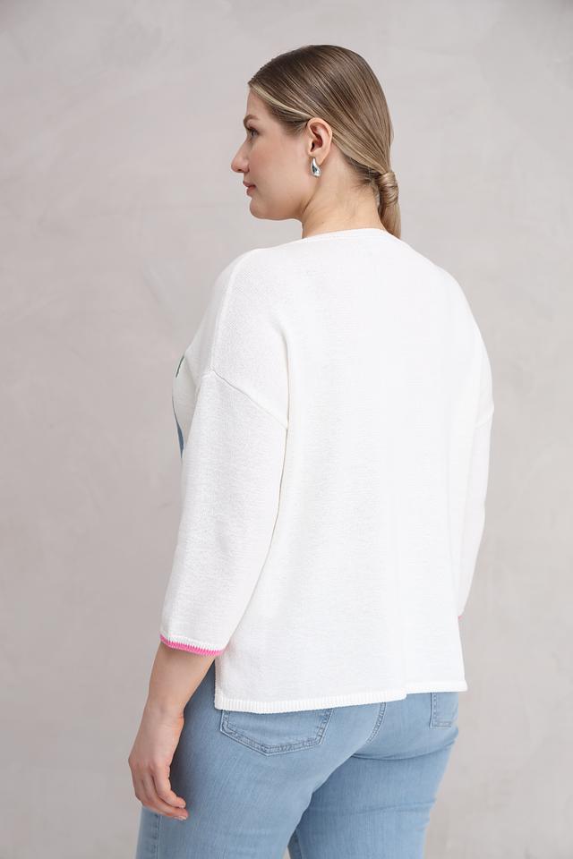 Модель имеет прямой крой, круглый вырез горловины и рукава 3/4. Пуловер изготовлен из высококачественного хлопка (80%) с добавлением полиамида (20%), что делает его приятным к телу, дышащим и износостойким.