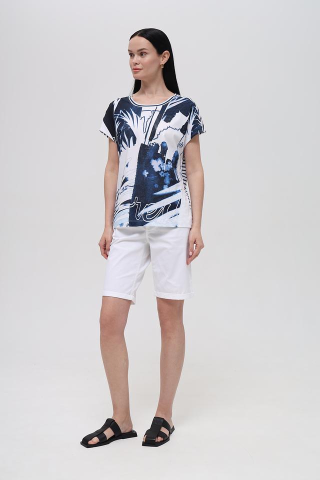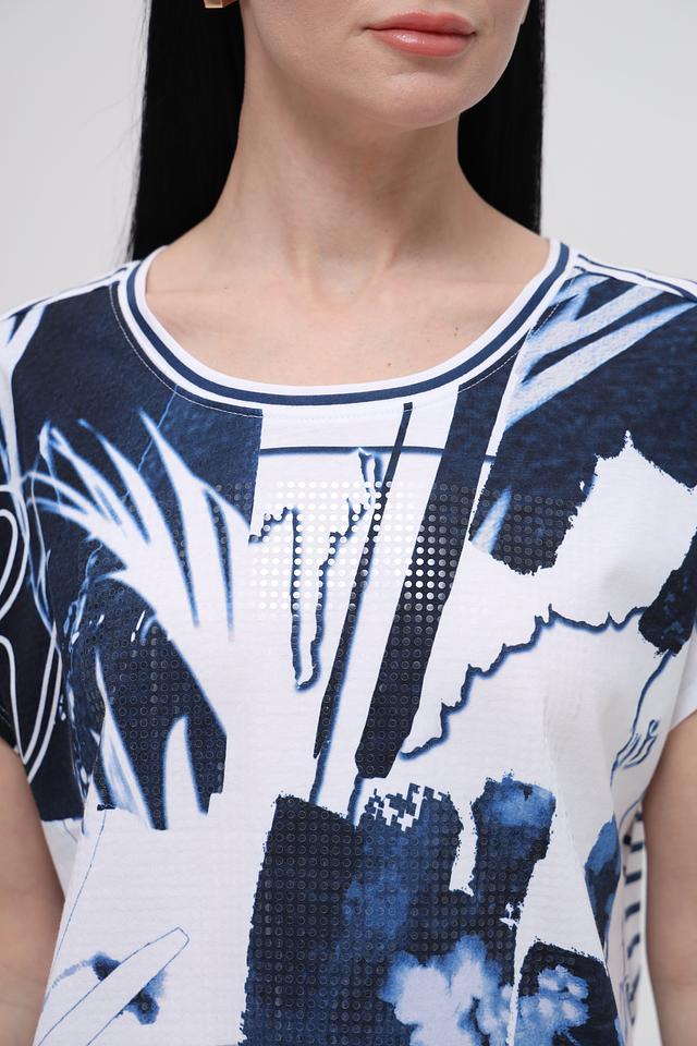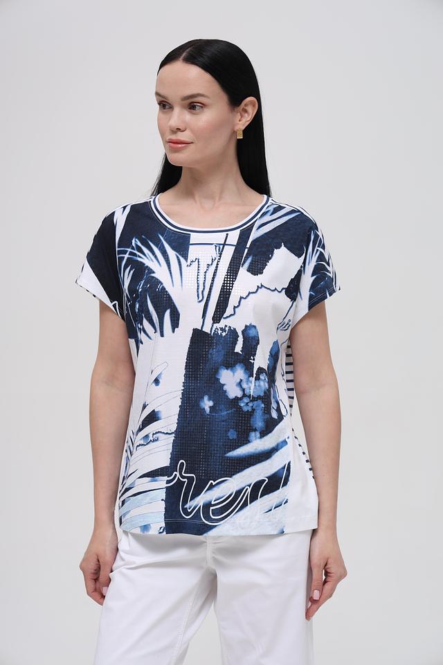 Основной цвет футболки – синий, но она украшена оригинальным принтом с изображением пальмовых листьев и абстрактных элементов в белых и синих тонах. Принт добавляет образу динамичности и индивидуальности.