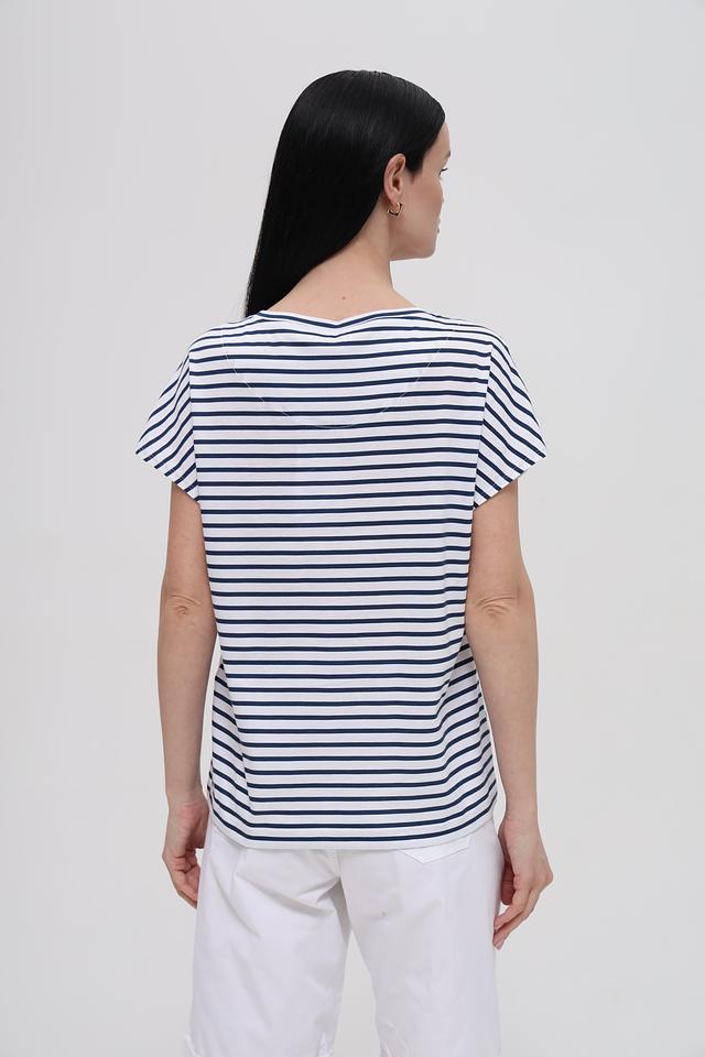 Модель имеет прямой крой, короткие рукава и круглый вырез горловины. На спине футболка выполнена в классическую сине-белую полоску. Такой дизайн делает футболку универсальной и подходящей для различных случаев.