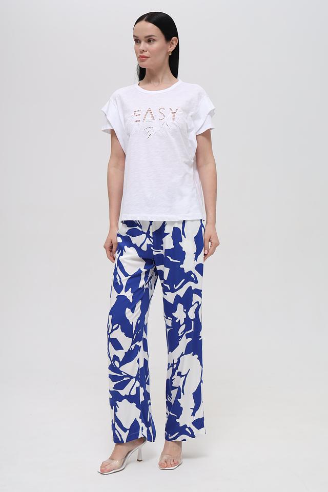 Особенностью данной модели является оригинальный принт "Easy", выполненный в виде ажурного рисунка с изображением пальмовых листьев. Футболка имеет круглый вырез горловины и короткие рукава с небольшими манжетами.