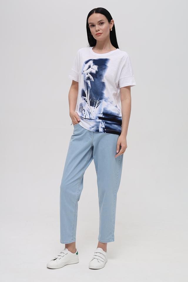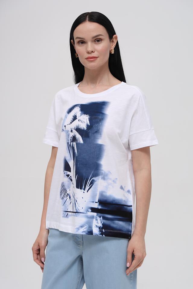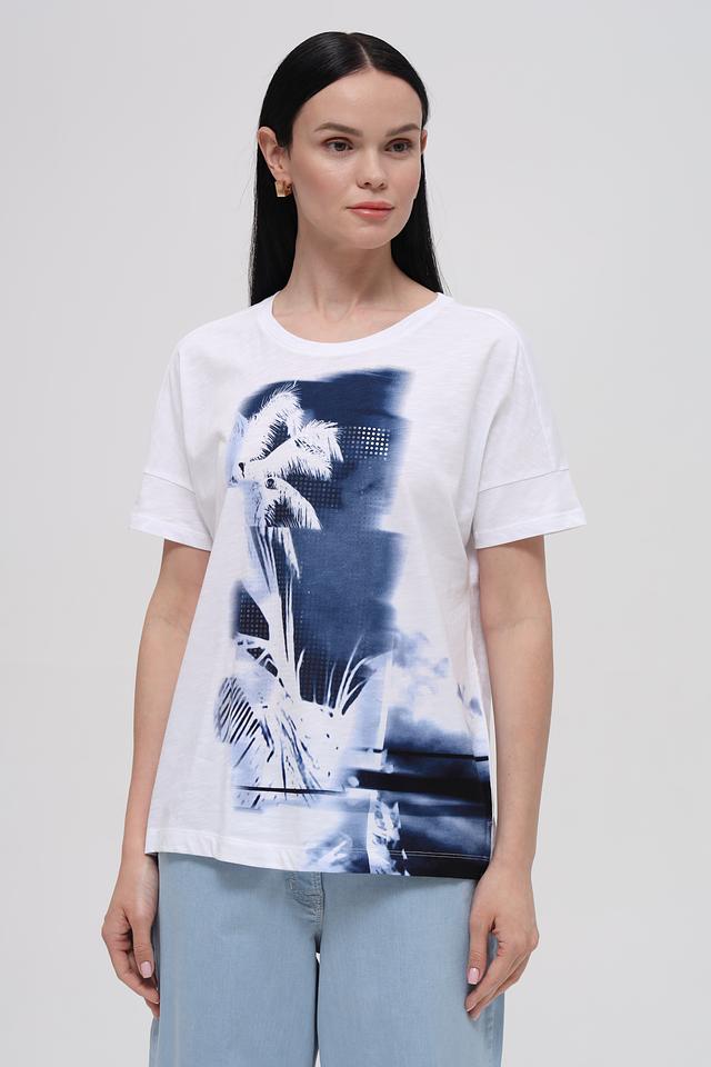 Особенностью данной модели является эффектный принт с изображением пальм в синих тонах. Принт выполнен в технике, имитирующей акварельный рисунок, что придает футболке оригинальность и свежий вид.
