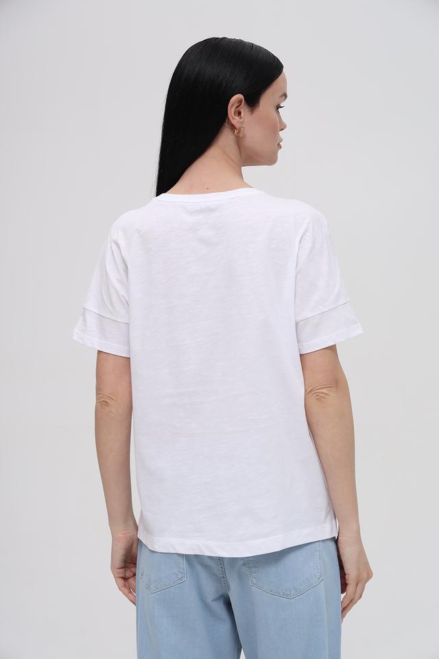 Круглый вырез горловины и короткие рукава обеспечивают свободу движений. Футболка имеет прямой, слегка свободный крой, который подходит для разных типов фигур. Она идеально сочетается с джинсами, шортами или юбками, создавая непринужденный и стильный образ.