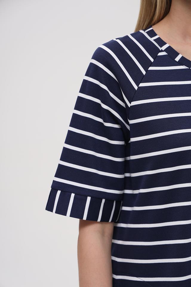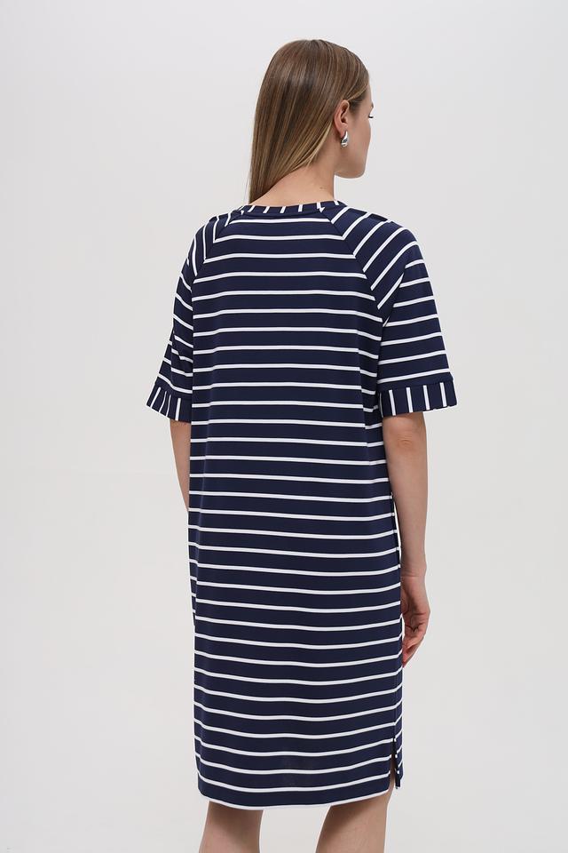 Это платье от Lecomte выполнено в классическом стиле с использованием горизонтальной полоски. Основной цвет – тёмно-синий, который гармонично сочетается с белыми полосами, создавая свежий и элегантный образ.
