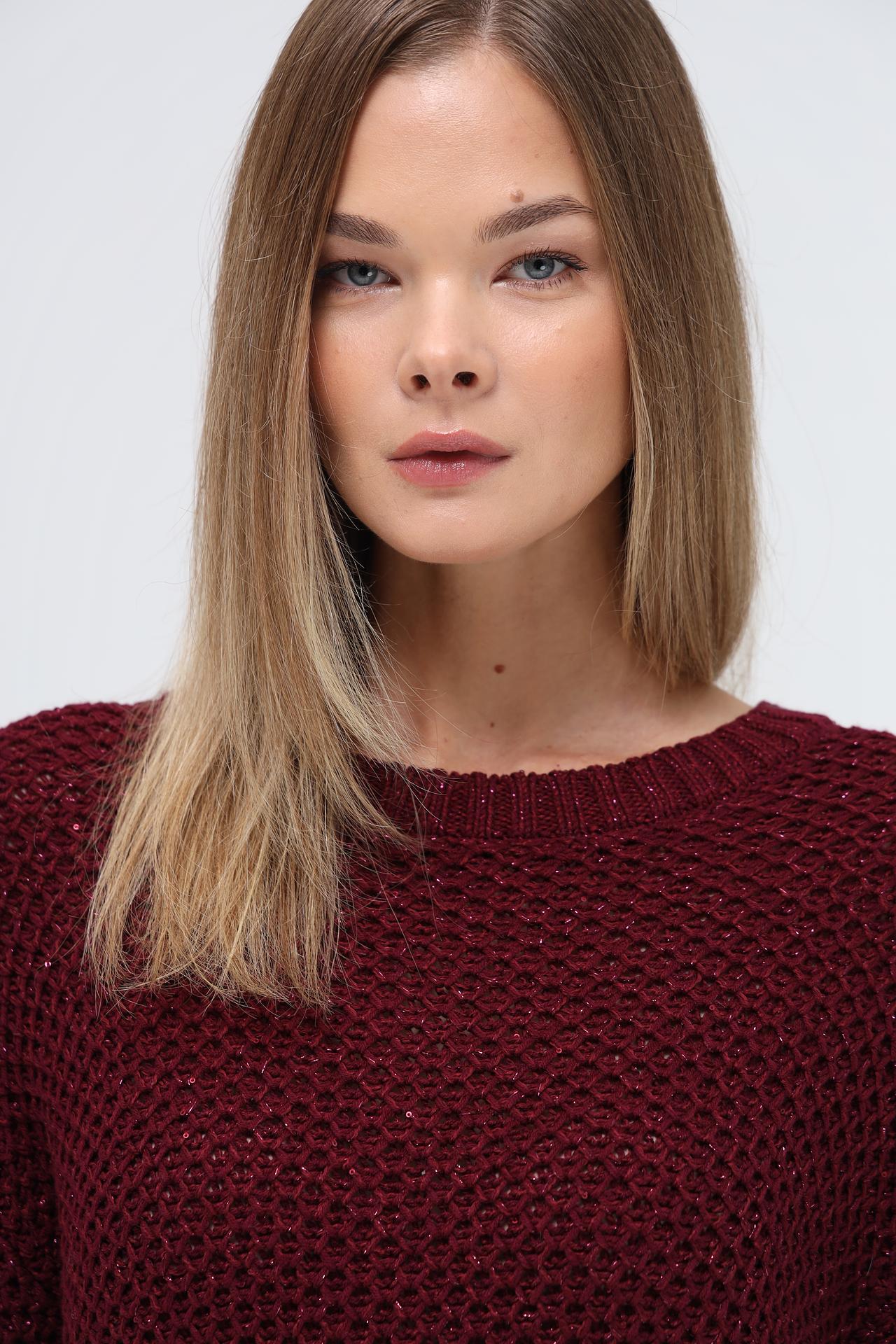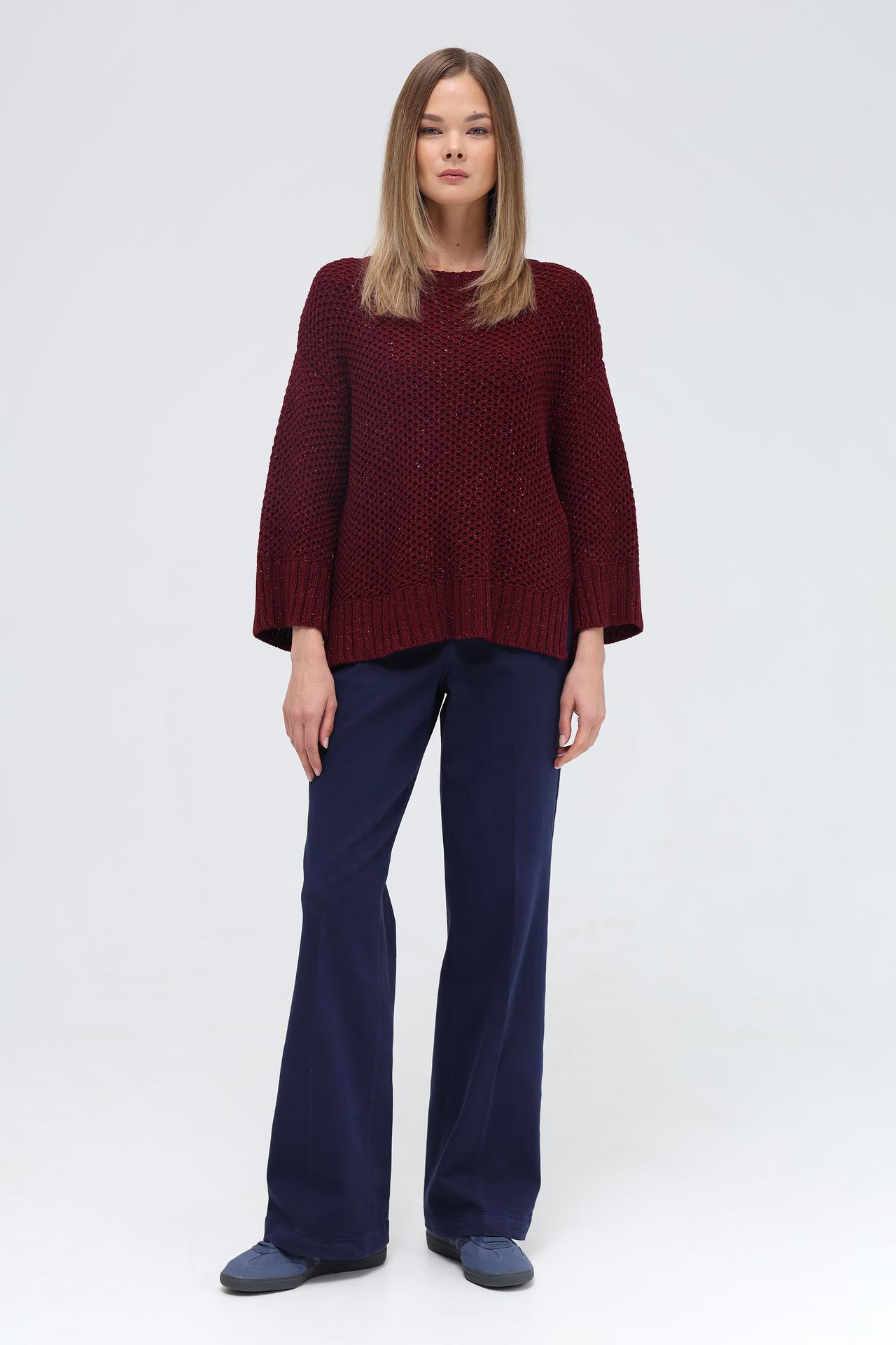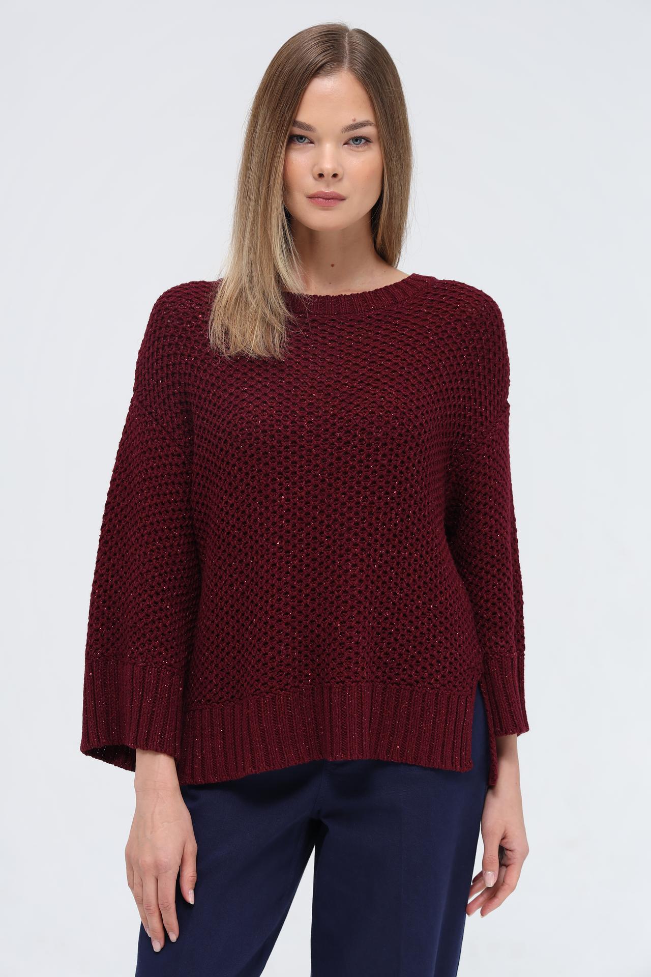 - Универсальный дизайн: Классический крой и элегантный бордовый цвет позволяют легко комбинировать вязаный пуловер с различными элементами гардероба. Он идеально подходит как для офиса, так и для неформальных встреч.