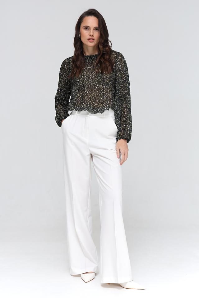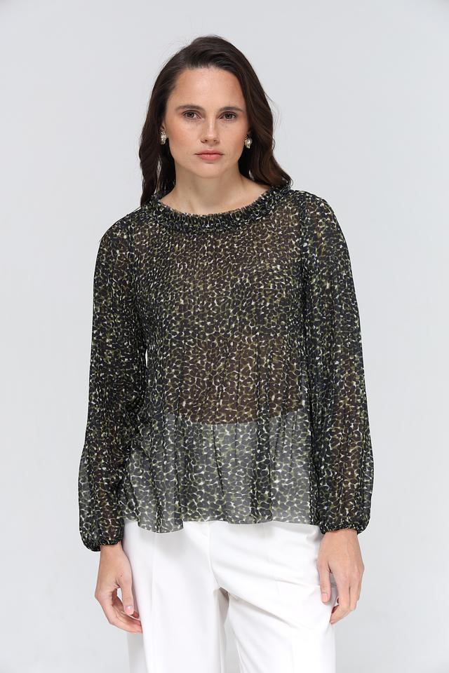 Блуза имеет свободный крой и длинные рукава с небольшими сборками на манжетах, что придает ей романтичный вид. Вырез горловины оформлен сборкой, добавляя изящества.