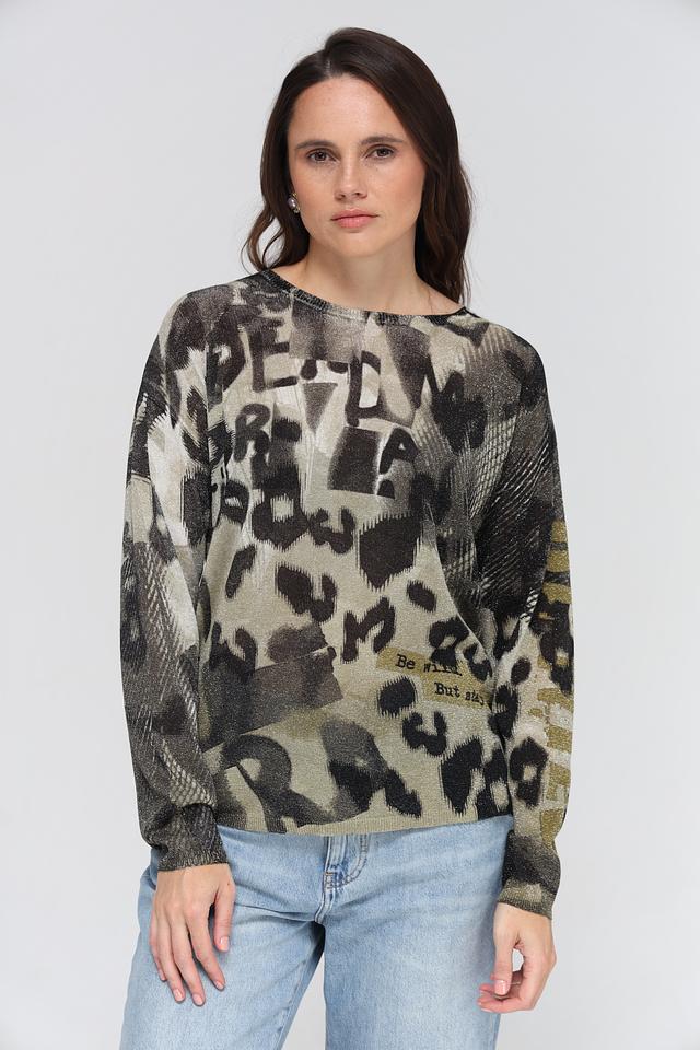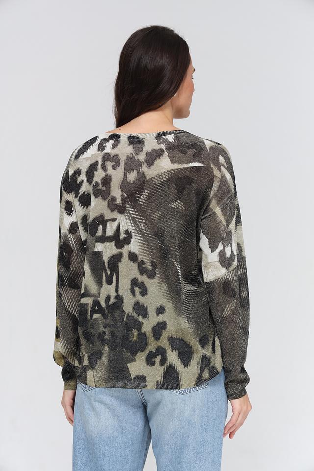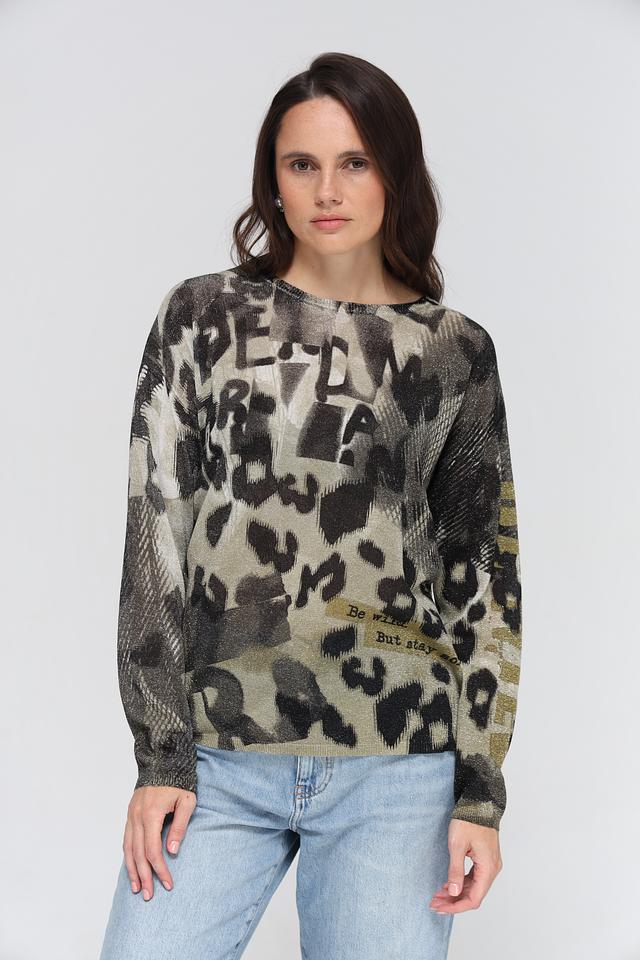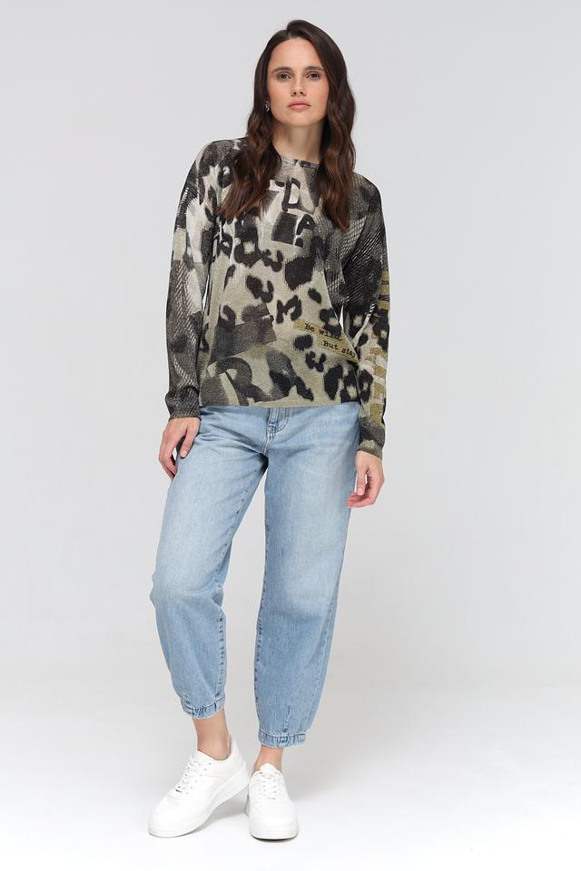 Женский пуловер Lecomte хаки с оригинальным леопардовым принтом и надписями. Модель выполнена из мягкой вискозы с добавлением полиэстера и сизаля, обеспечивающих комфорт и износостойкость. Состав: вискоза 71%, полиэстер 19%, мексиканский сизаль 10%