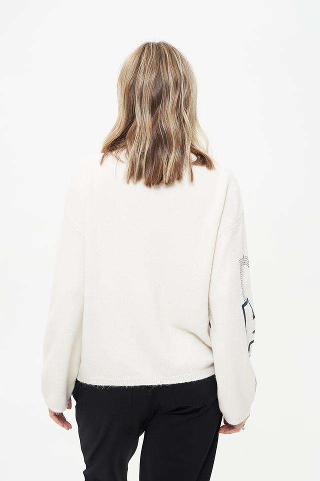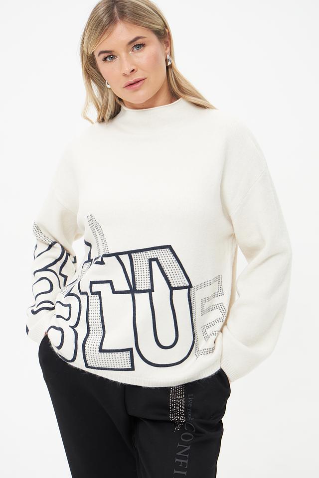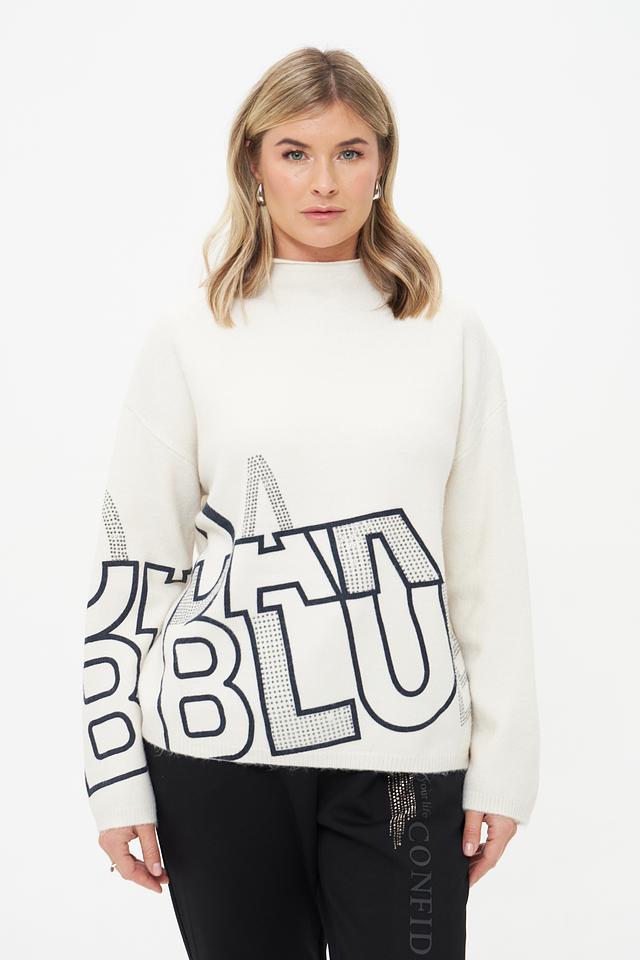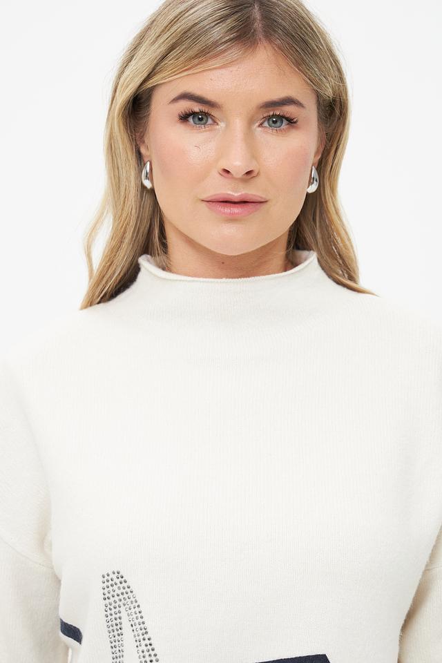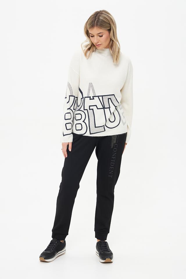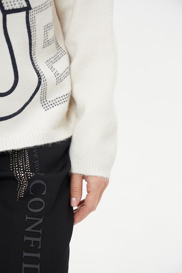 Этот пуловер от Lecomte станет ярким акцентом вашего образа. Выполнен в кремовом цвете и украшен крупным принтом с надписью в графитовых и белых тонах, декорированным стразами.