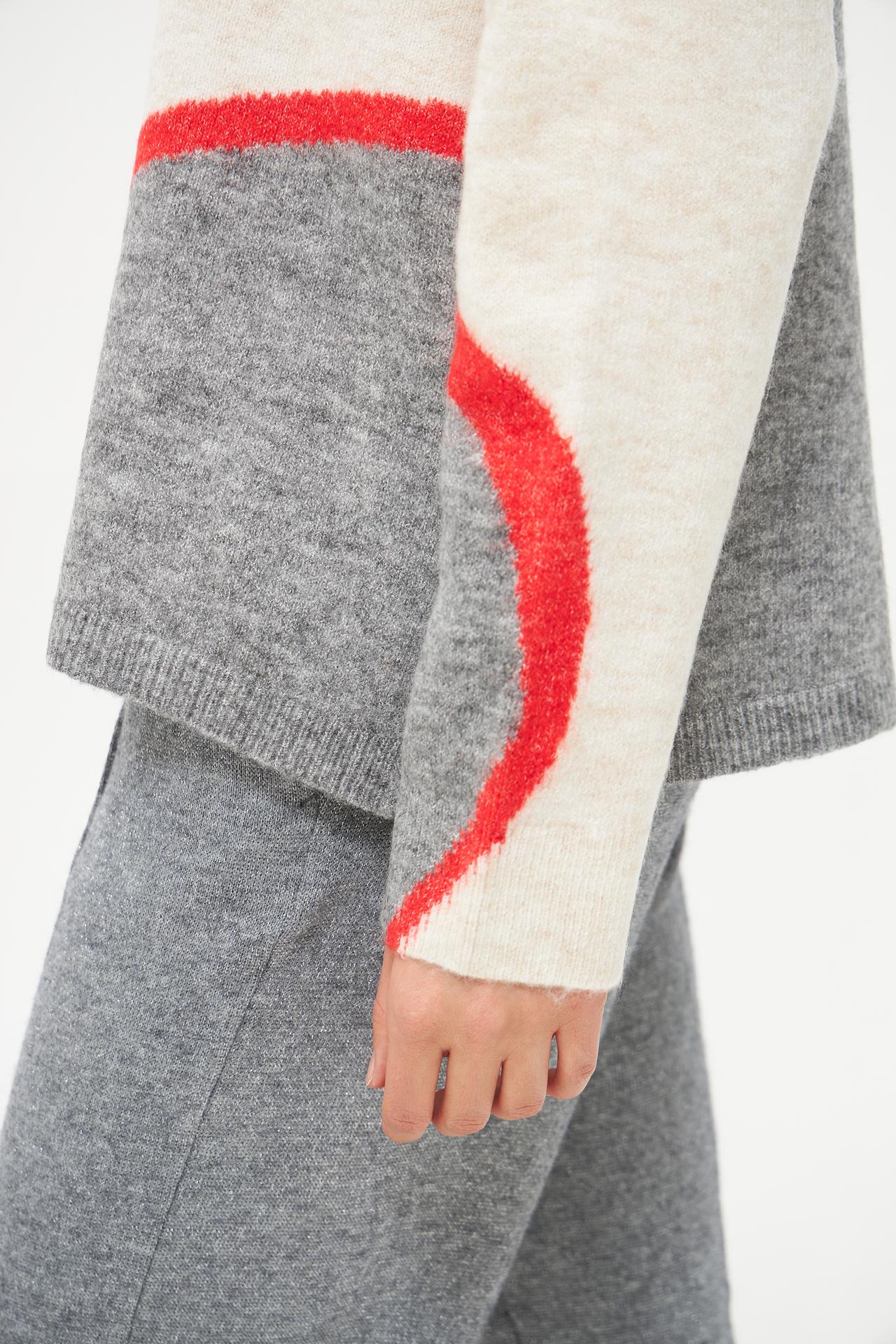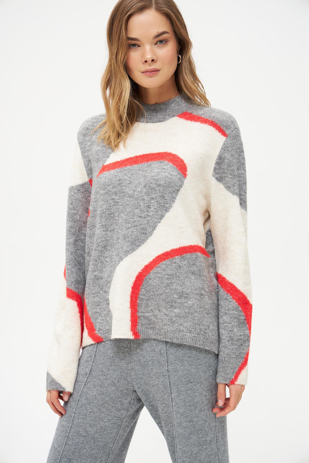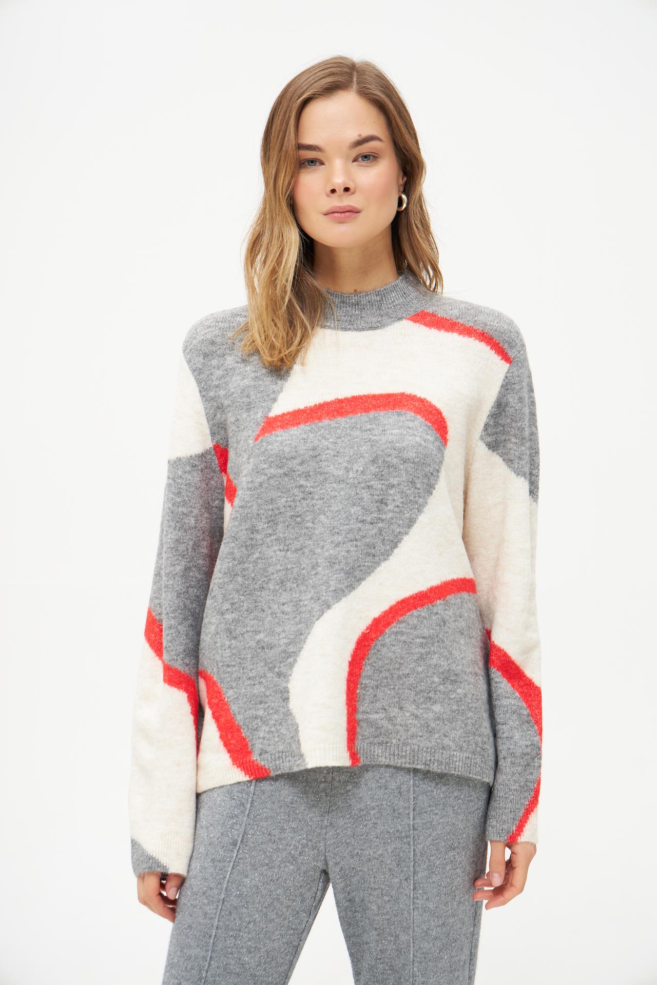 Стильный пуловер Lecomte с оригинальным геометрическим узором в серо-бежевой гамме с яркими красными акцентами. Модель с длинными рукавами и круглым вырезом горловины станет отличным дополнением к вашему повседневному гардеробу. Современный дизайн и комфортная посадка делают этот пуловер идеальным выбором для создания расслабленных, но выразительных образов. Высококачественная смесовая ткань обеспечивает приятные тактильные ощущения и долговечность изделия.