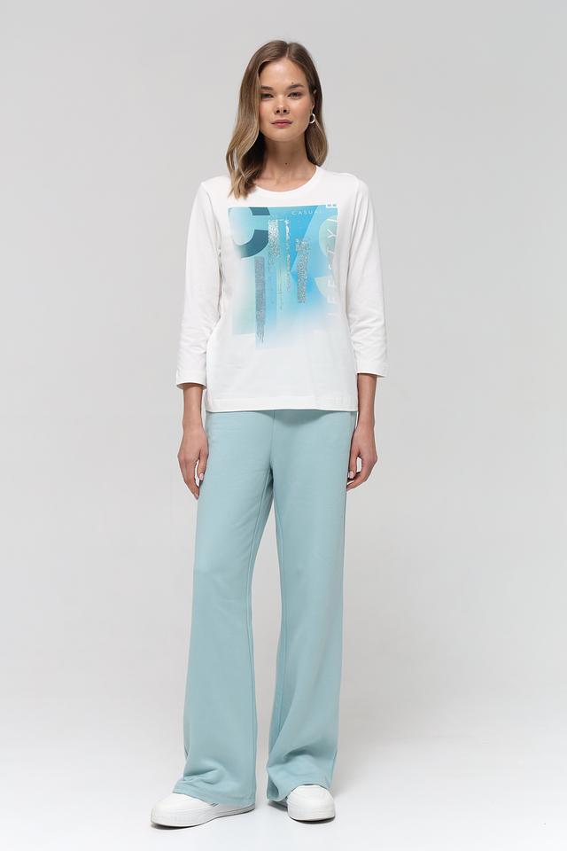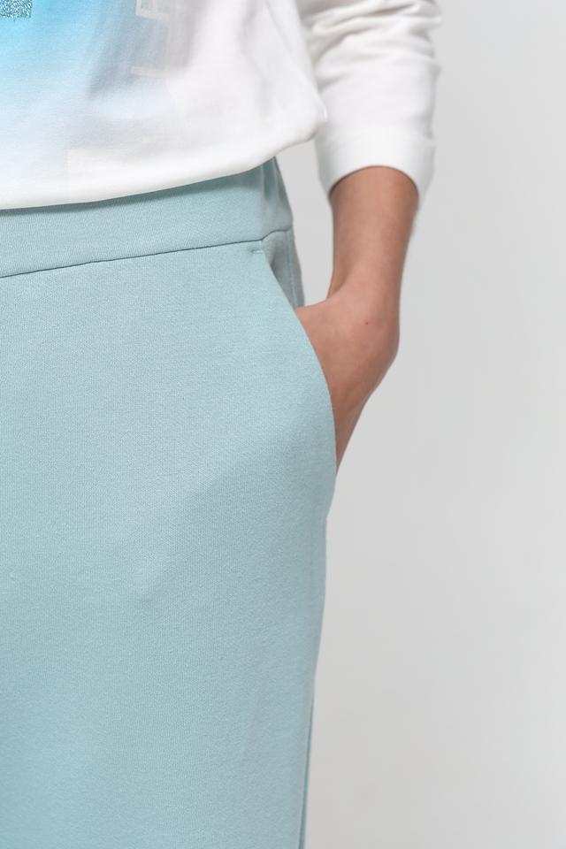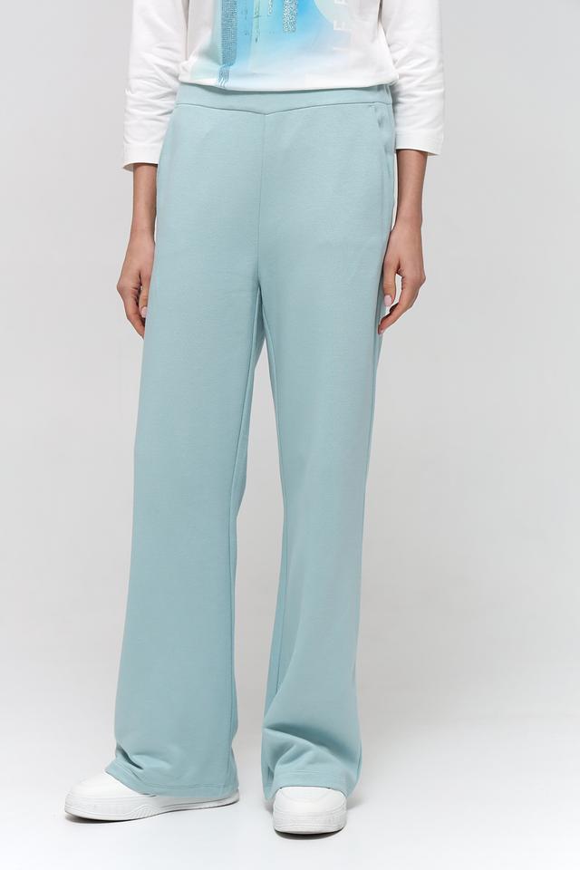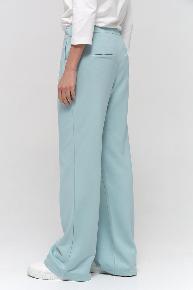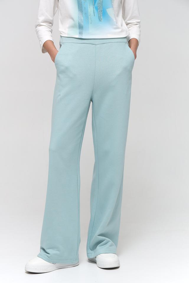 Брюки имеют прямой, слегка расклешенный крой, который визуально удлиняет ноги и создает элегантный силуэт. Эластичный пояс обеспечивает комфортную посадку по фигуре, а боковые карманы добавляют функциональности.