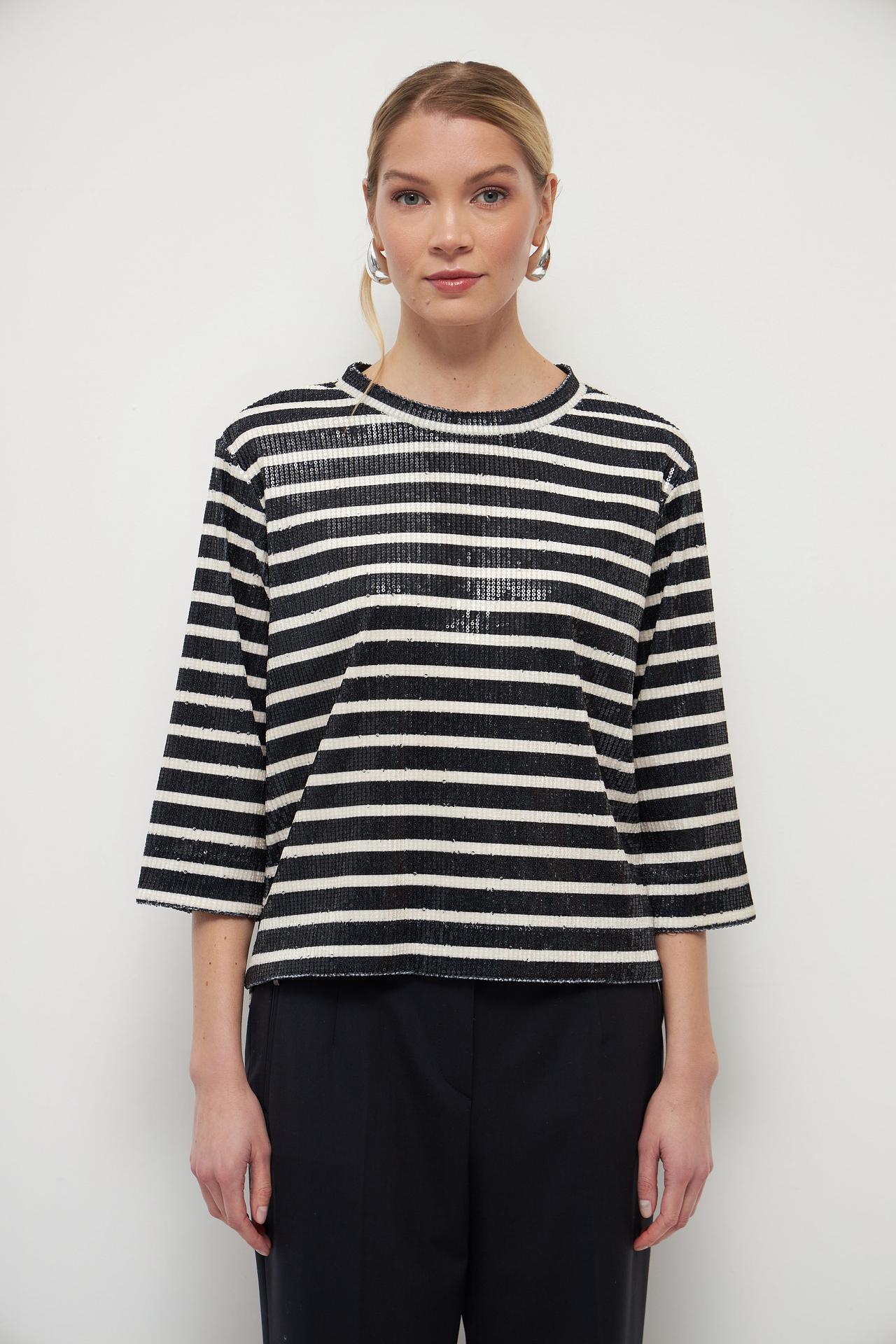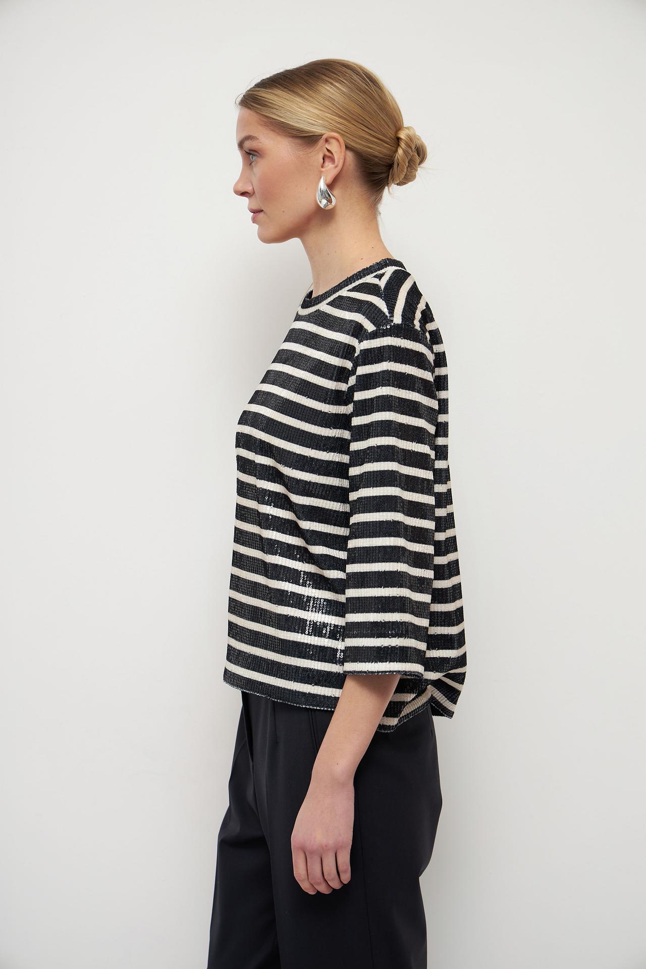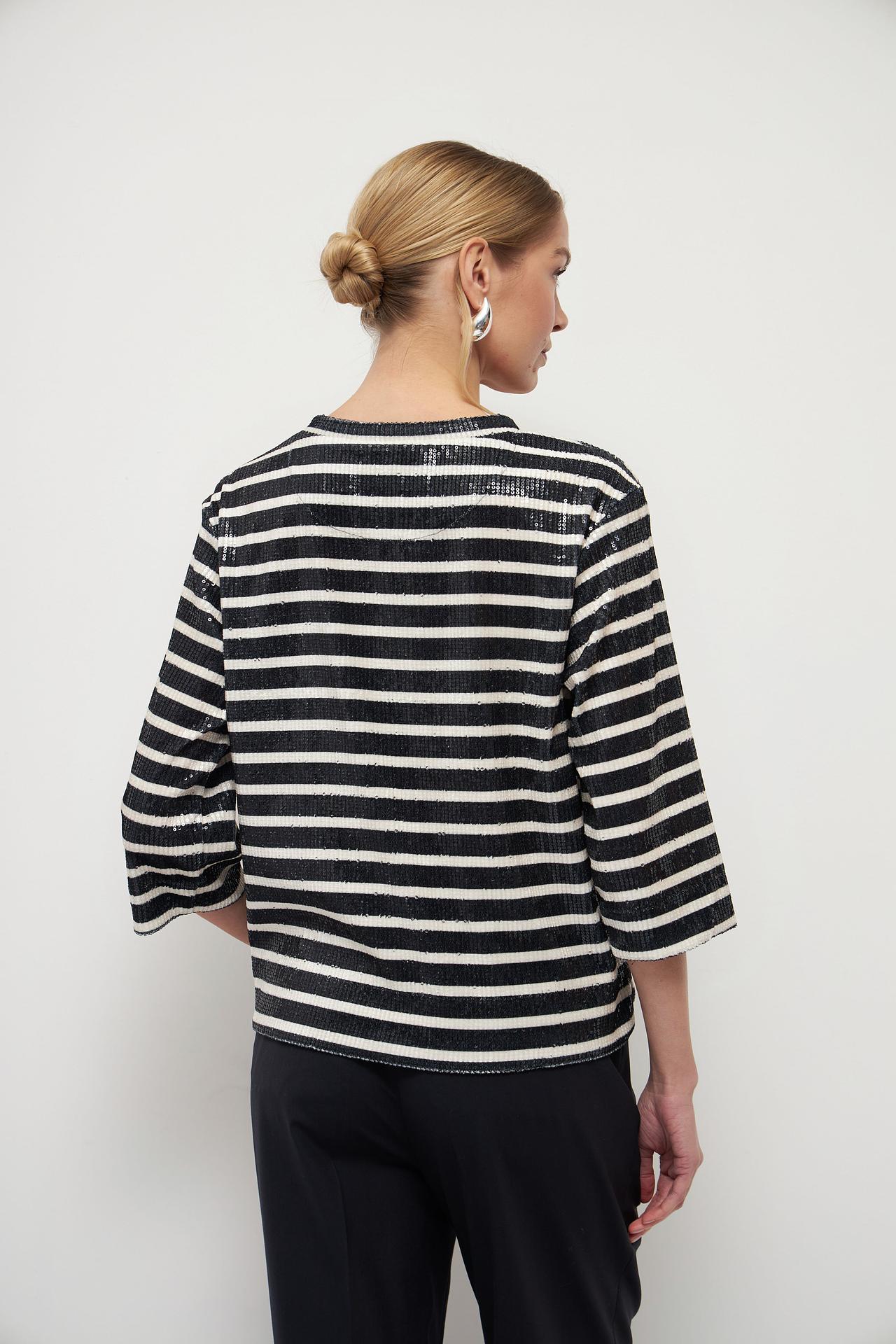 - Дизайн: Оригинальный пуловер в черно-белую полоску, украшенный переливающимися пайетками, которые придают изделию праздничный вид.