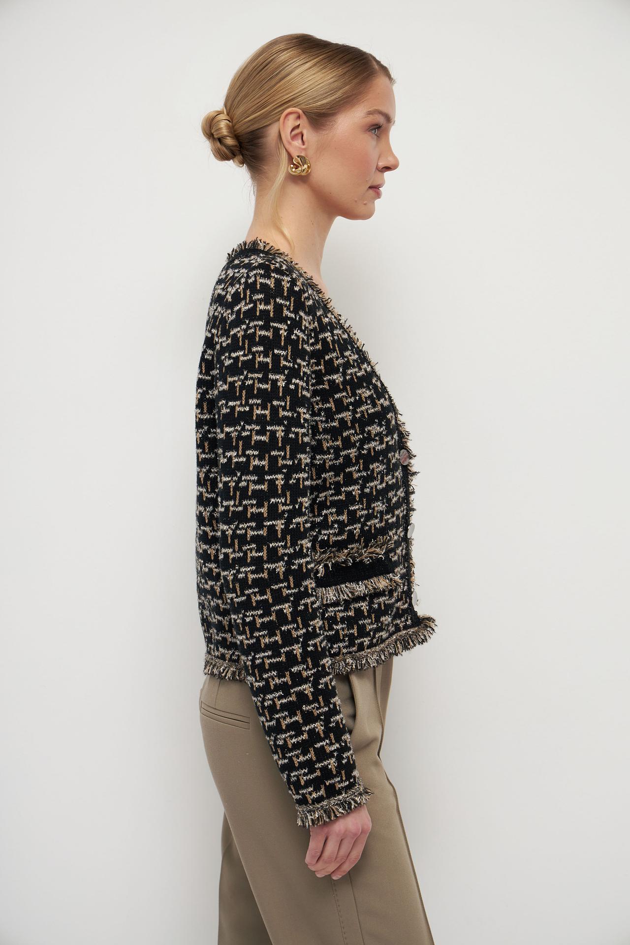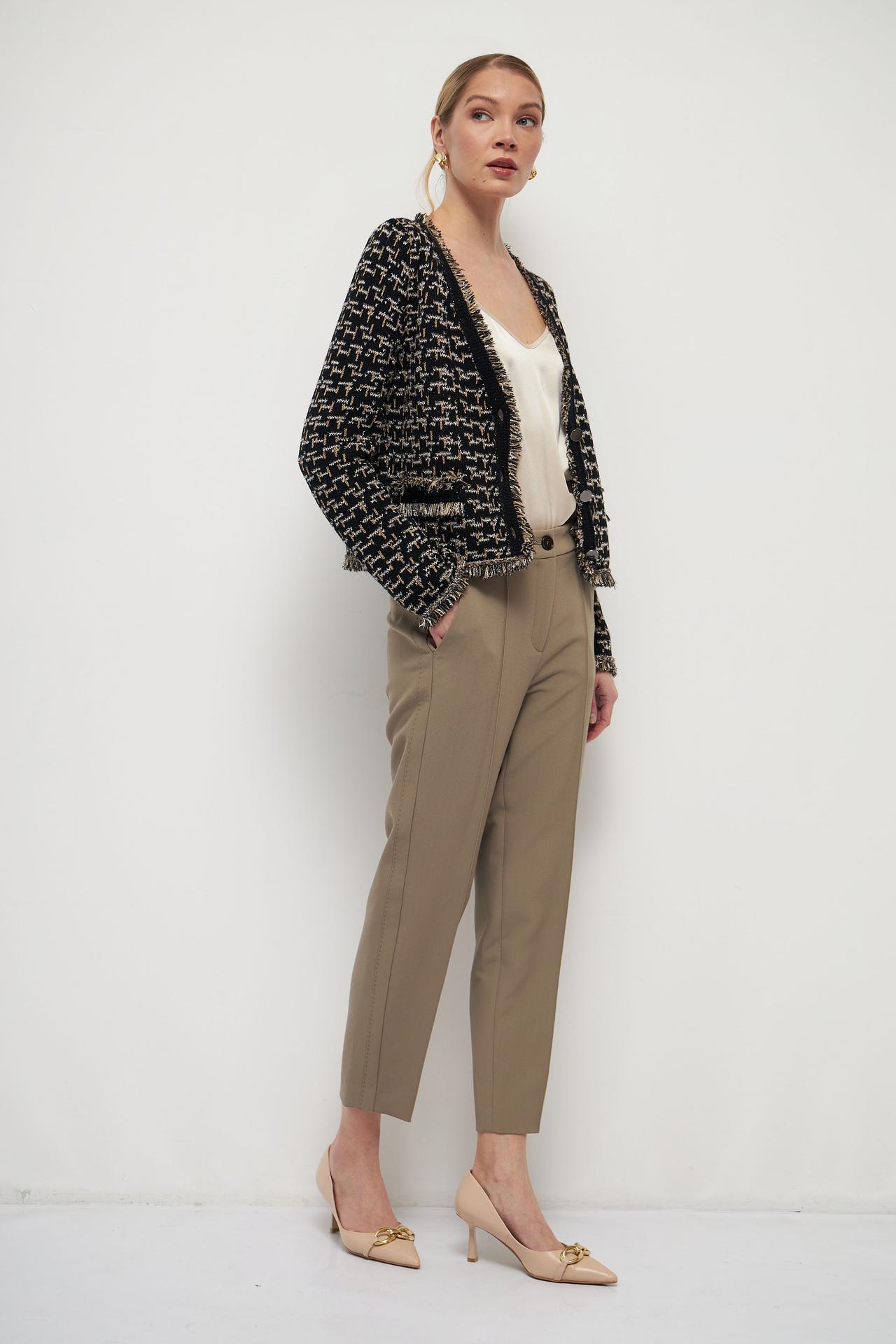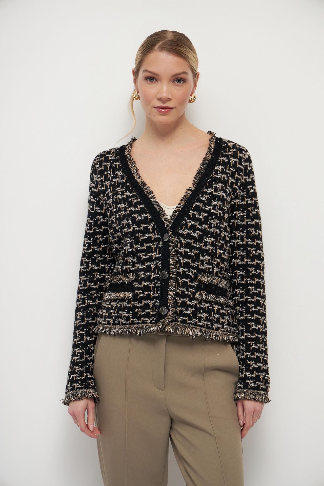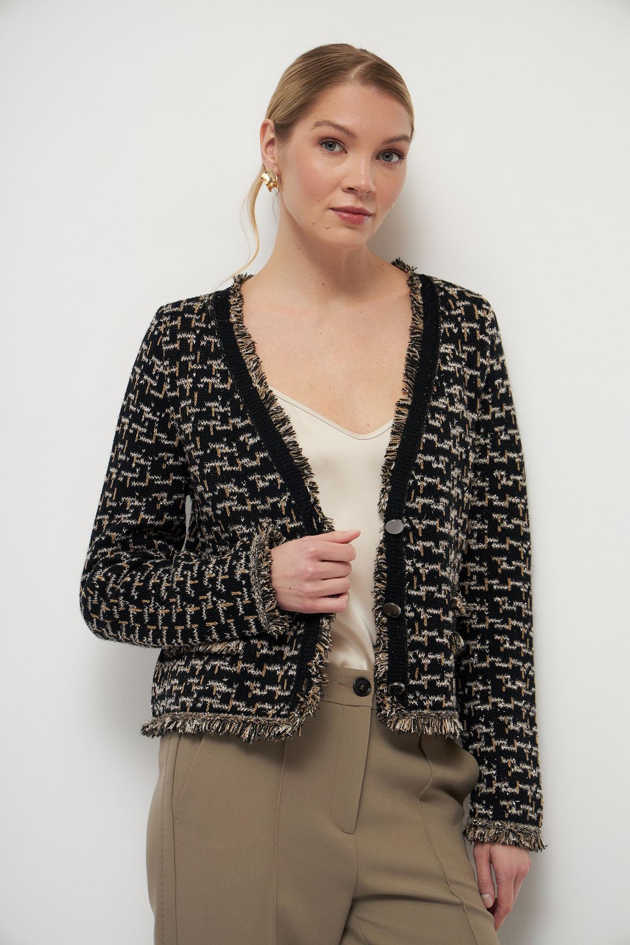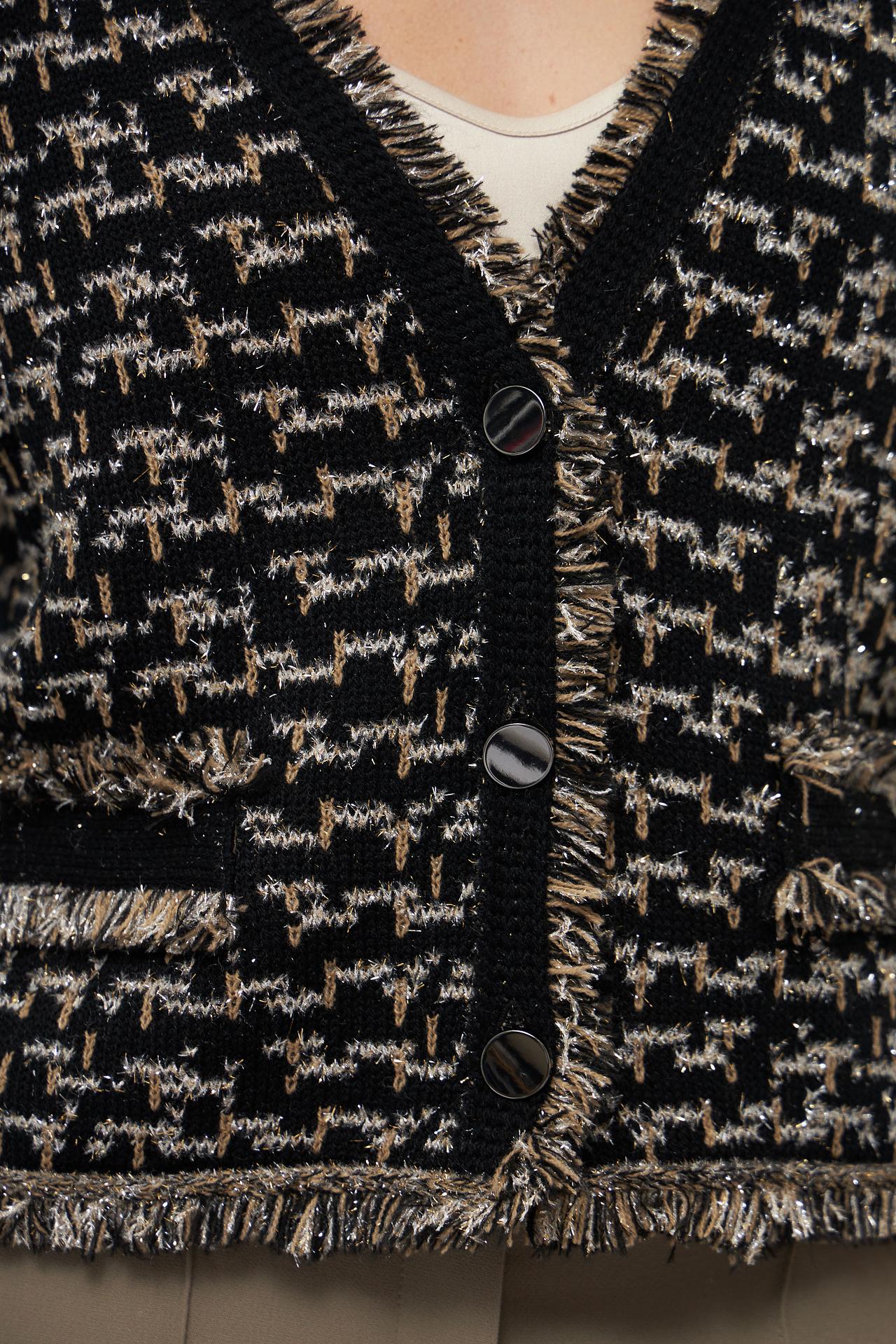 - Дизайн: Жакет выполнен в классическом стиле с V-образным вырезом и застежкой на пуговицы. Декоративная бахрома по краям придает изделию особый шарм и изысканность.