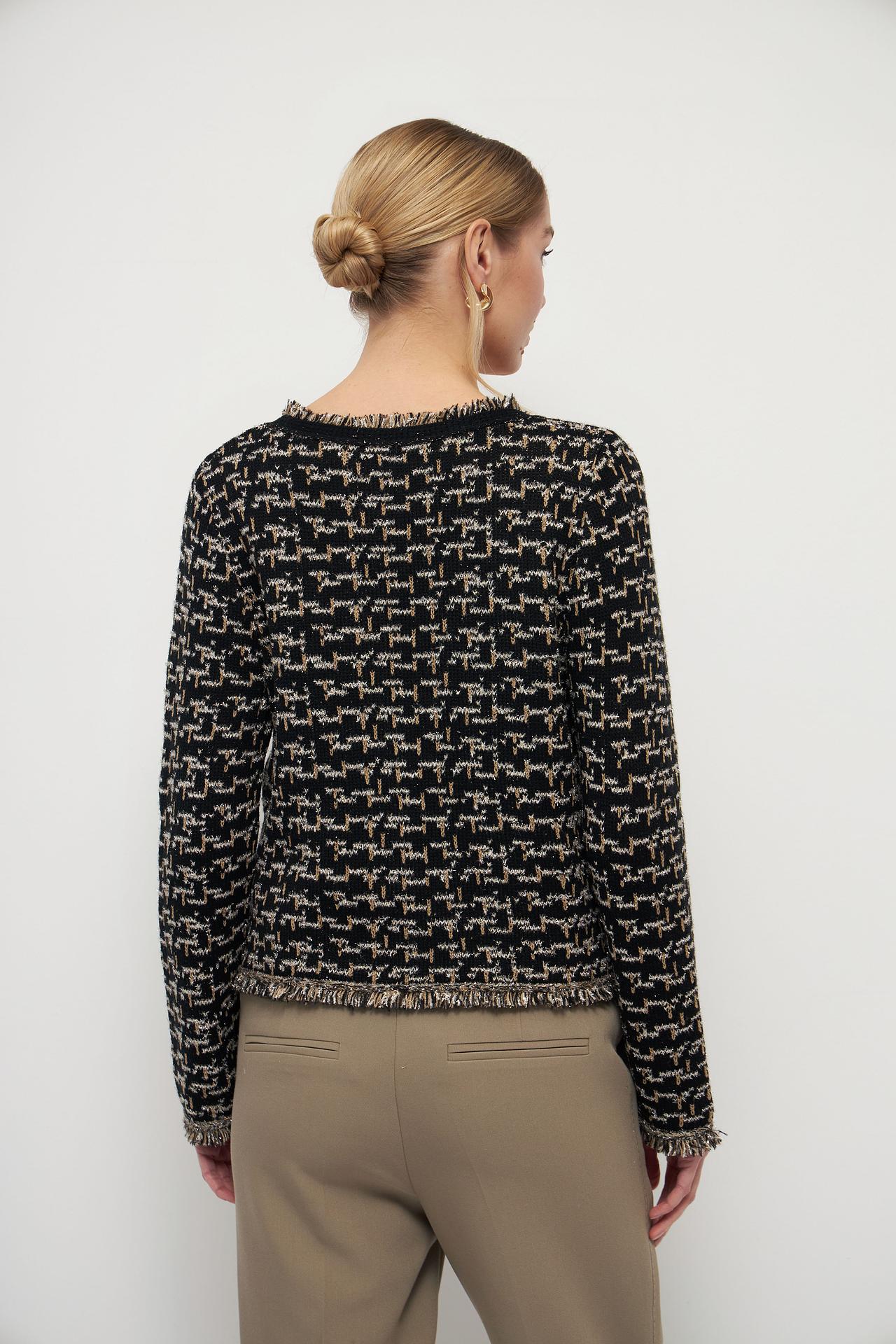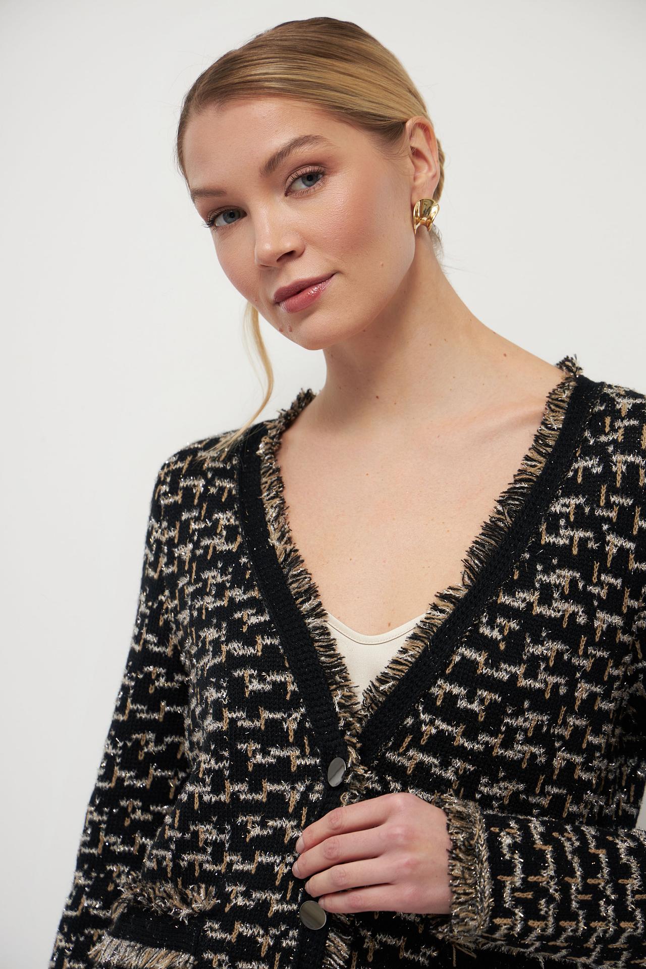 - Цвет: Насыщенный черный цвет с вкраплениями золотистой метализированной нити создает эффектный контраст и придает жакету роскошный вид.
