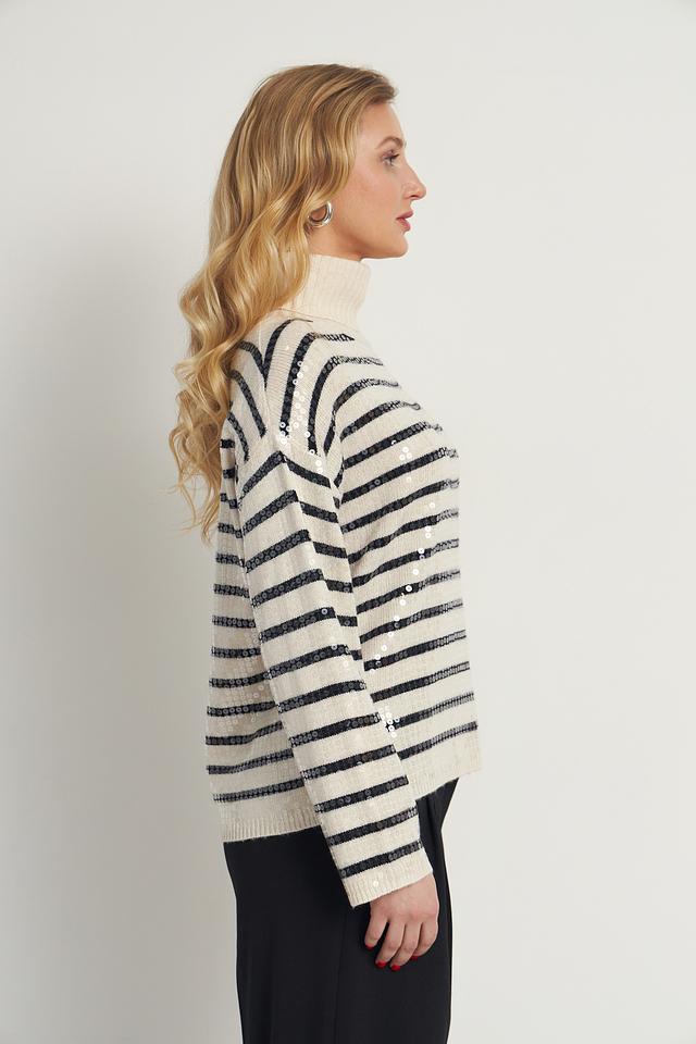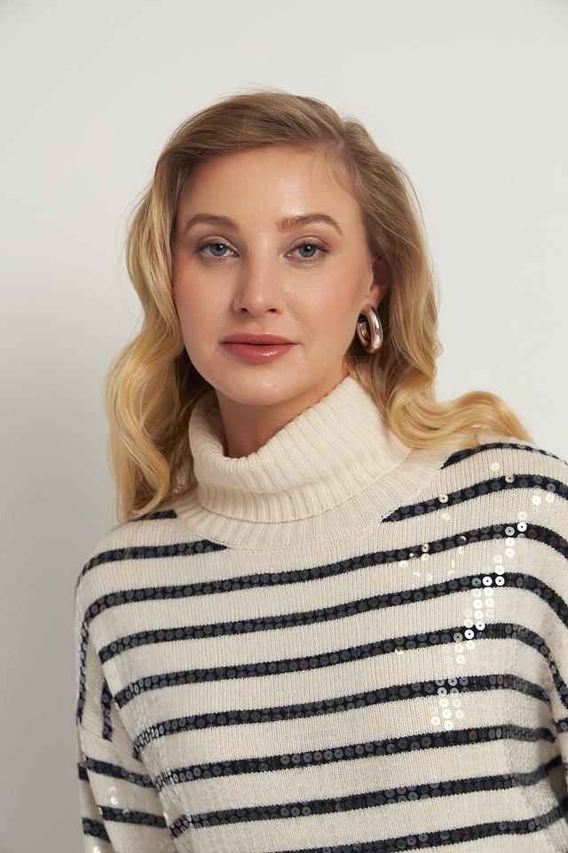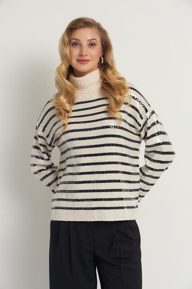 Бежевый пуловер Lecomte с полосками – стильная и комфортная модель с высоким горлом. Изготовлен из сочетания вискозы, шерсти и полиамида, что обеспечивает мягкость и приятные тактильные ощущения. Состав: вискоза 40%, шерсть 30%, полиамид 30%