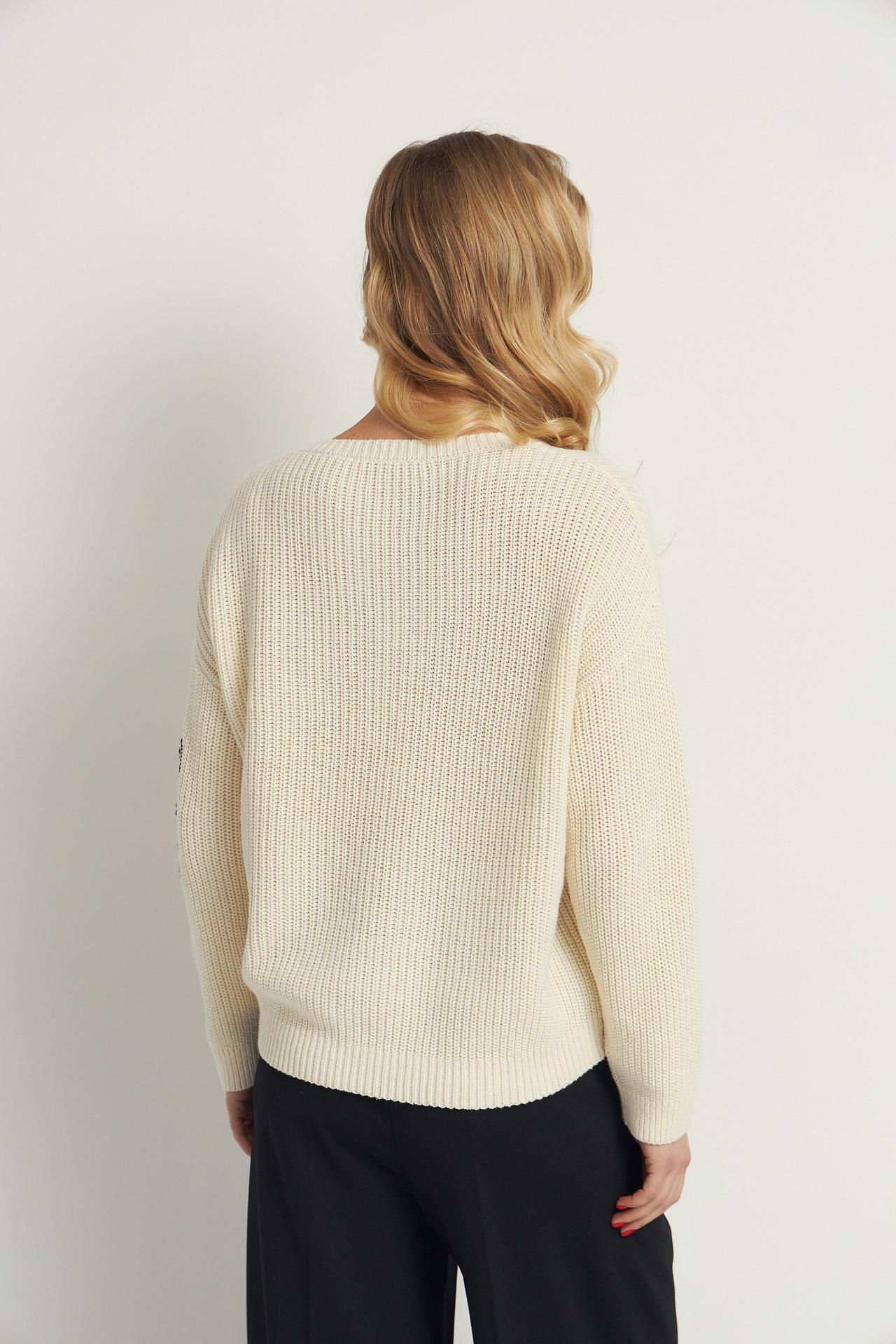 - Уникальный дизайн: Контрастный черный цветочный орнамент на бежевом фоне делает этот свитер ярким акцентом в гардеробе, подчеркивая индивидуальность его обладательницы.