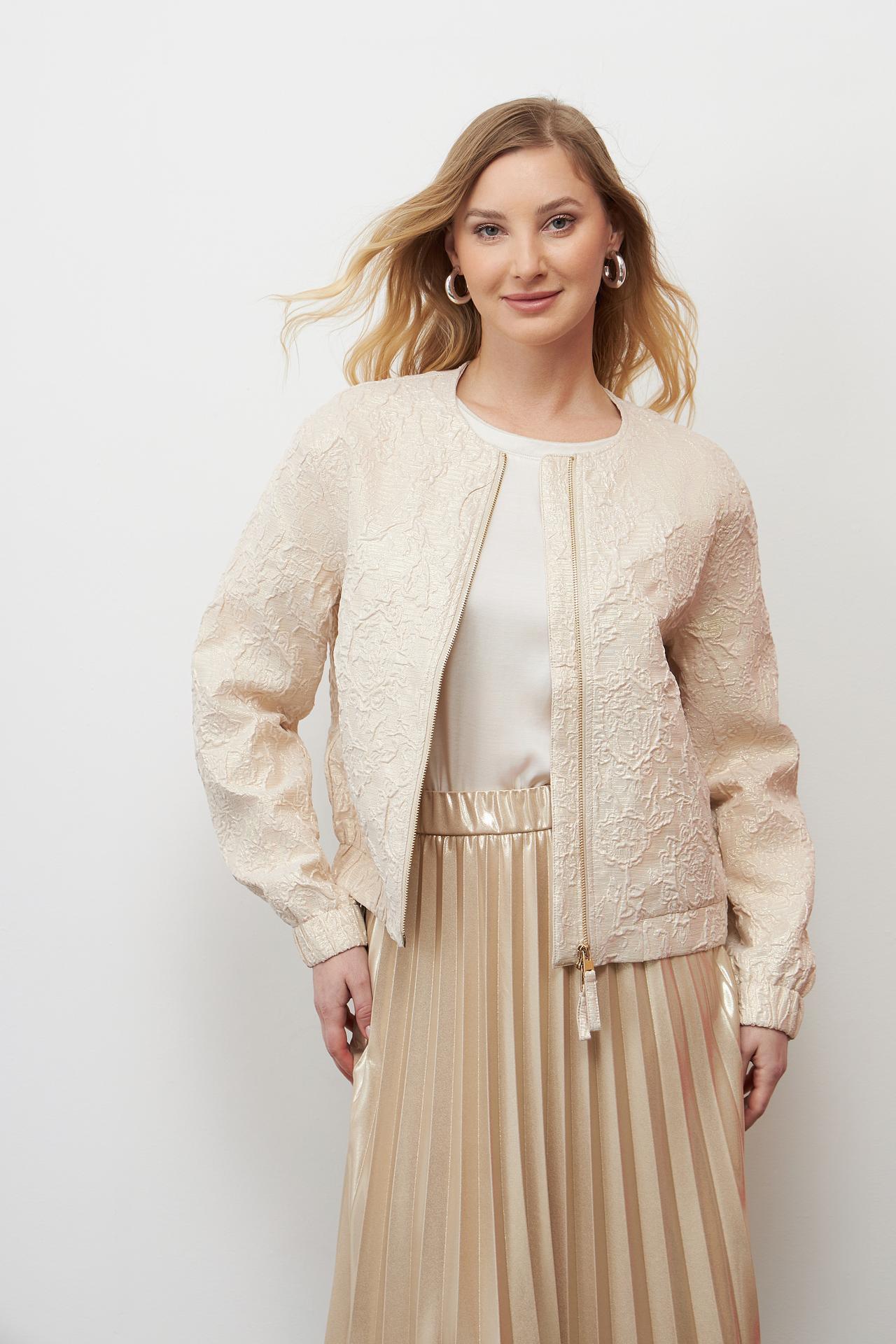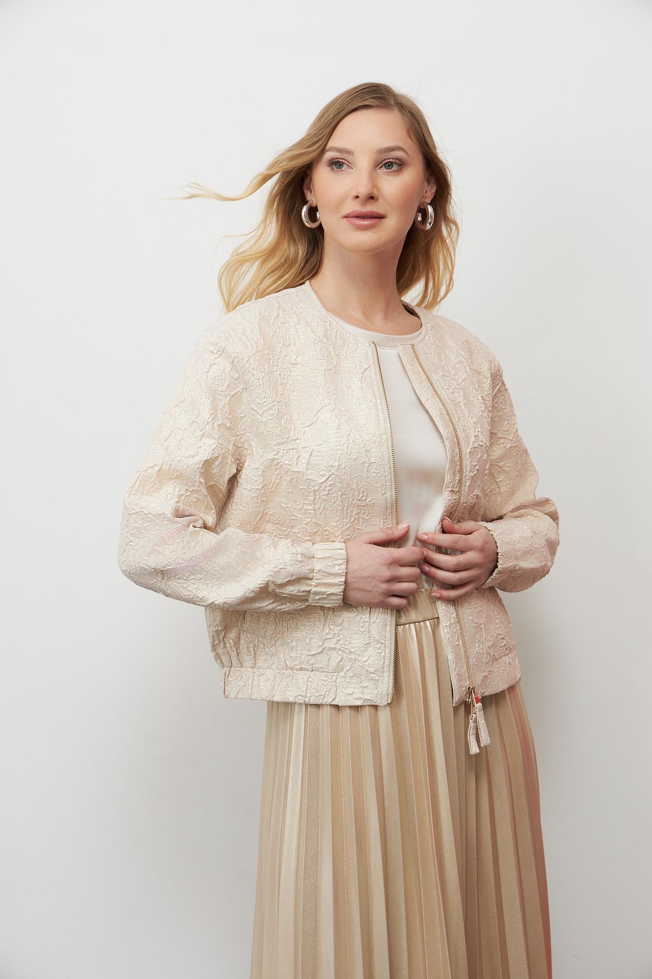 - Изысканная фактура: Ткань жакета украшена объемным узором, который придает изделию роскошный вид. Вплетение металлизированной нити создает деликатное мерцание, добавляя образу шика и индивидуальности.