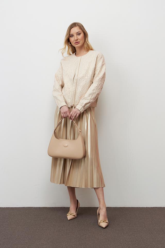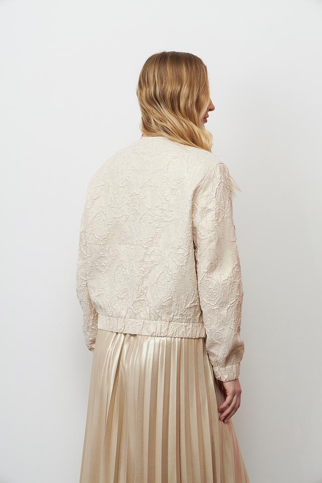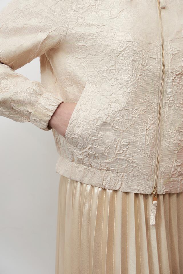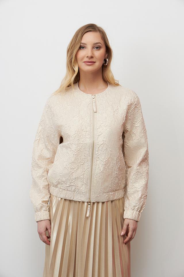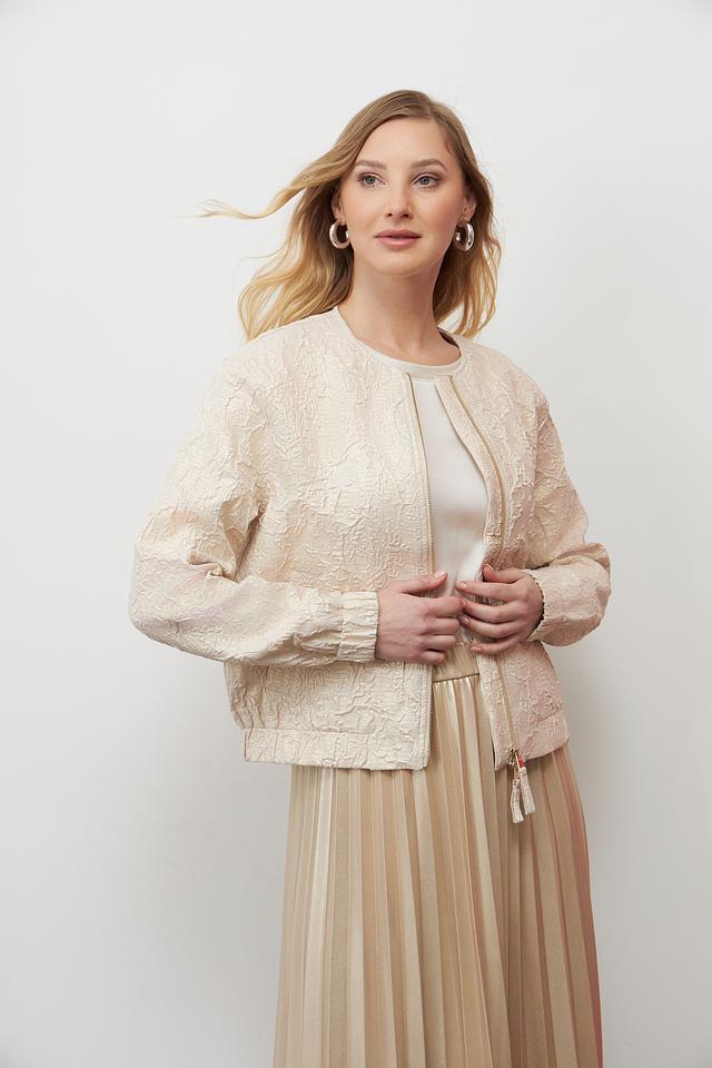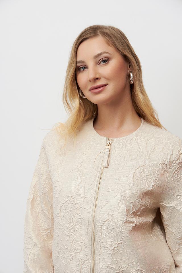 Жакет имеет короткий крой и застегивается на молнию. Длинные рукава дополнены манжетами. Модель идеально сочетается с юбками, брюками и платьями, позволяя создавать разнообразные образы.