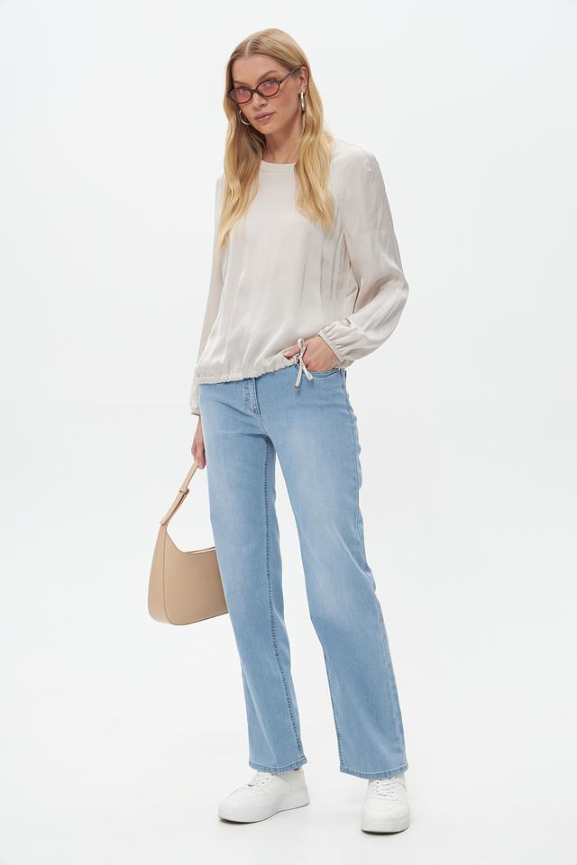 Блузка имеет классический крой с длинными рукавами, манжеты которых оформлены кулиской и завязками, что позволяет регулировать их ширину и создавать различные образы. Сборка по низу изделия придает блузке женственный и элегантный вид. Завязки на талии позволяют подчеркнуть силуэт и создать более приталенный силуэт.