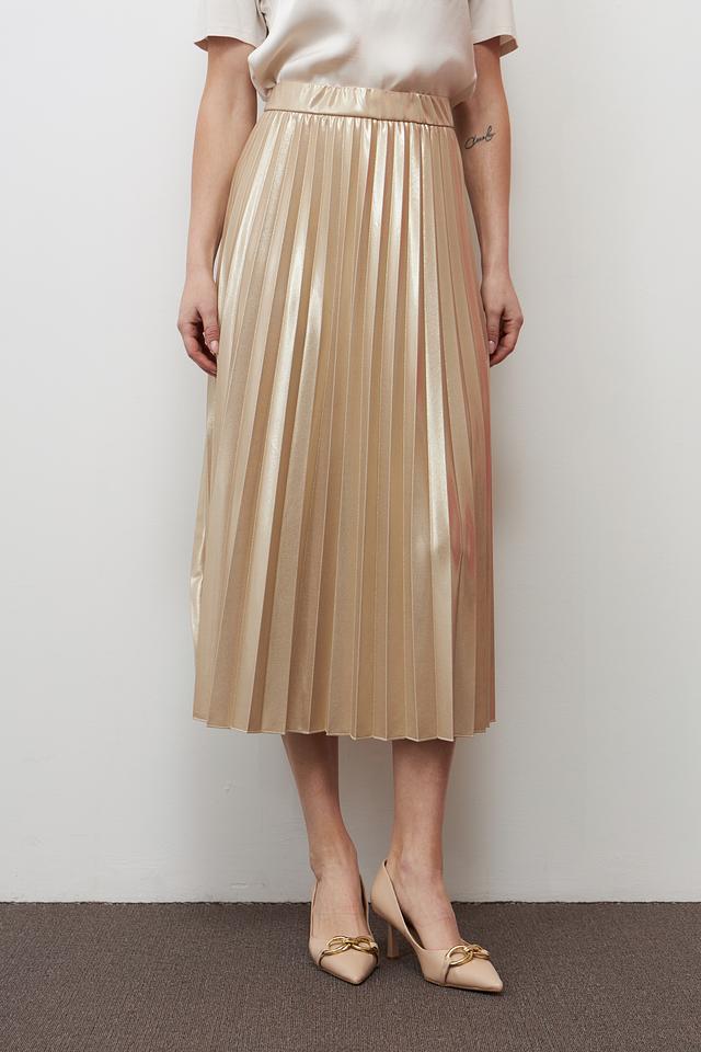 Модель имеет классическую плиссированную фактуру и длину миди, что делает ее универсальной для различных случаев. Удобная эластичная талия обеспечивает комфортную посадку по фигуре.