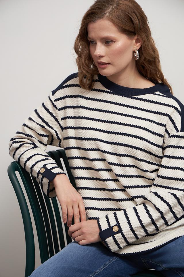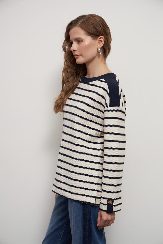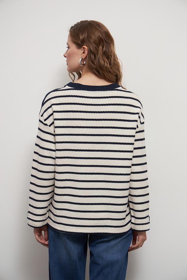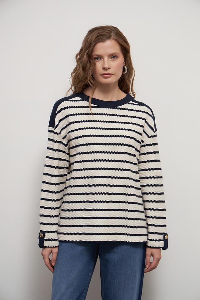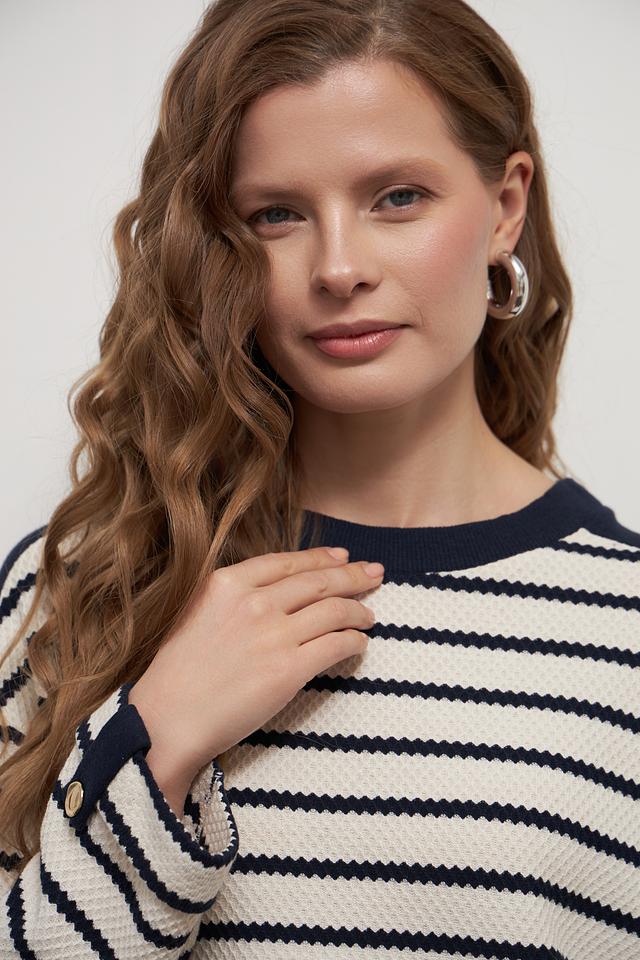 Дизайн пуловера выполнен в классическом стиле – бело-синяя полоска, которая никогда не выходит из моды. Округлый вырез горловины и длинные рукава делают его универсальным для различных образов.