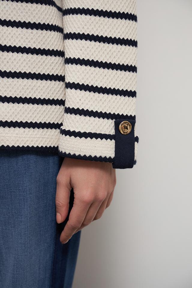 Женский пуловер Lecomte в бело-синюю полоску – это стильная и комфортная модель из хлопка с добавлением эластана. Классический крой и декор в виде пуговиц на рукавах придают изделию особый шарм. Состав: хлопок 98%, эластан 2%
