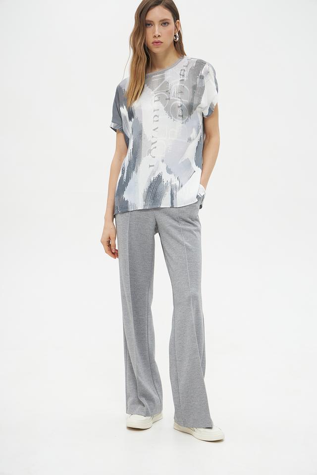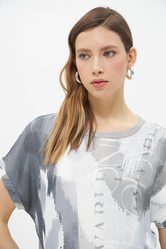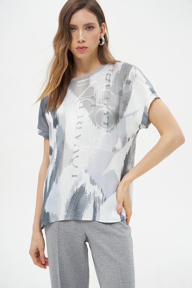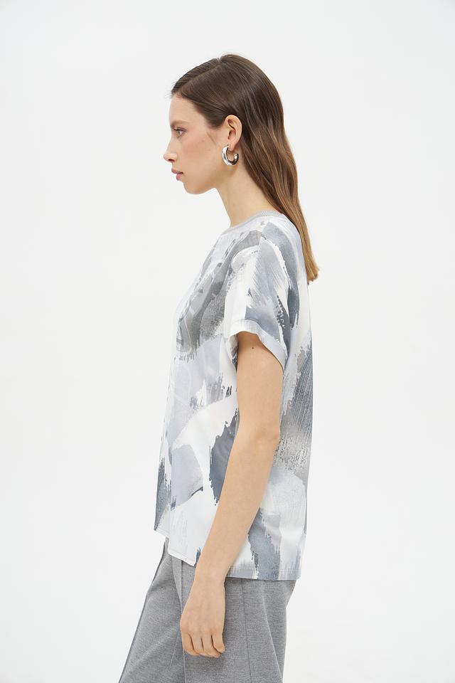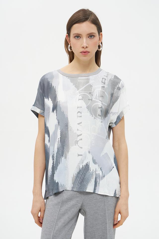 Блуза имеет свободный крой, который не сковывает движений, и короткие рукава, идеально подходящие для теплой погоды. Главной особенностью модели является яркий абстрактный принт в серых тонах, который добавит образу оригинальности и неповторимости.