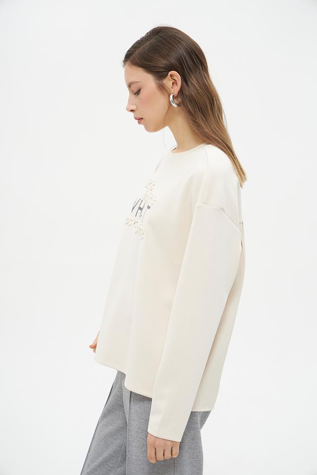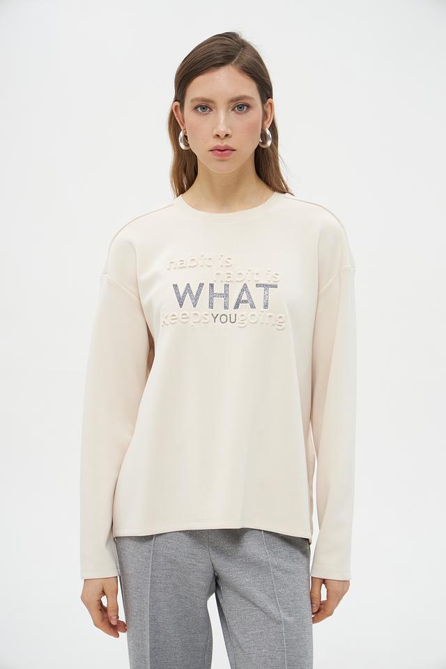 Модель имеет свободный крой, который обеспечивает комфорт и свободу движений. Передняя часть пуловера украшена ярким принтом с надписью, добавляющим образу индивидуальность.