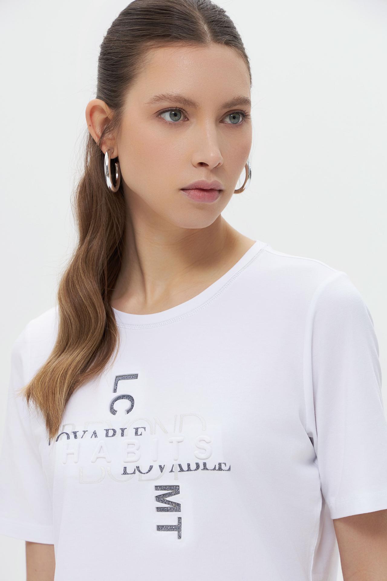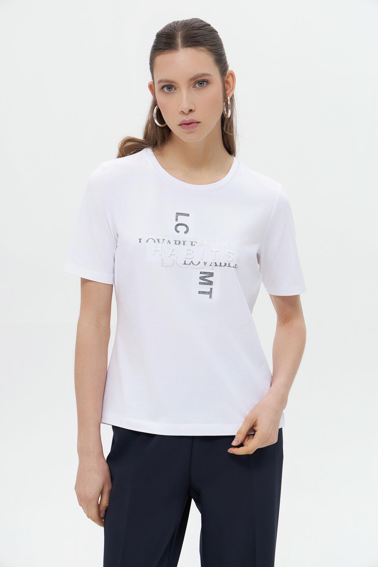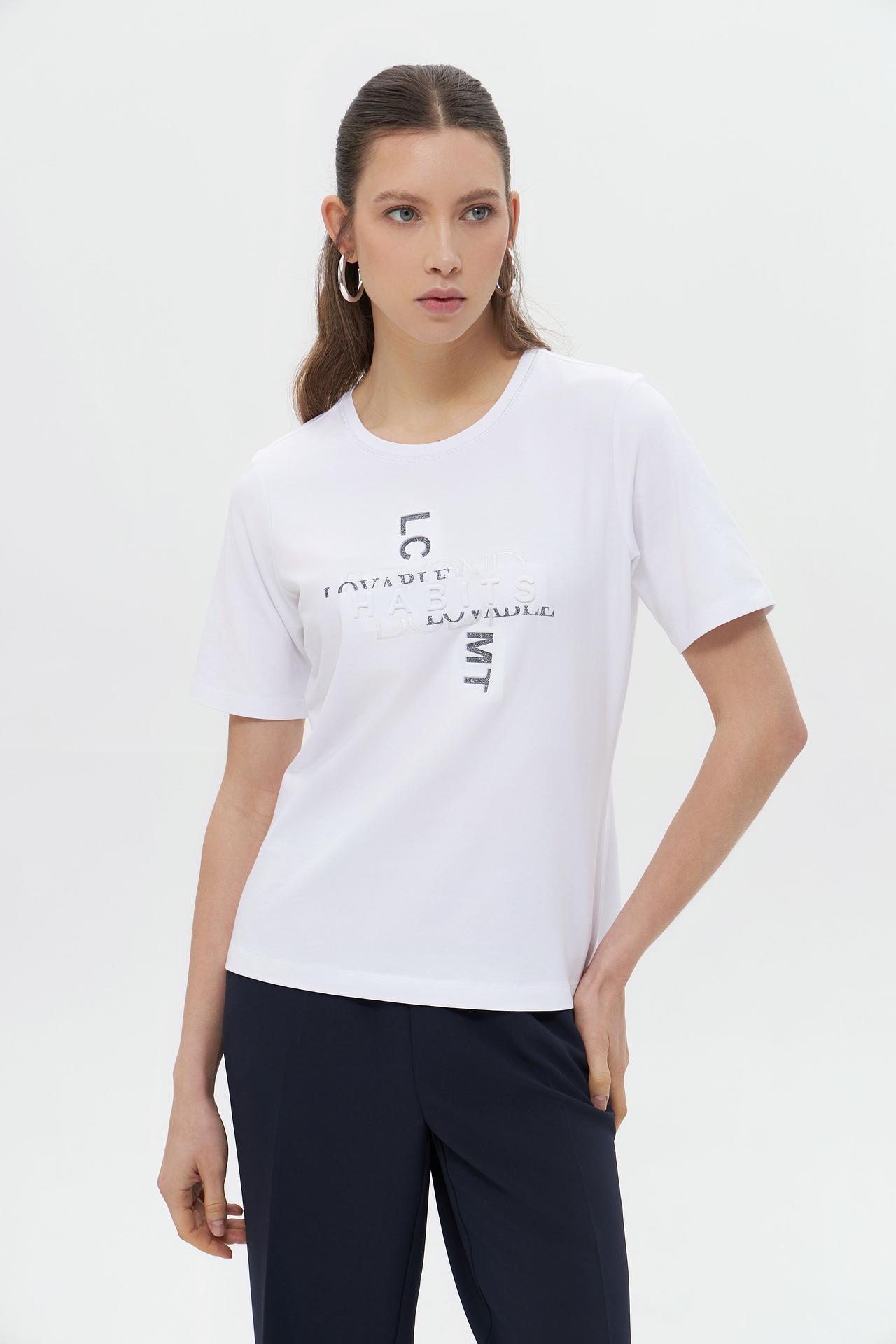 На передней части футболки расположена оригинальная надпись, добавляющая изделию изюминку и современный вид. Благодаря классическому крою и универсальному белому цвету, футболка легко сочетается с различными элементами гардероба, будь то джинсы, брюки или юбки.