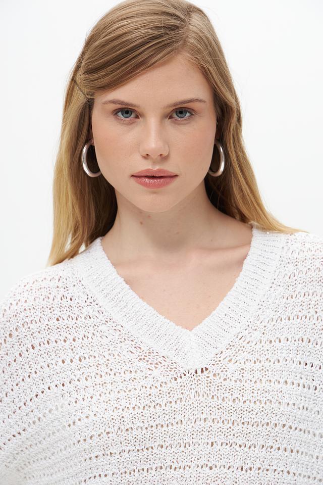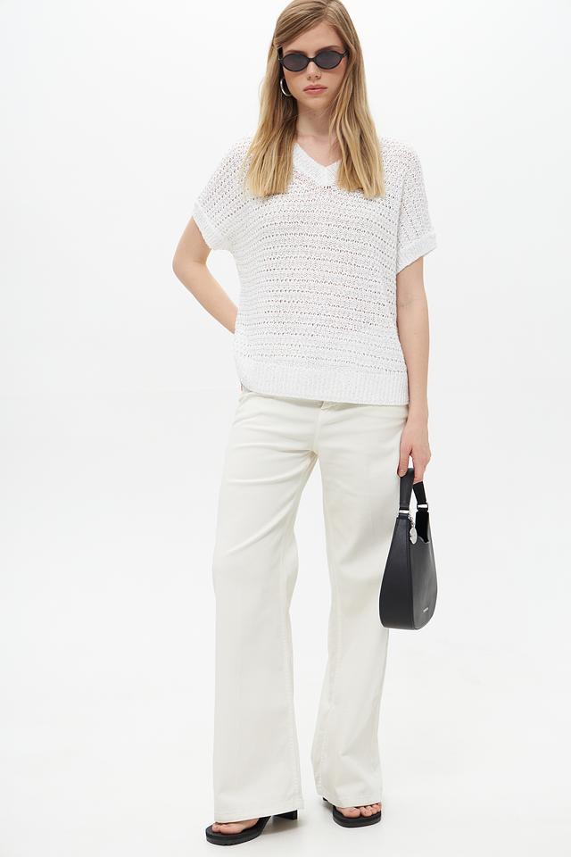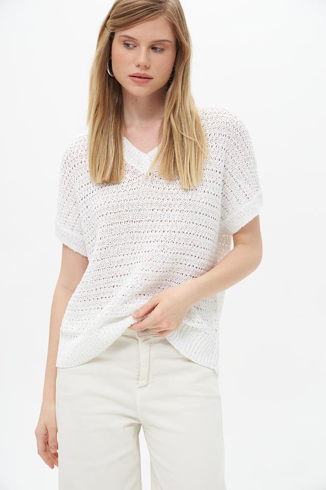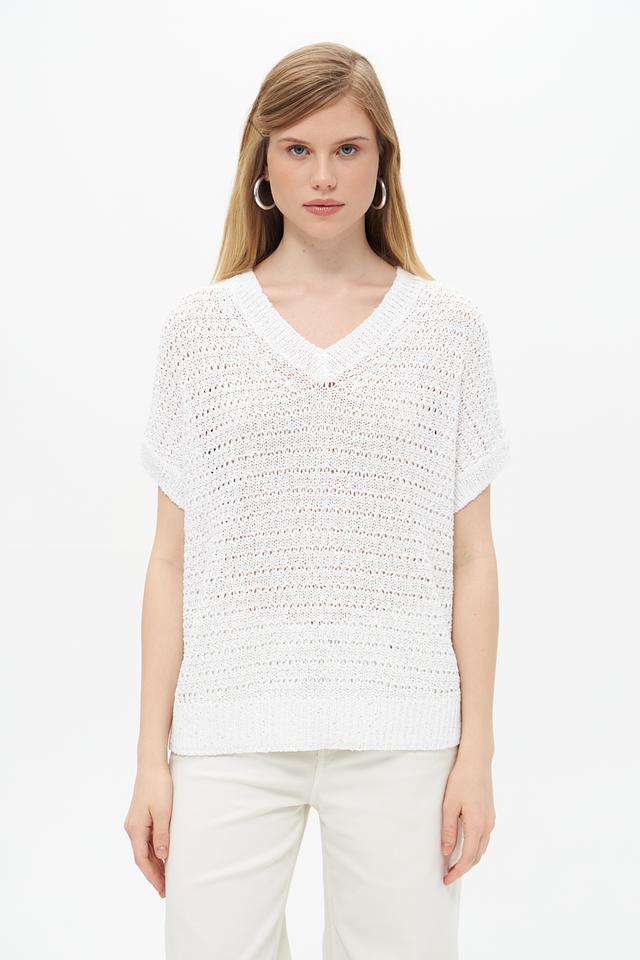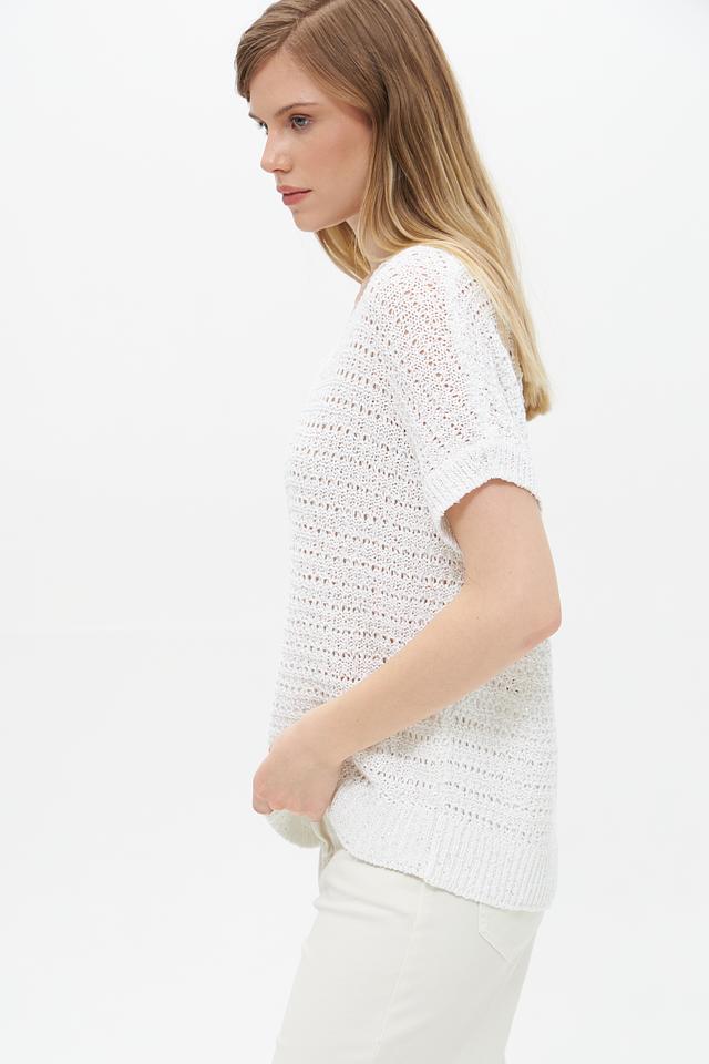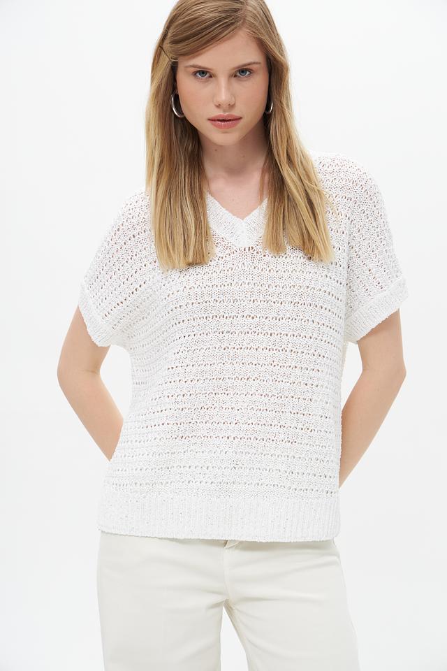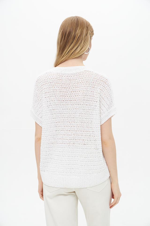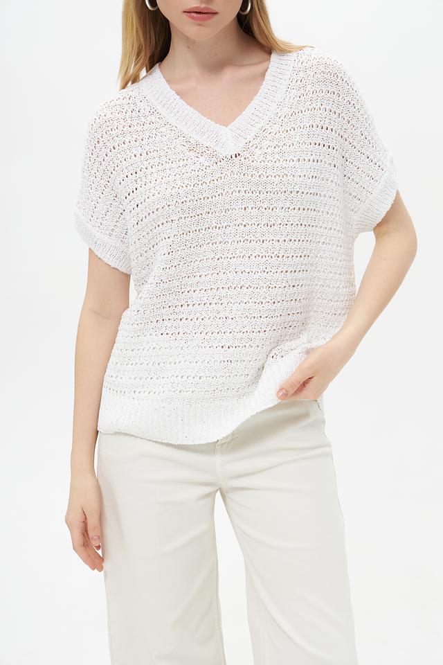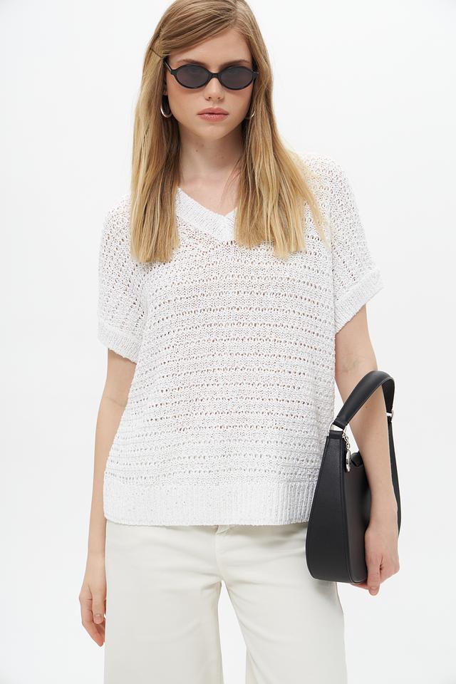 Модель имеет ажурную текстуру, которая придает ей легкость и изящество. V-образный вырез подчеркивает линию шеи, а короткие рукава делают пуловер идеальным для теплой погоды.