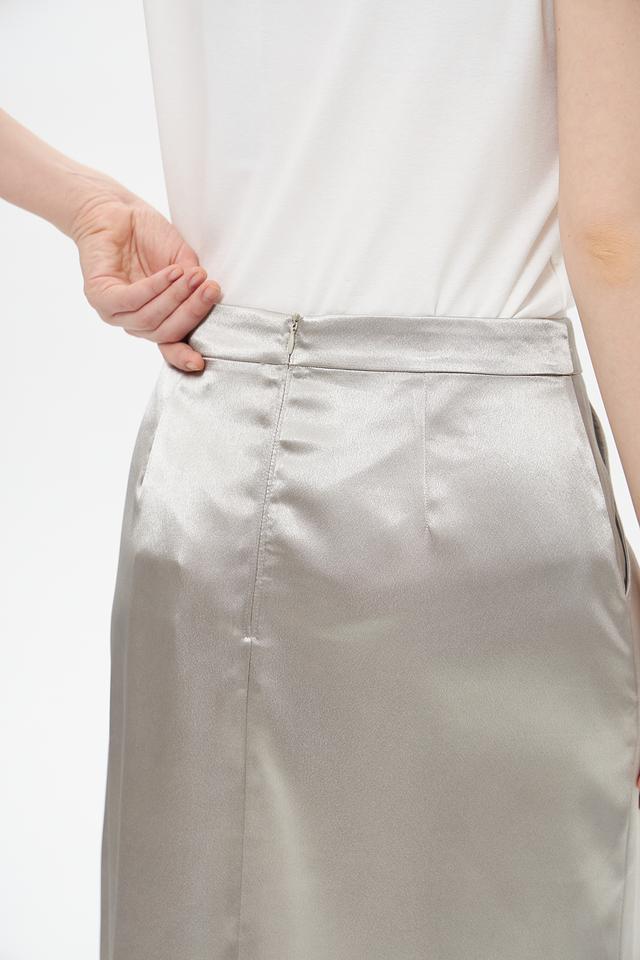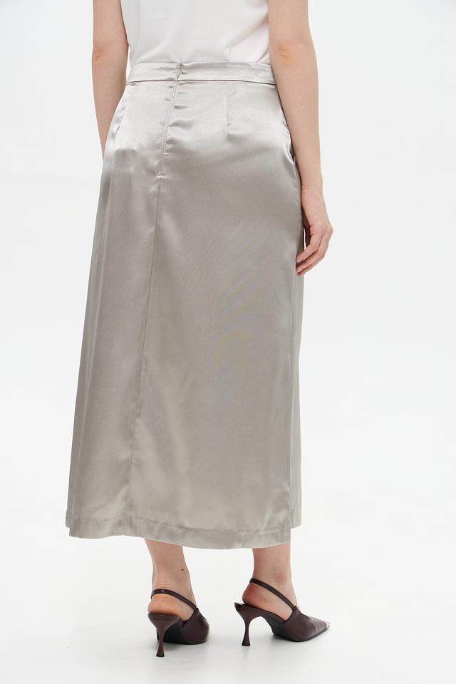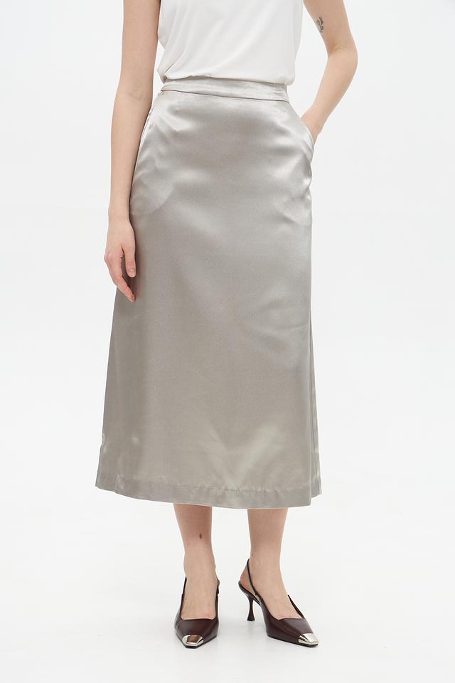 Юбка имеет прямой крой и длину миди, что делает её универсальной и подходящей для различных случаев. Атласная ткань придает изделию элегантный и изысканный вид.