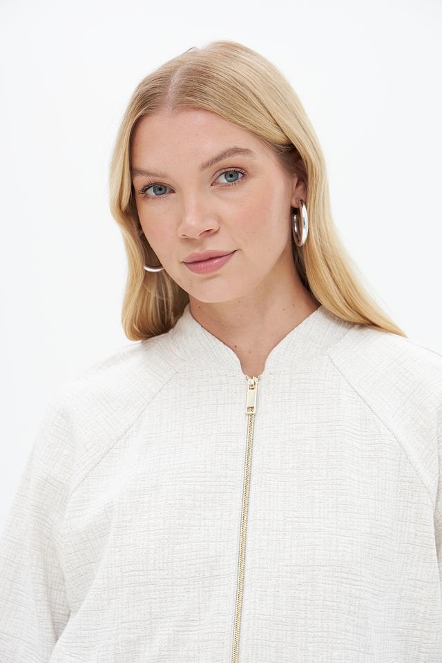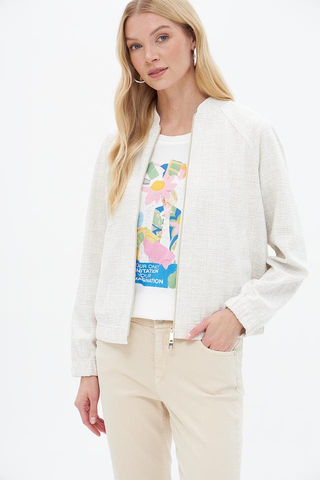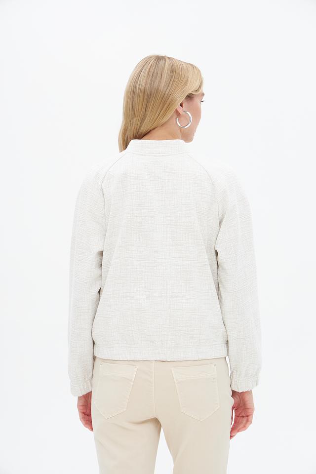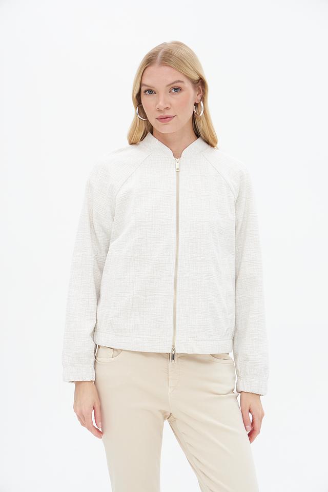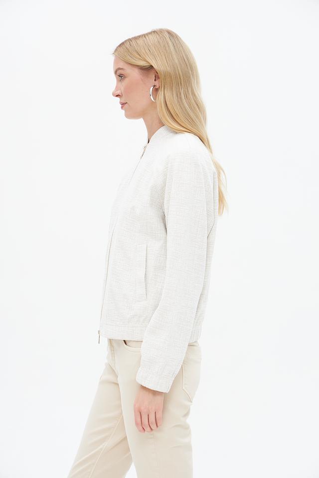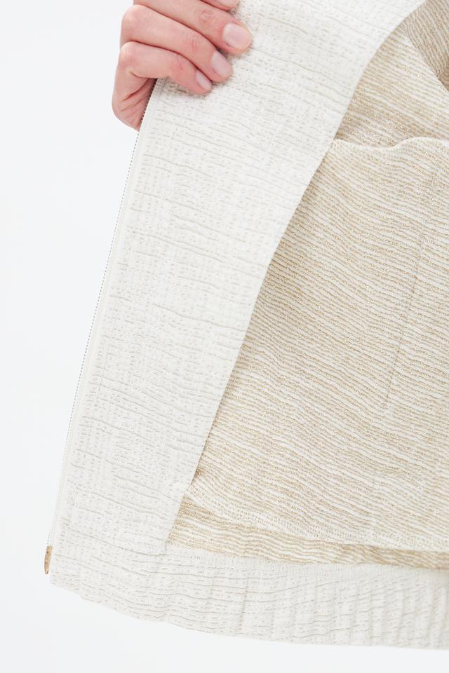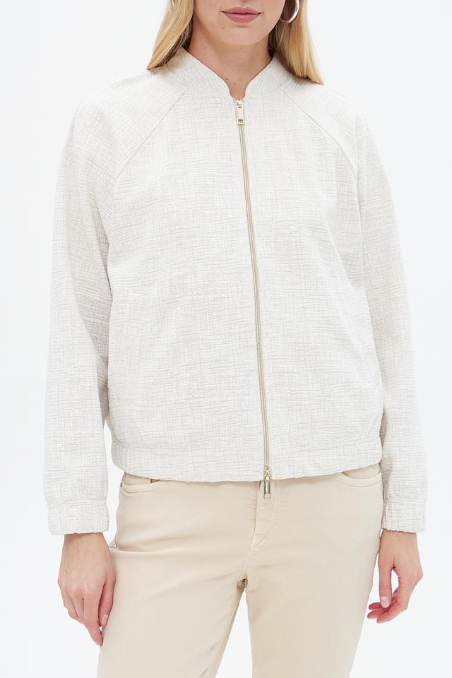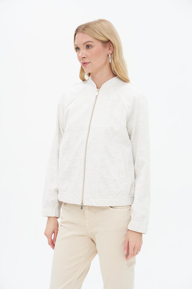 Жакет имеет текстурированную поверхность, что придает ему изысканный вид. Застежка на молнию позволяет легко надевать и снимать изделие, а воротник-стойка добавляет современности.
