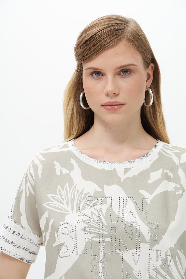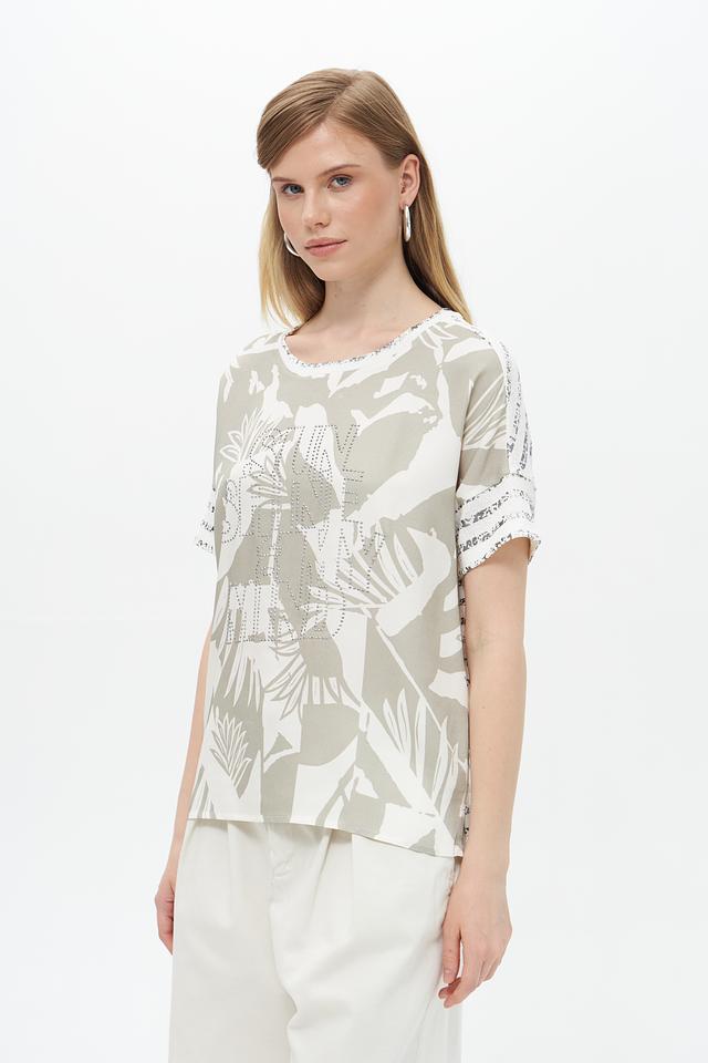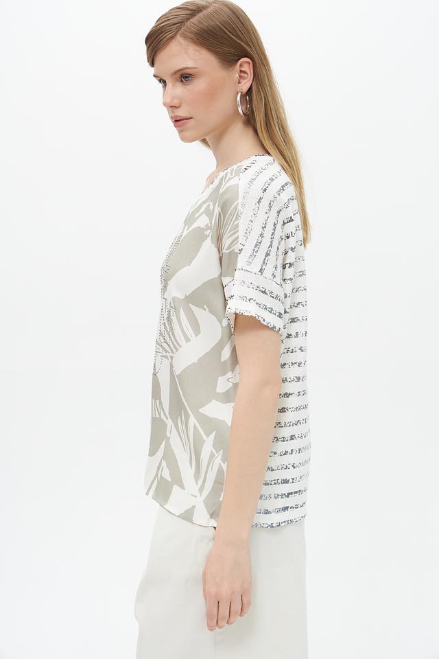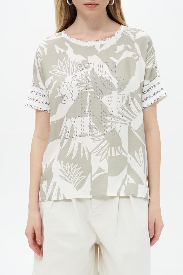 Модель имеет свободный крой, который не сковывает движений и обеспечивает максимальный комфорт. Короткие рукава делают блузу подходящей для тёплой погоды. Круглый вырез горловины лаконично дополняет дизайн.