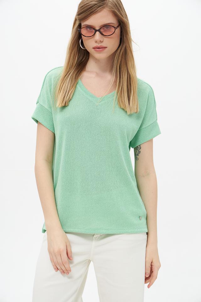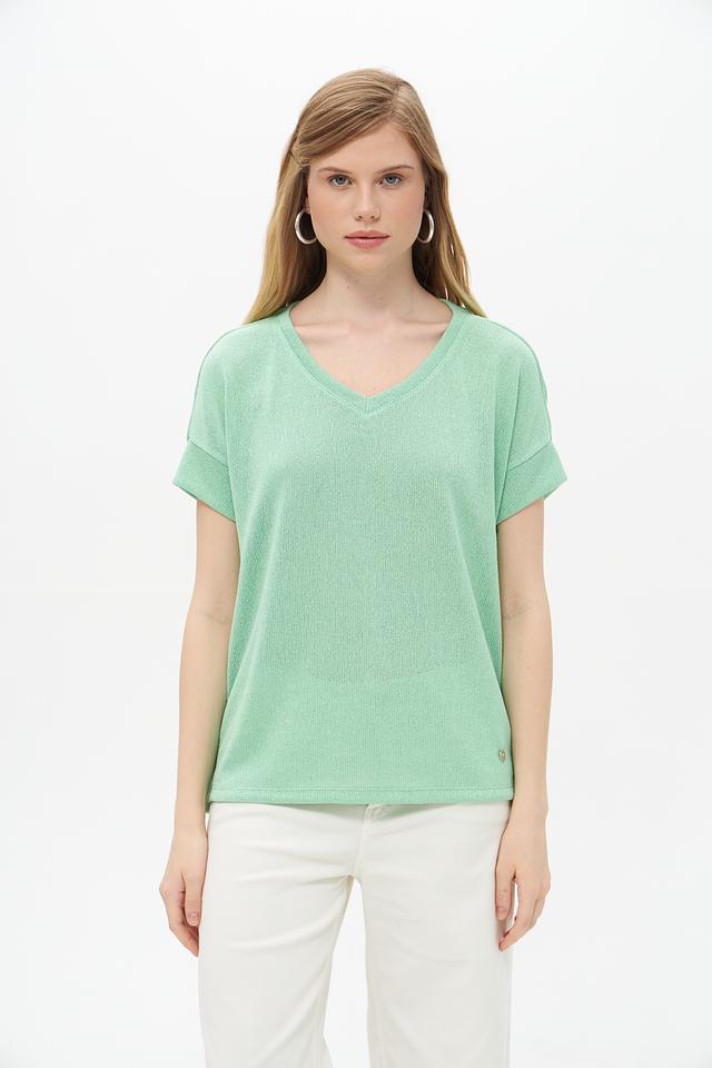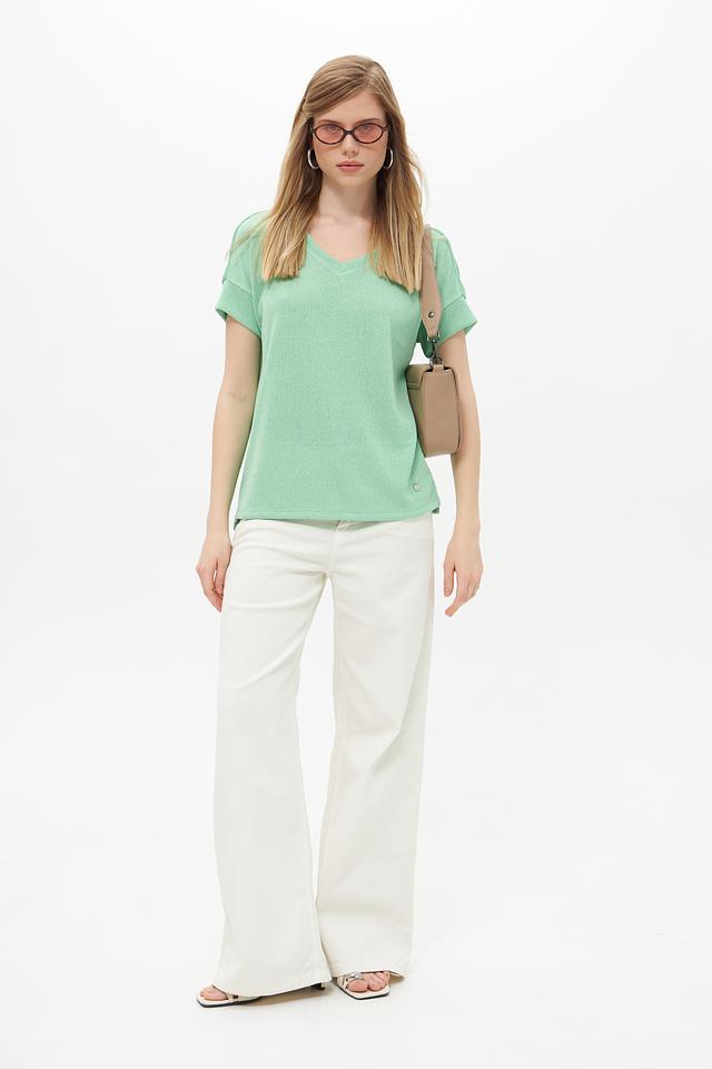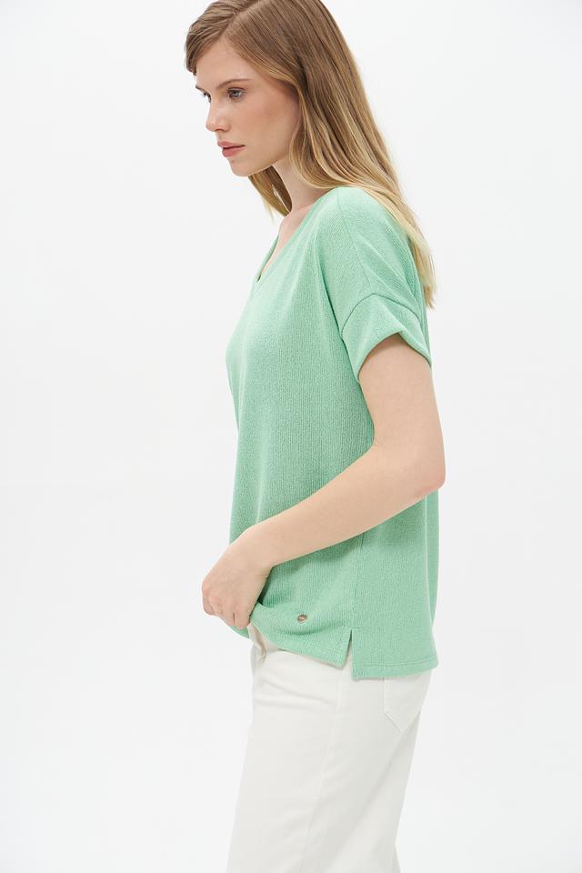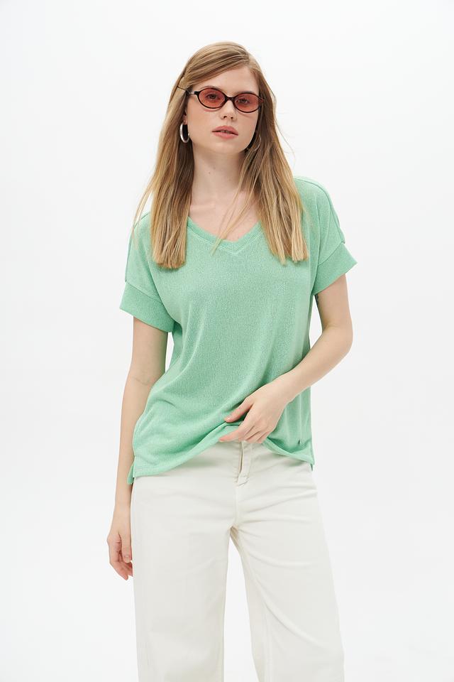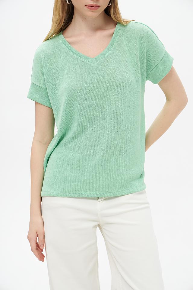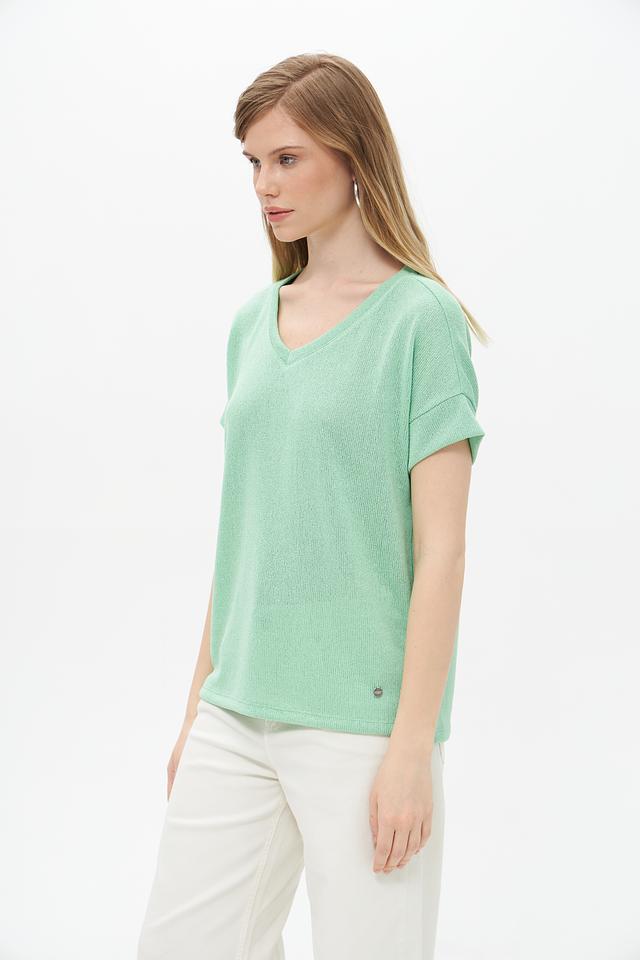 Пуловер имеет V-образный вырез и короткие рукава, что делает его идеальным для тёплой погоды. Текстура ткани слегка фактурная, что добавляет изделию изысканности.