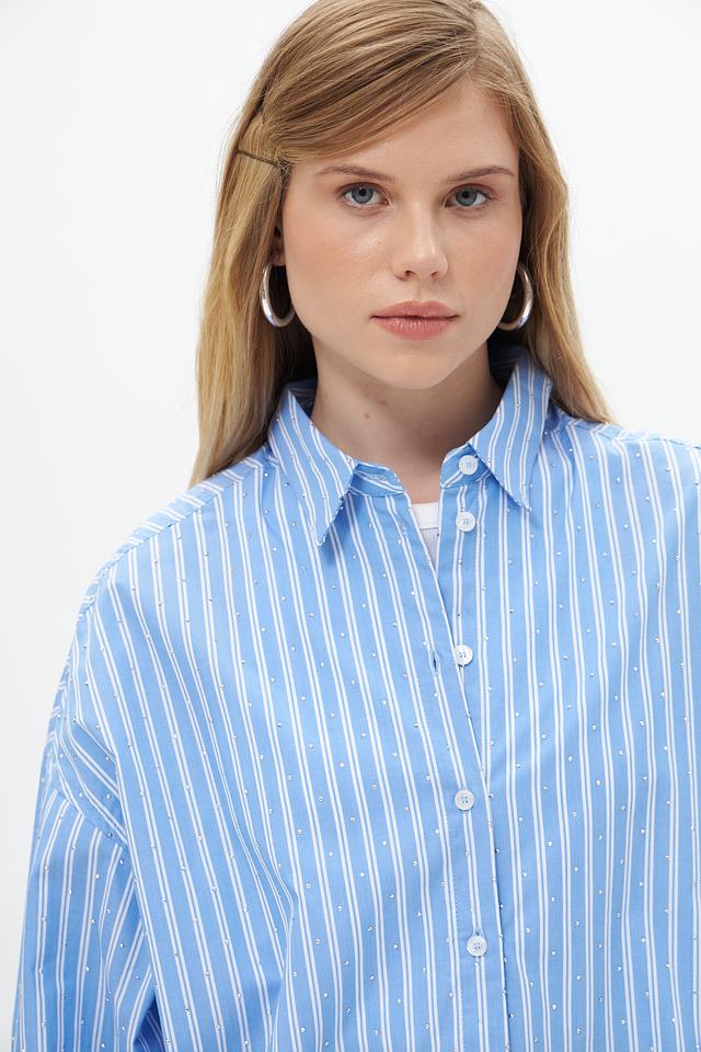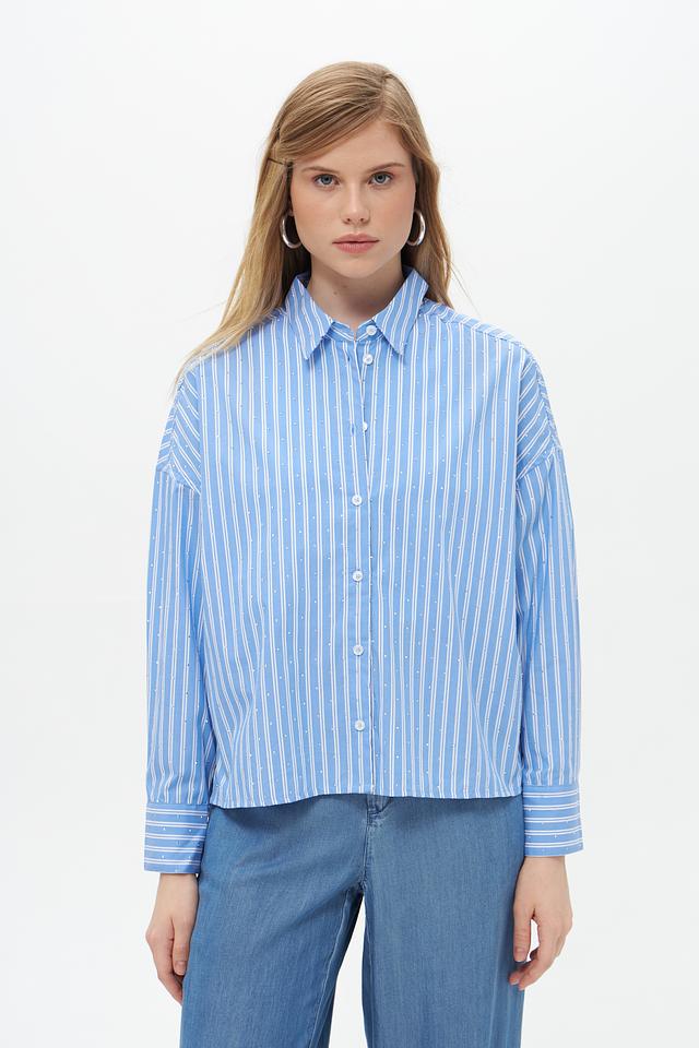 Женская блузка от бренда Lecomte выполнена в светло-голубую полоску. Модель с длинными рукавами 3/4, воротником и застежкой на пуговицы по всей длине.