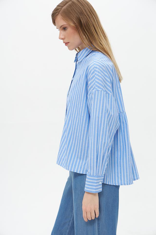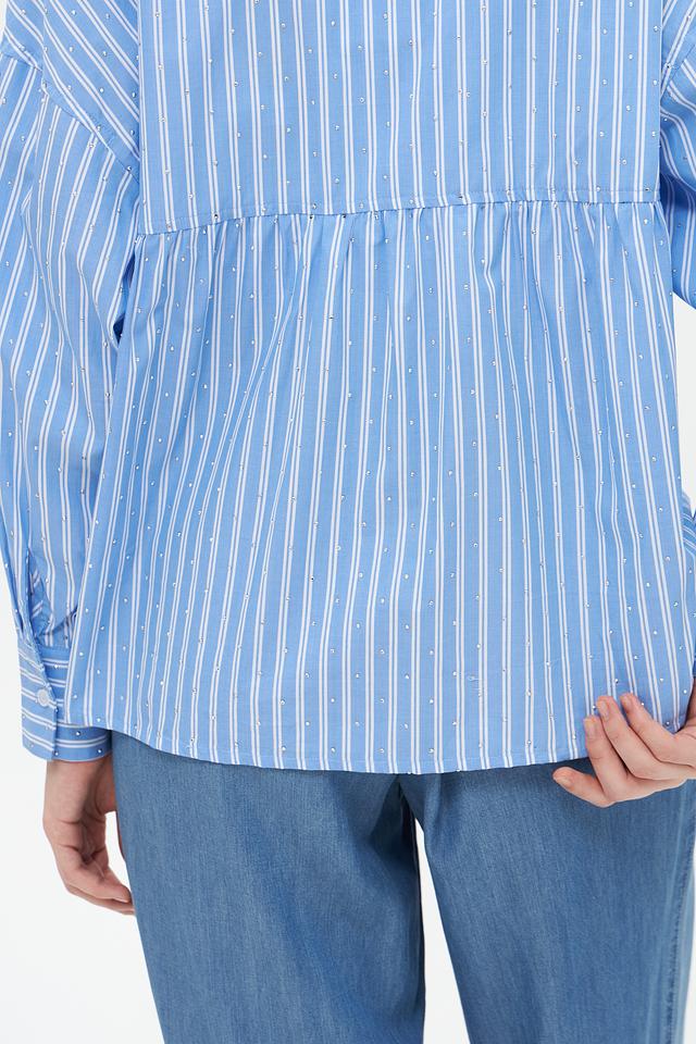 Блузка имеет свободный крой, обеспечивающий комфорт в носке. Дополнительный акцент в виде небольшой сборки на талии придает модели более женственный силуэт.