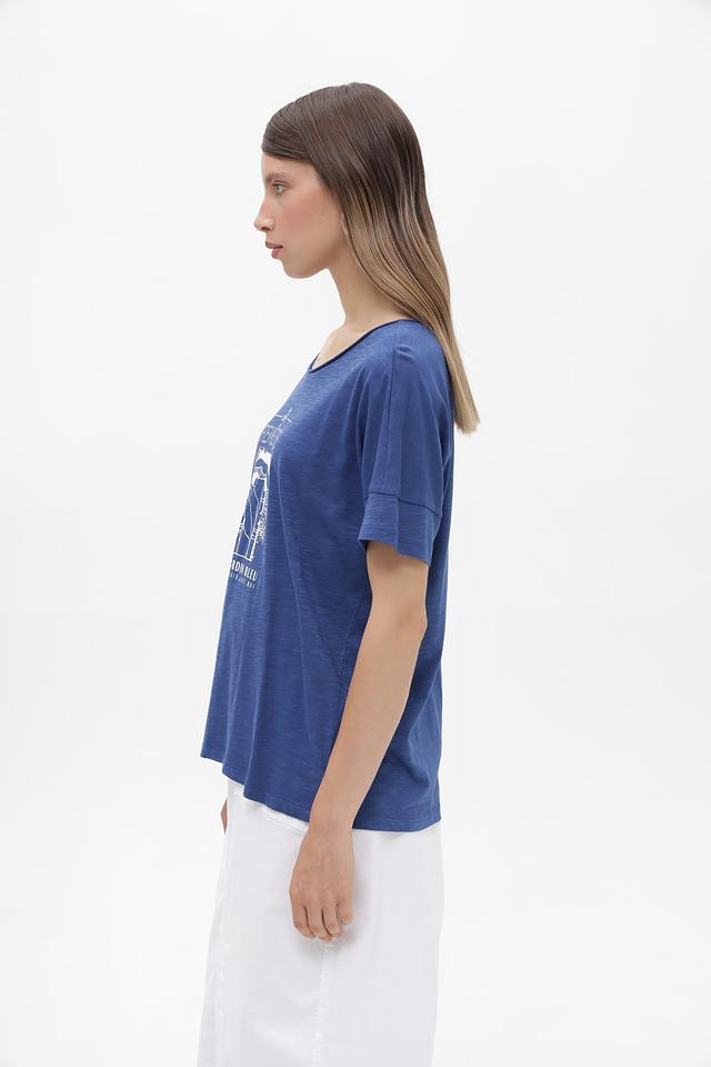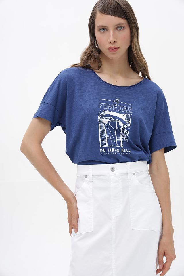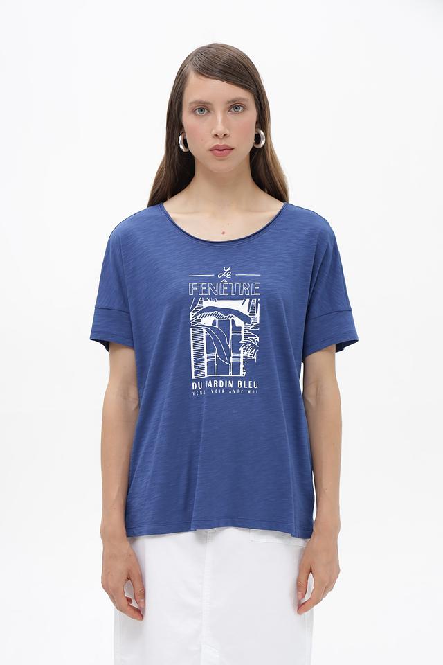Женская футболка Lecomte синего цвета с графичным принтом. Изготовлена из мягкого хлопка с добавлением модала для комфорта и приятных ощущений. Идеальна для создания повседневных образов. Состав: хлопок 50%, модал 50%