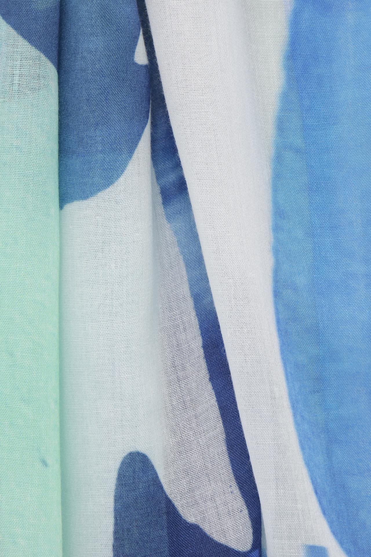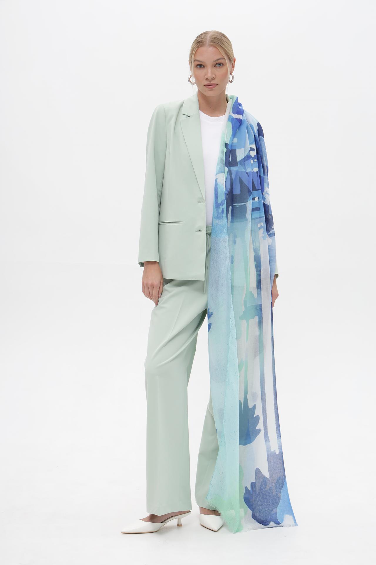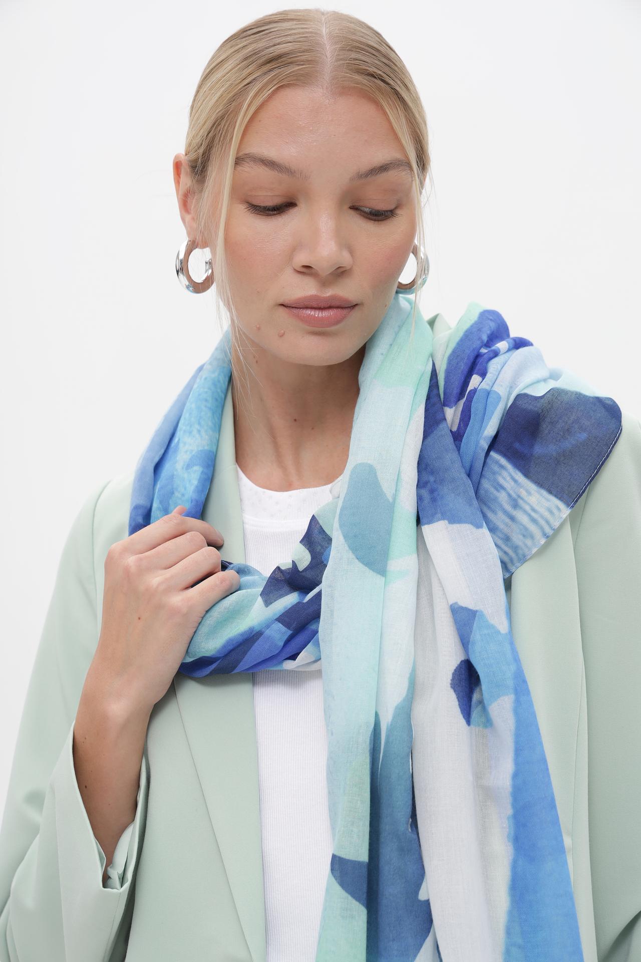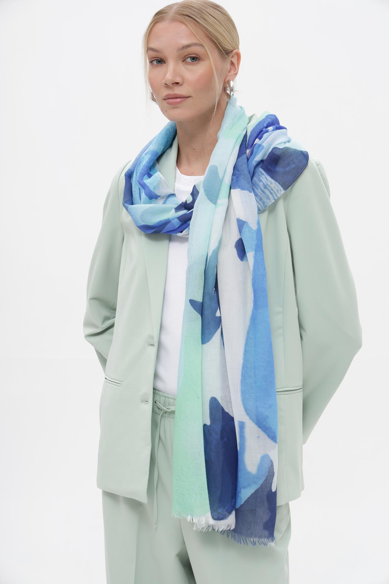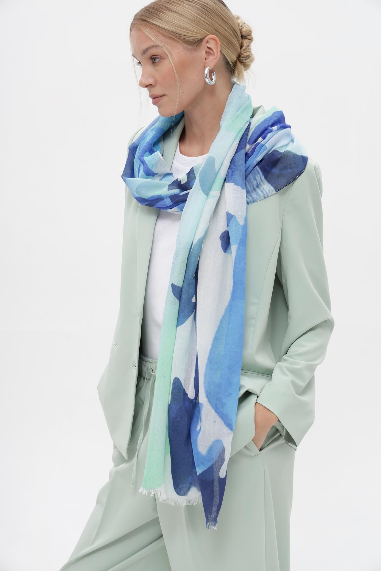 - Универсальный дизайн. Абстрактный узор в сине-голубых и мятных оттенках легко сочетается с различными цветами одежды, позволяя экспериментировать с образами. Бахрома по краям добавляет классический завершенный вид.