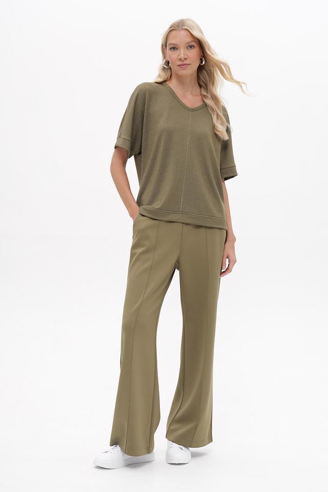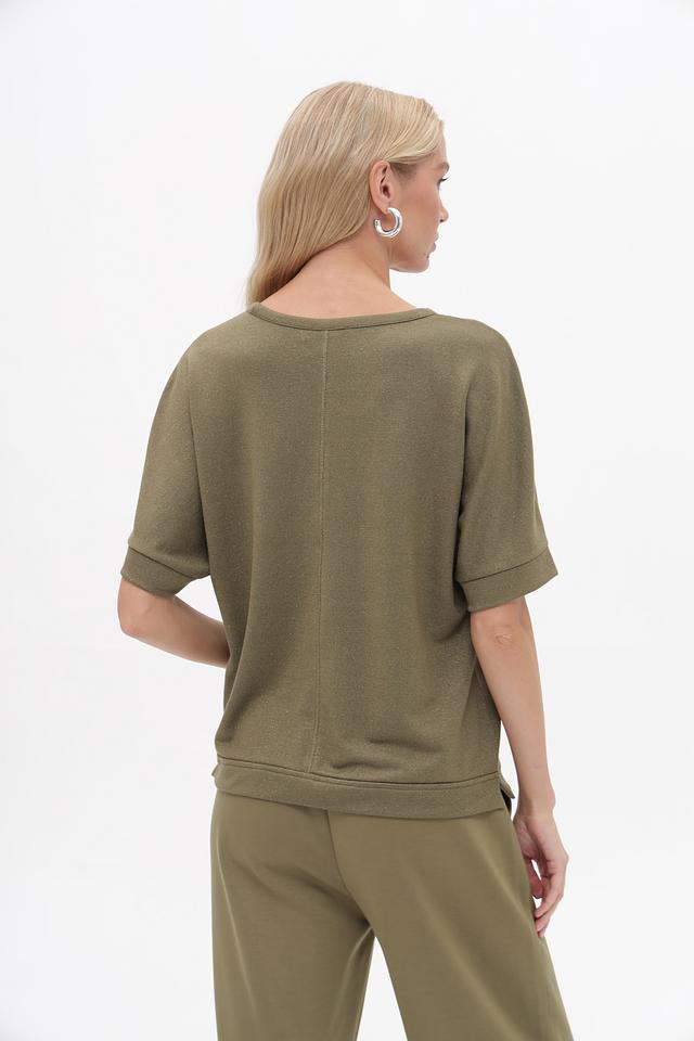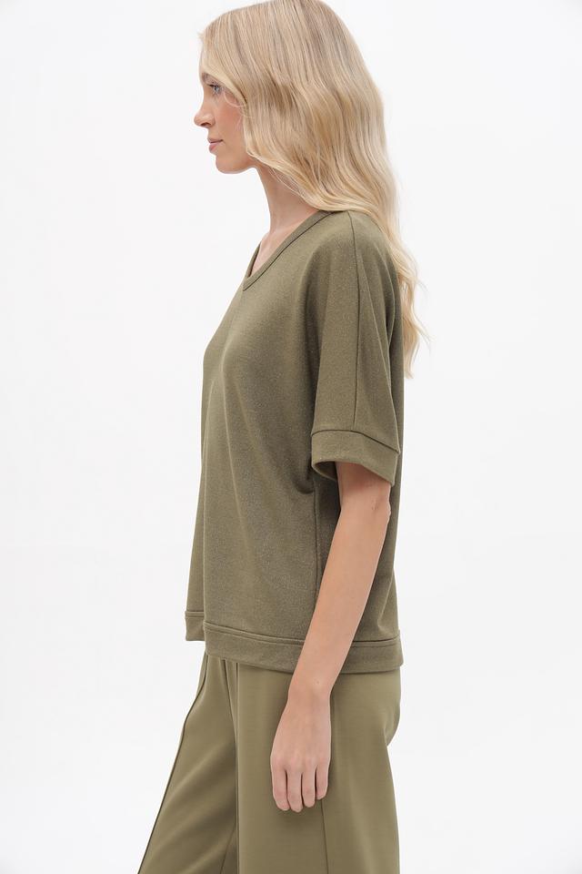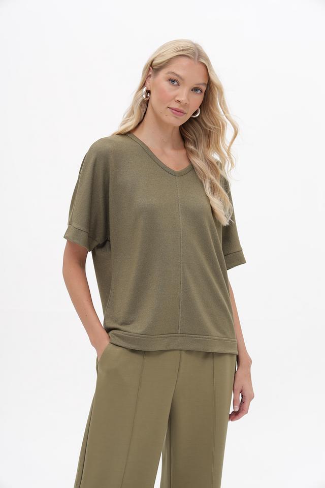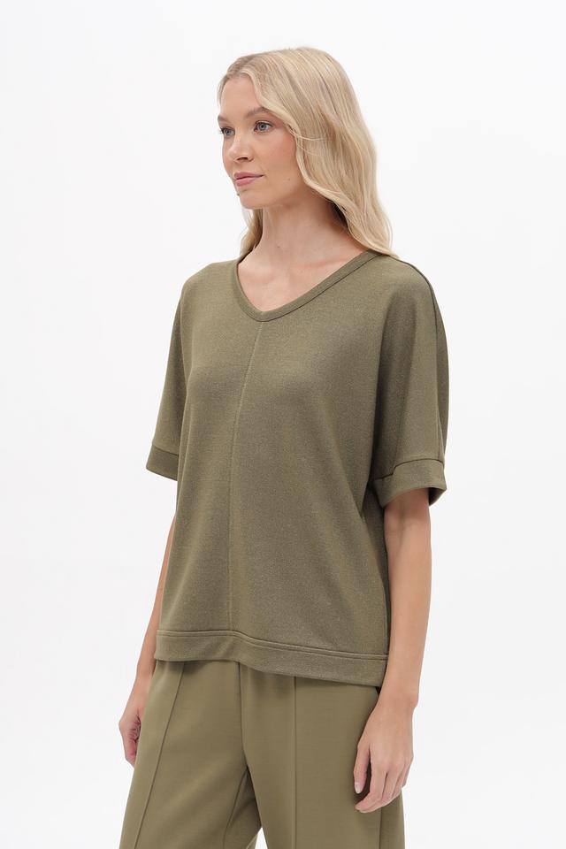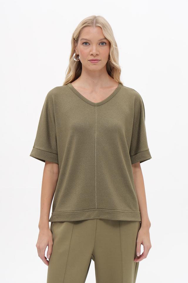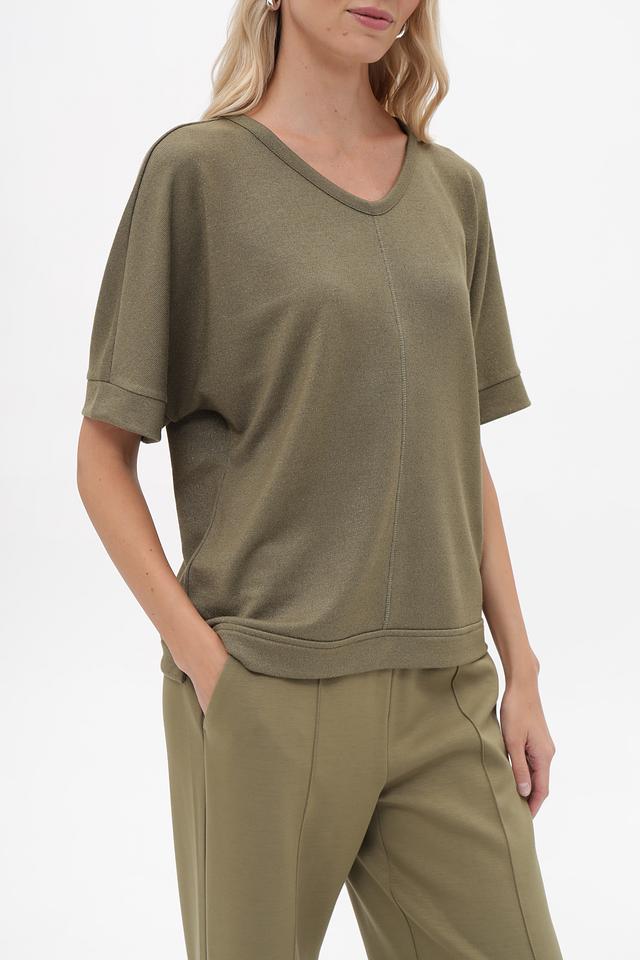 Женский пуловер Lecomte оливкового цвета с V-образным вырезом и короткими рукавами. Изготовлен из мягкой вискозы с добавлением металлизированной нити и эластана для комфорта и элегантного блеска. Состав: вискоза 70%, метализ.нить 25%, эластан 5%