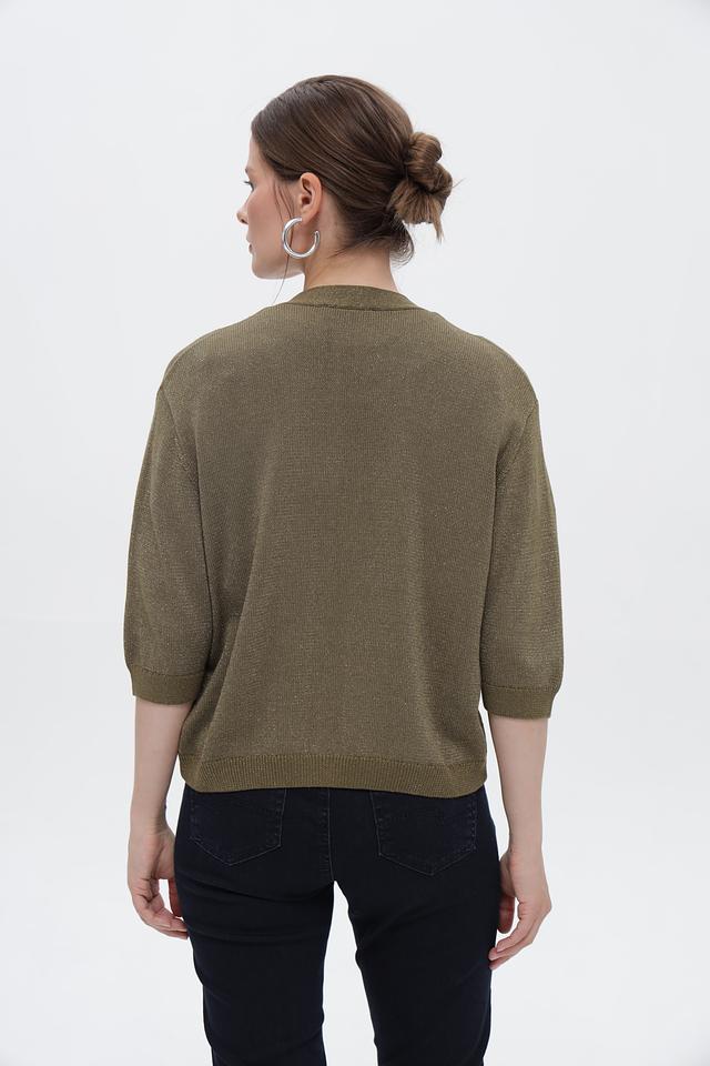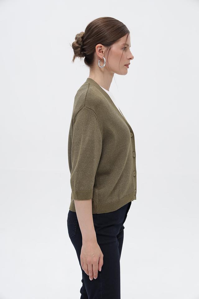 Жакет имеет удобный V-образный вырез и застегивается на ряд пуговиц. Короткие рукава 3/4 делают его идеальным для теплой погоды или для ношения поверх легких блузок и топов.