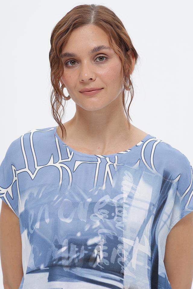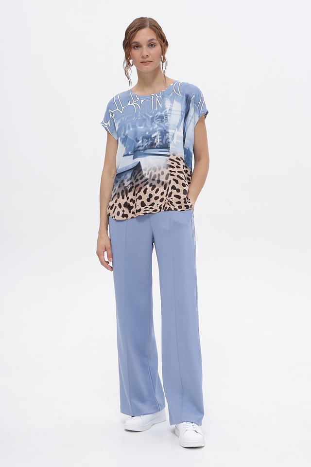 Блуза имеет свободный крой, который не сковывает движений и позволяет создать расслабленный образ. Особенностью модели является яркий принт, сочетающий в себе абстрактные элементы и леопардовый узор в голубой и бежевой гамме.