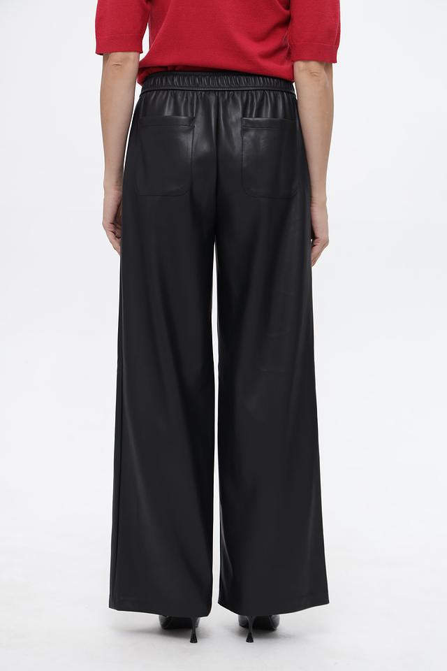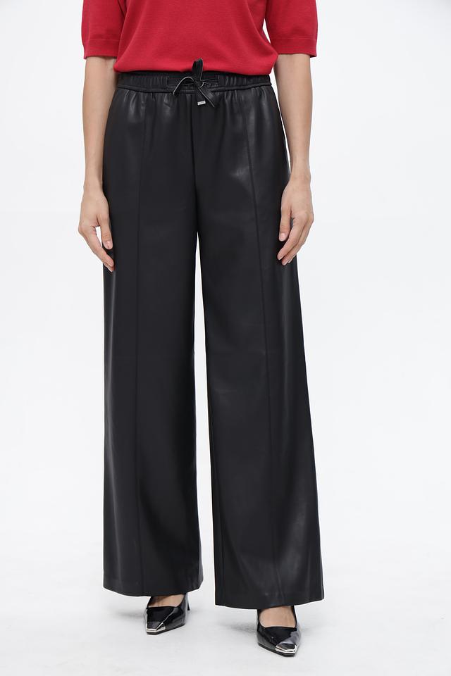 Женские брюки Lecomte чёрного цвета из экокожи с завышенной талией и широкими штанинами. Модель выполнена из полиэстера с полиуретановым покрытием, имеет эластичный пояс с завязками. Состав: полиэстер с полиуретан.покрытием 100%