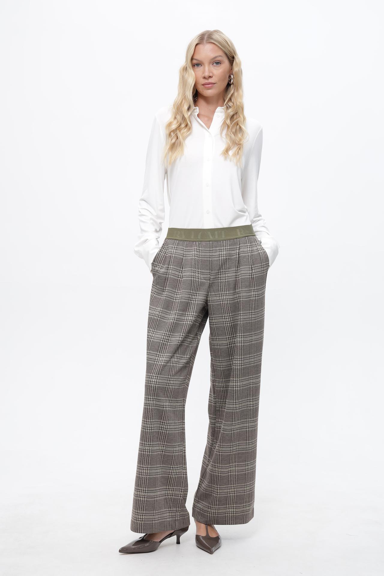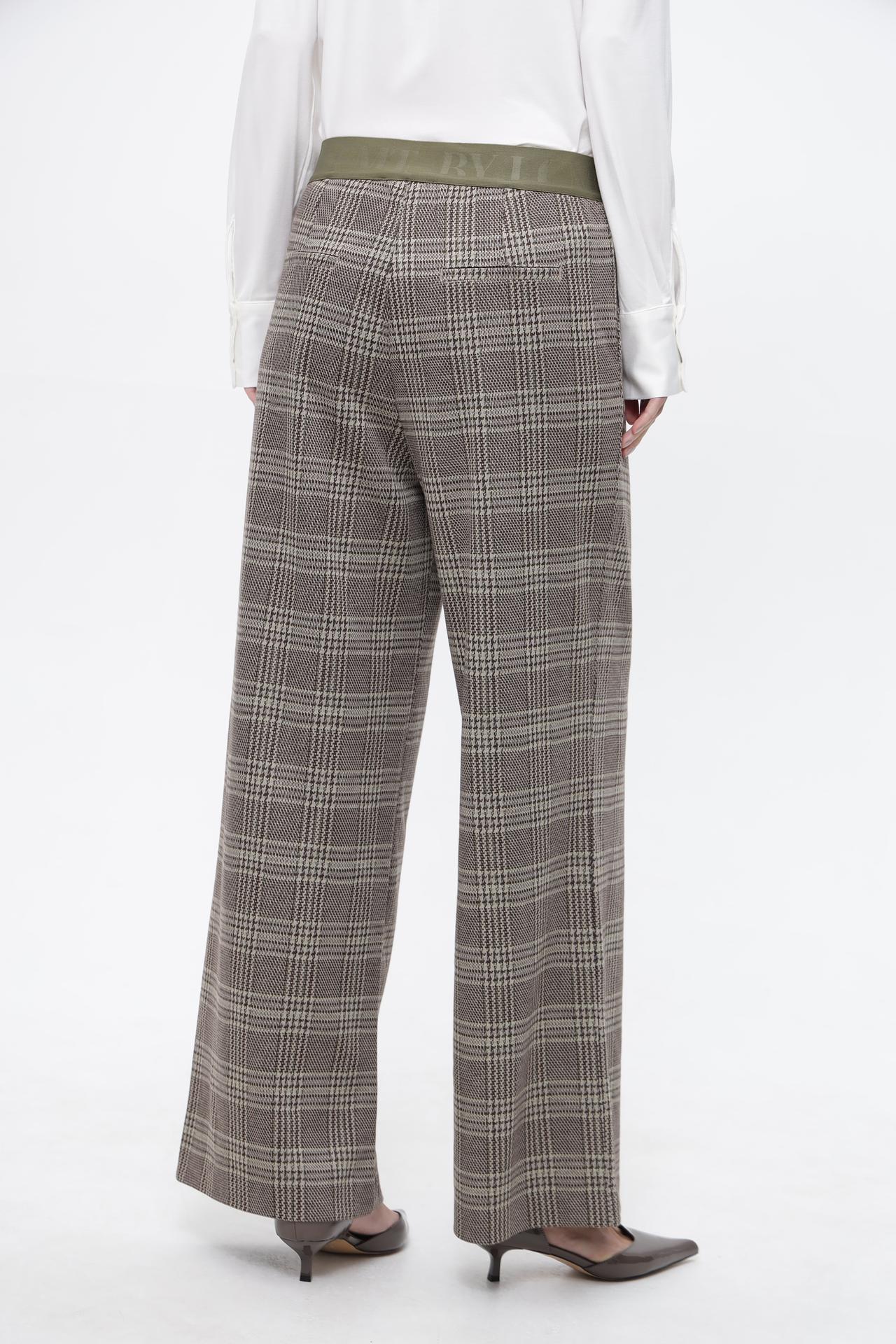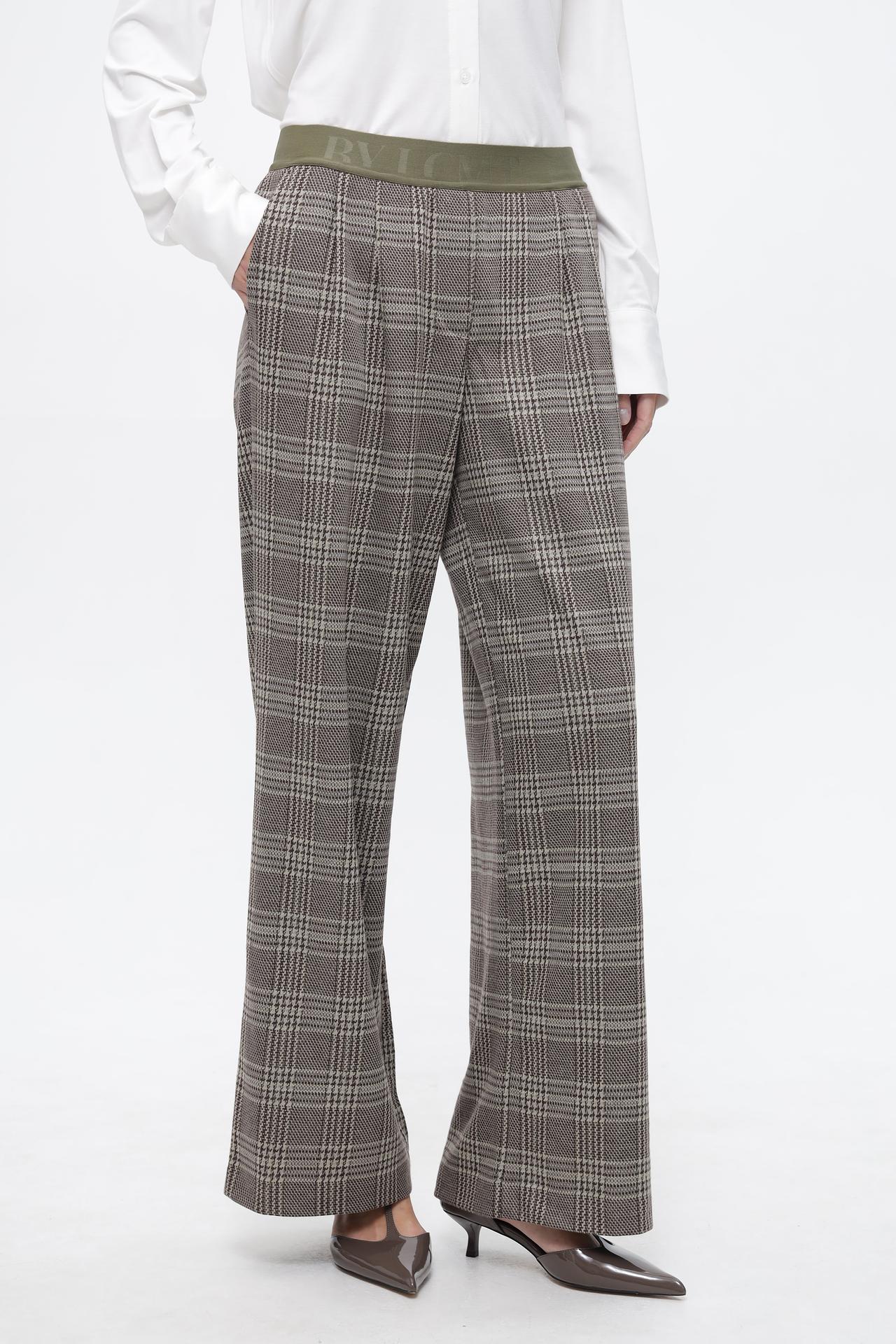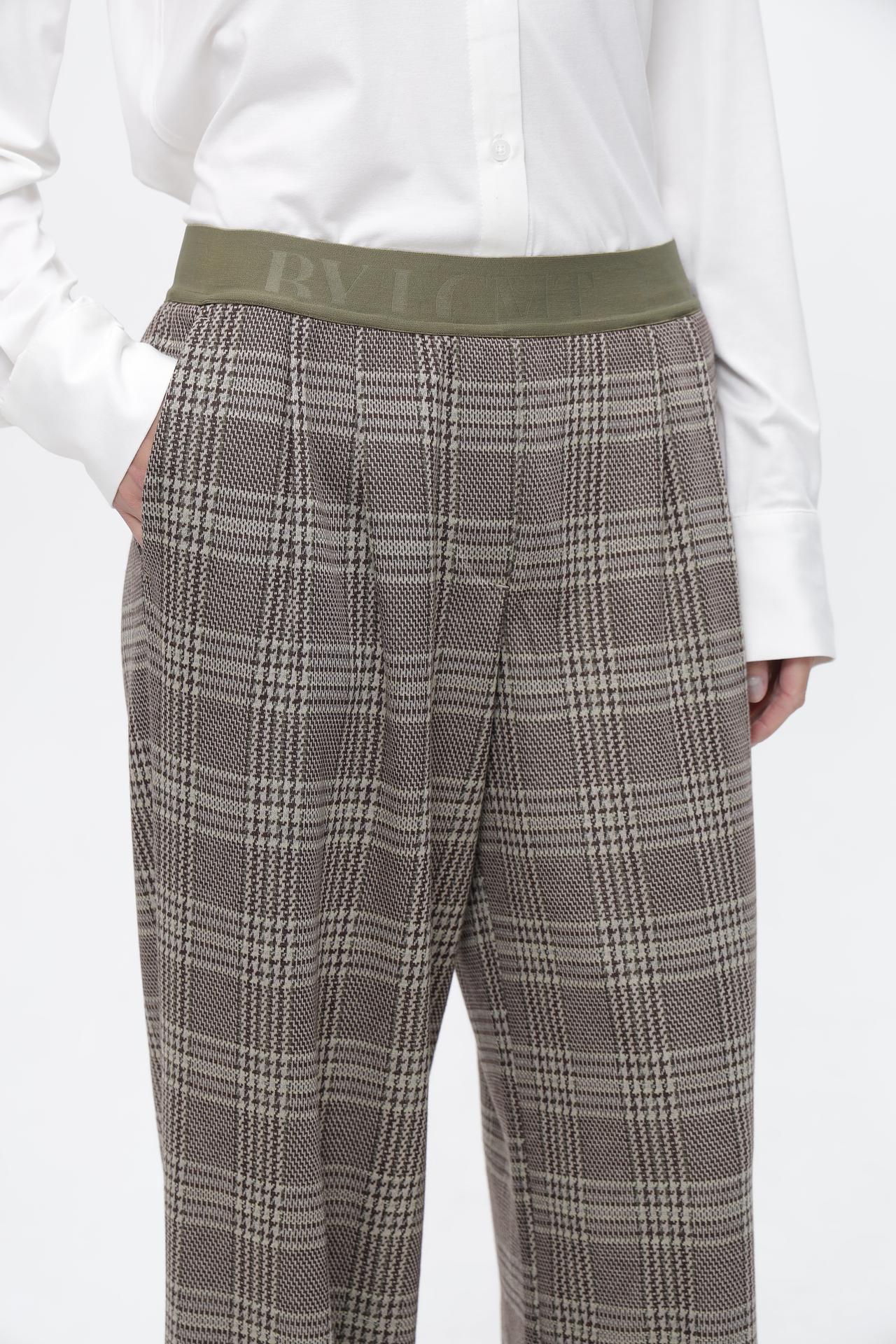 - Дизайн: Классическая клетка в серо-коричневых тонах и контрастный эластичный пояс с логотипом бренда делают брюки стильным элементом гардероба.