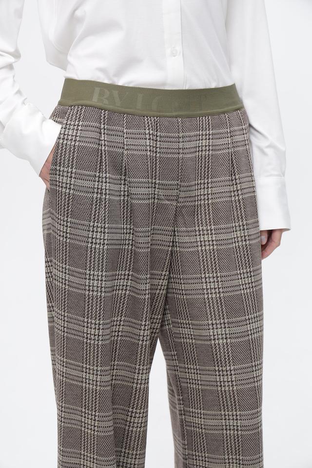 Брюки имеют пояс с логотипом бренда, выполненный в приглушенном зелёном цвете, что добавляет образу оригинальности.