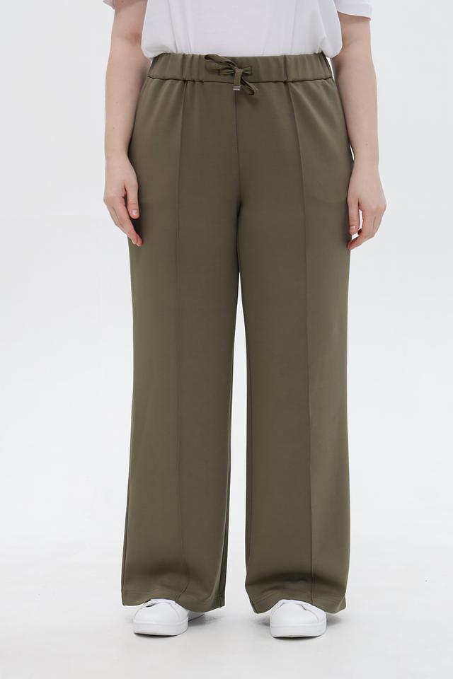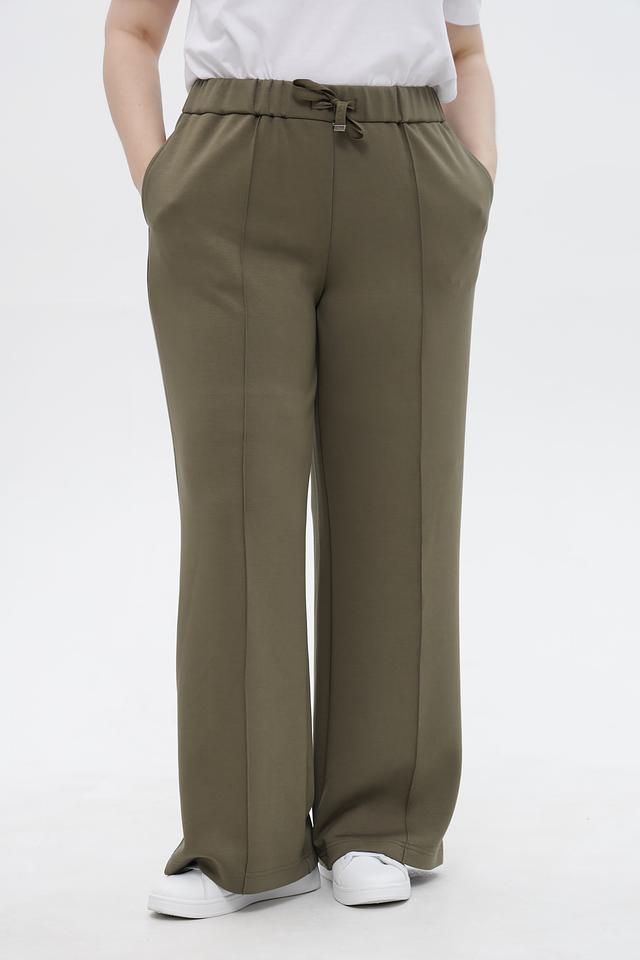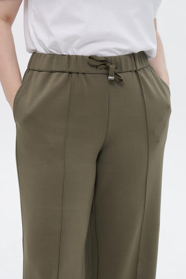 Брюки имеют завышенную талию и пояс на эластичной резинке с функциональным шнурком, обеспечивающим комфортную посадку по фигуре. Боковые карманы добавляют практичности.