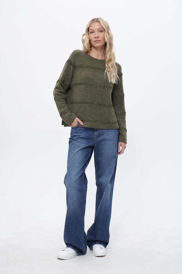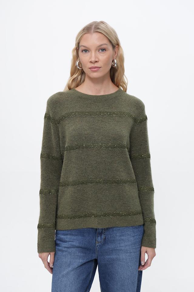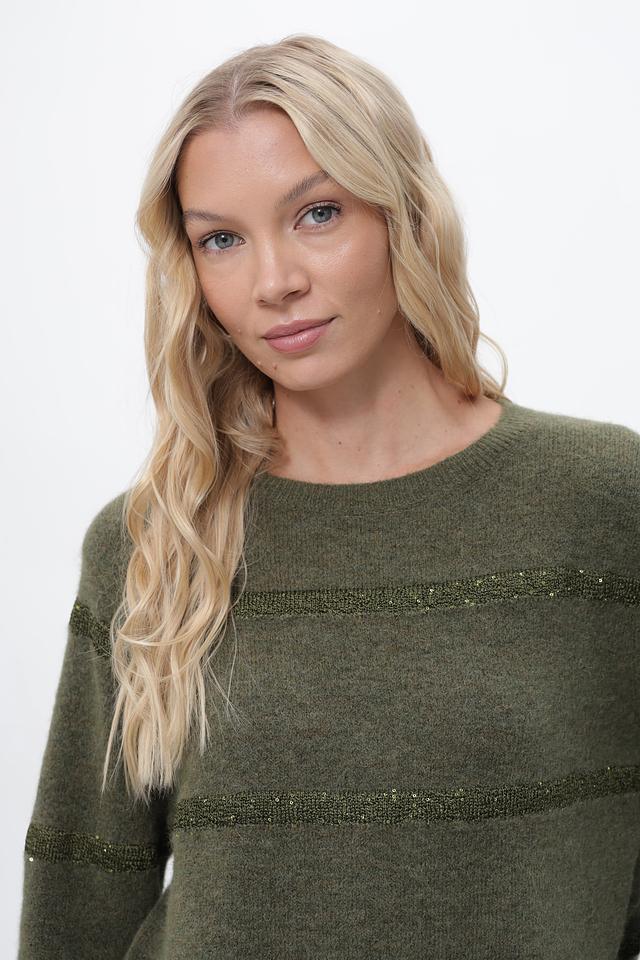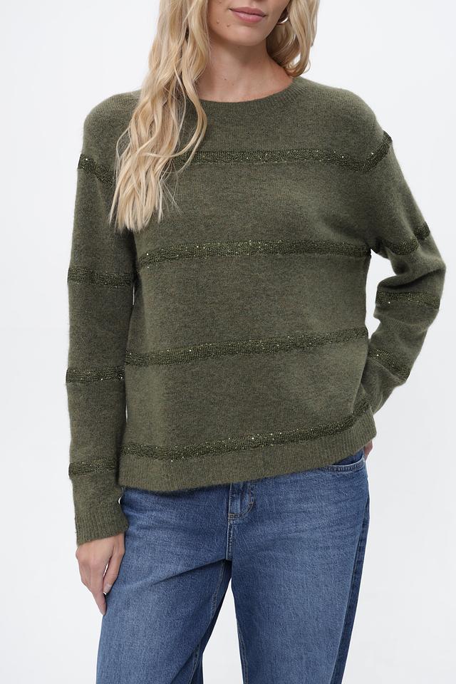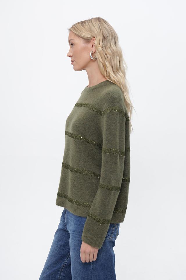 Оливковый цвет пуловера придает ему универсальность, позволяя легко сочетать его с различными элементами гардероба. Декоративные полосы из пайеток добавляют изделию изысканности и привлекают внимание.