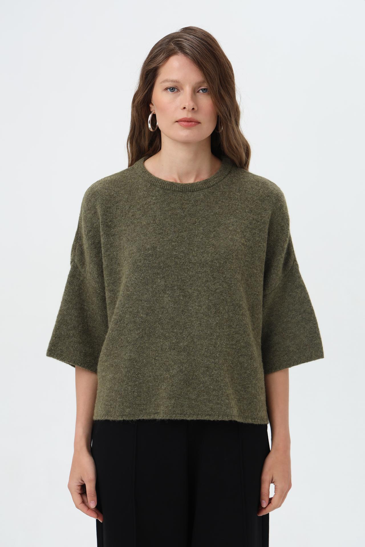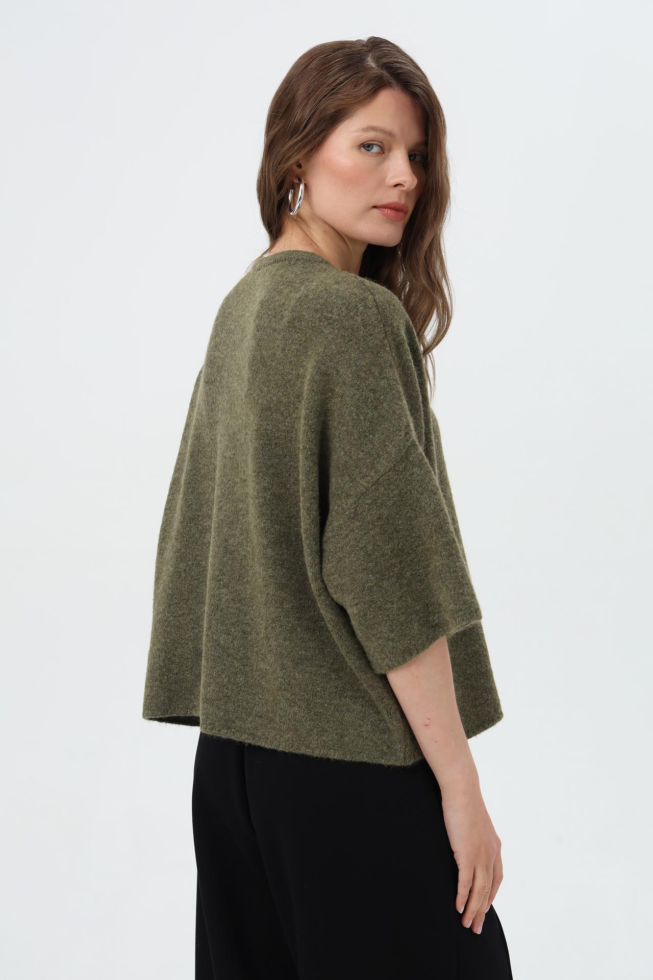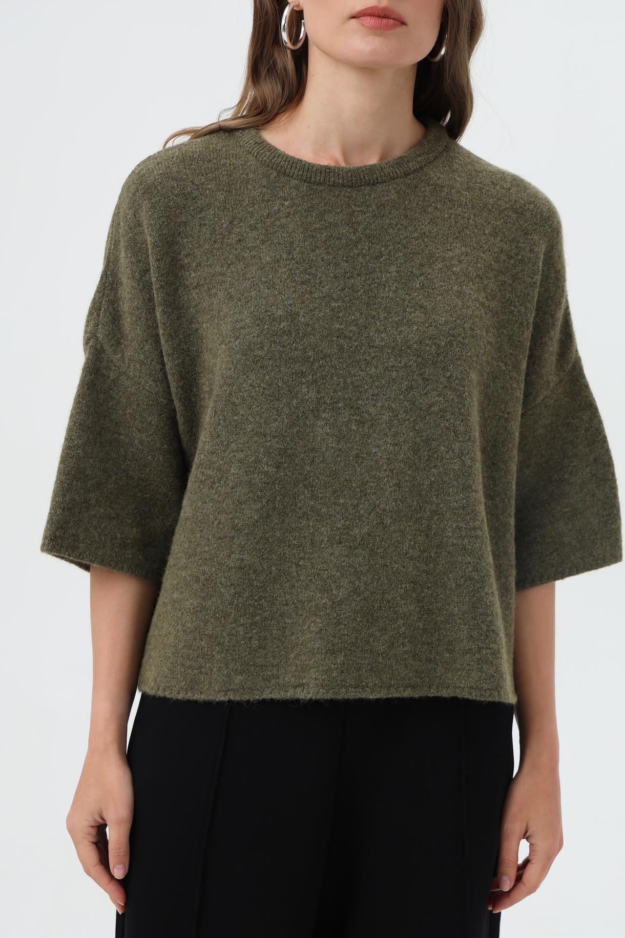 - Крой: Свободный силуэт и укороченные рукава создают современный и непринужденный вид. Пуловер отлично сочетается с брюками и юбками различной длины.