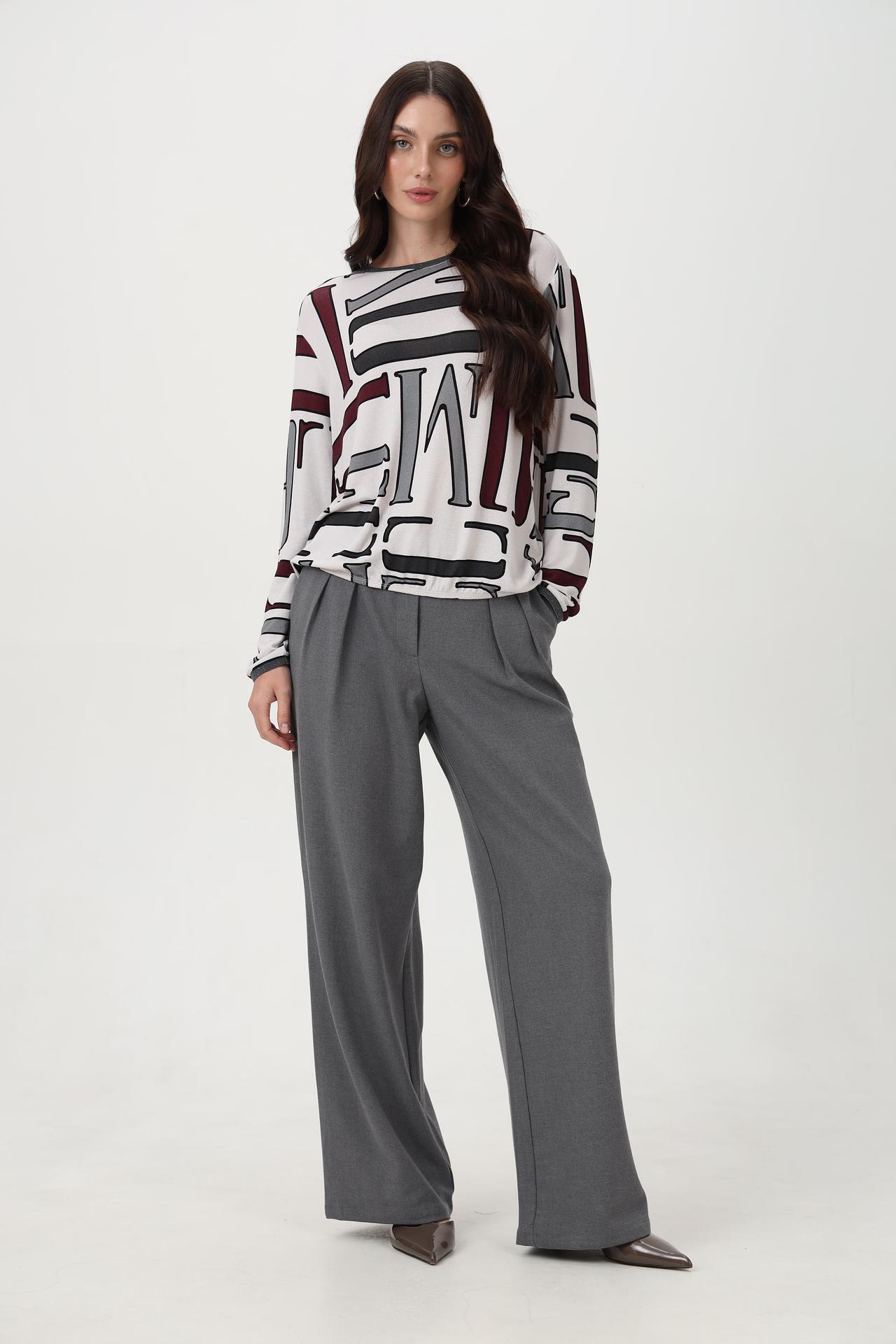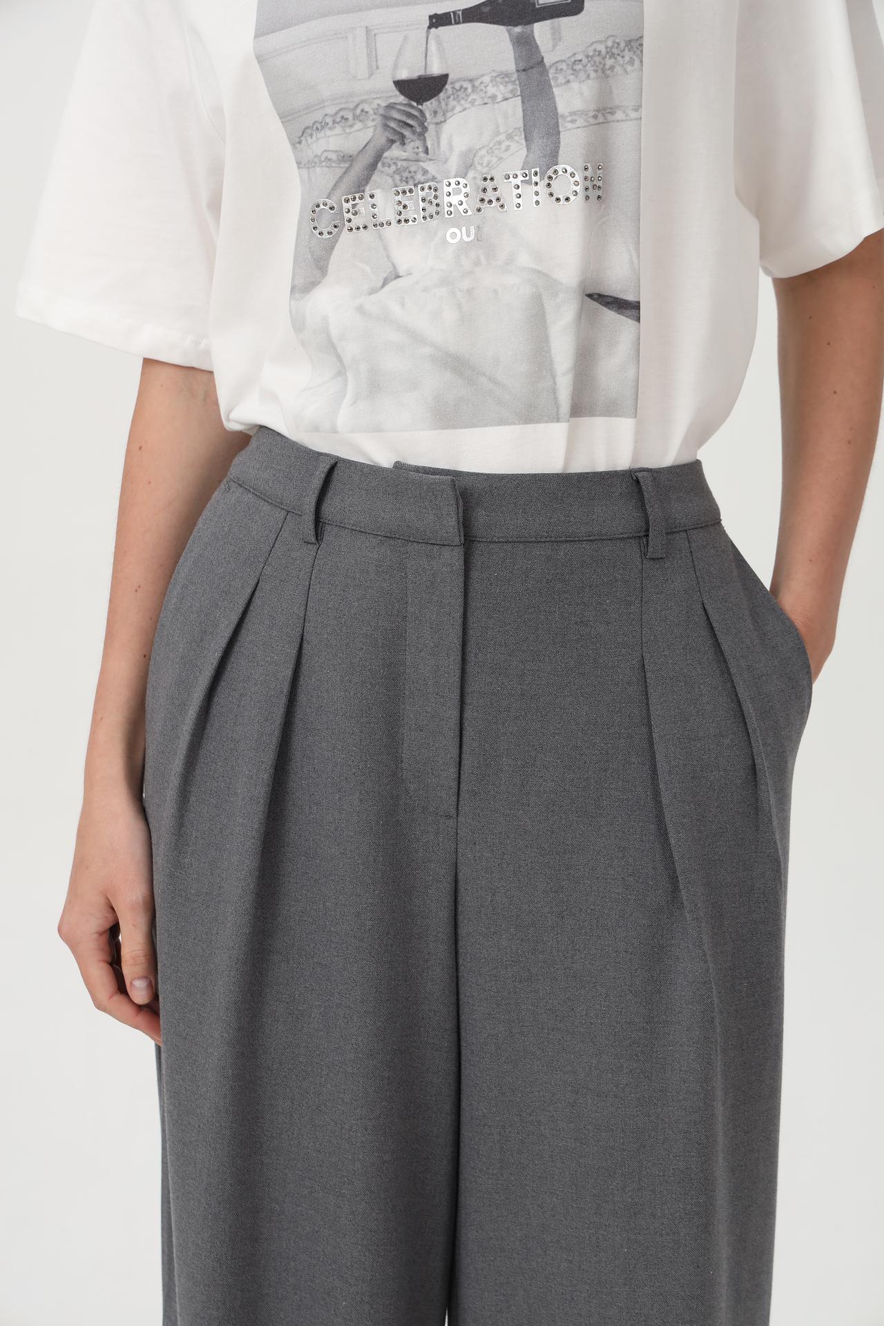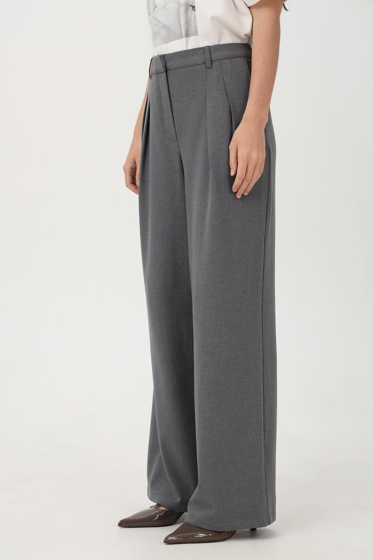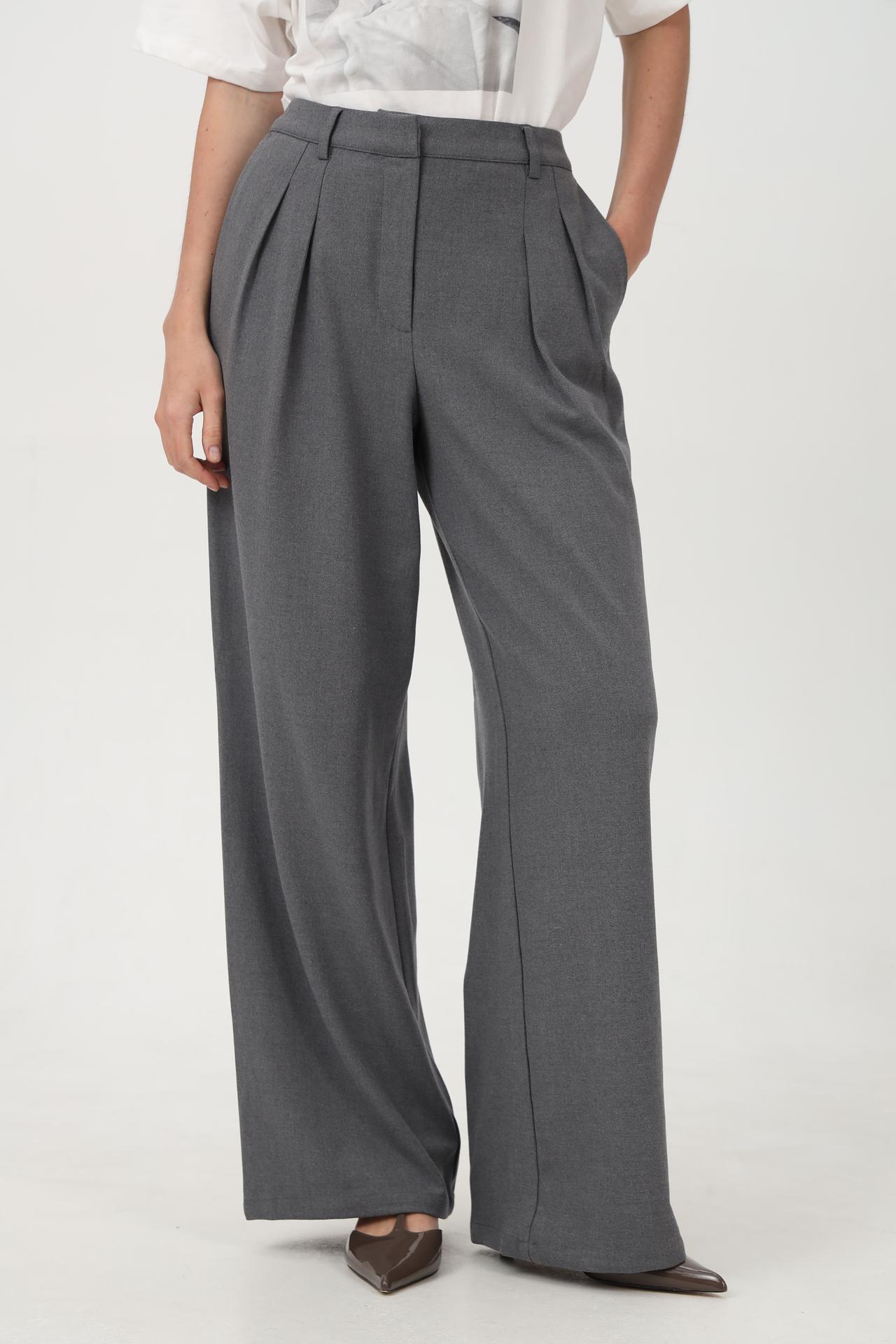 - Крой: Широкие брюки с высокой талией и элегантными стрелками. Этот фасон визуально вытягивает силуэт и придает образу утонченность.