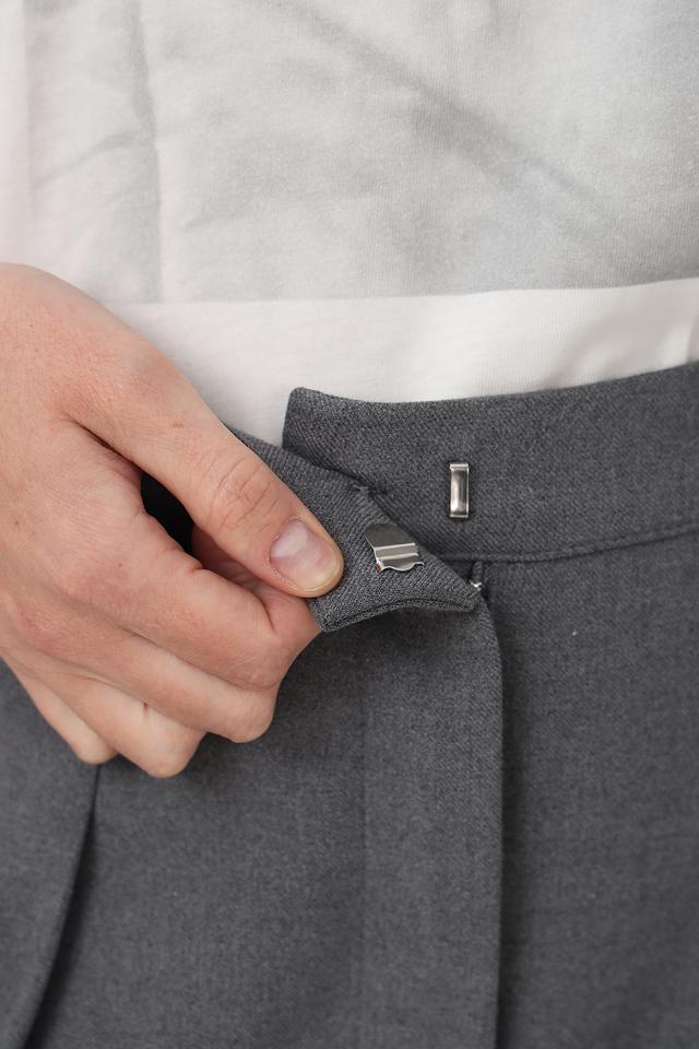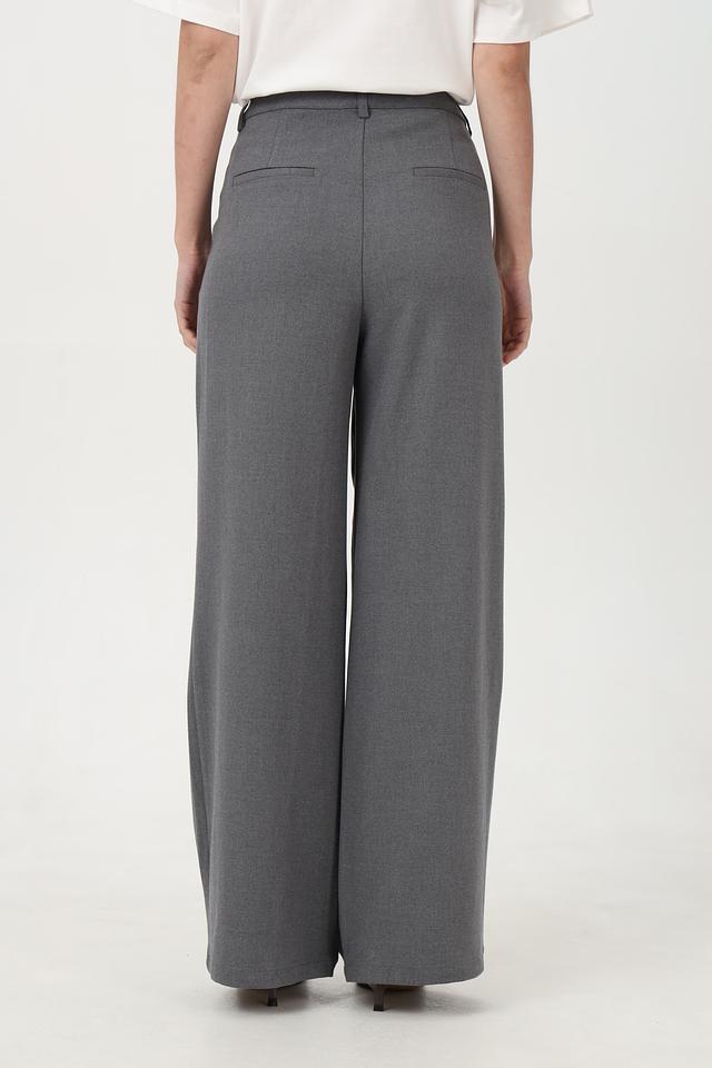 Брюки имеют высокую посадку и клёш от бедра, что визуально удлиняет ноги и создает женственный силуэт. На поясе расположены защипы, придающие брюкам более аккуратный вид. Застежка-молния обеспечивает надежную фиксацию.
