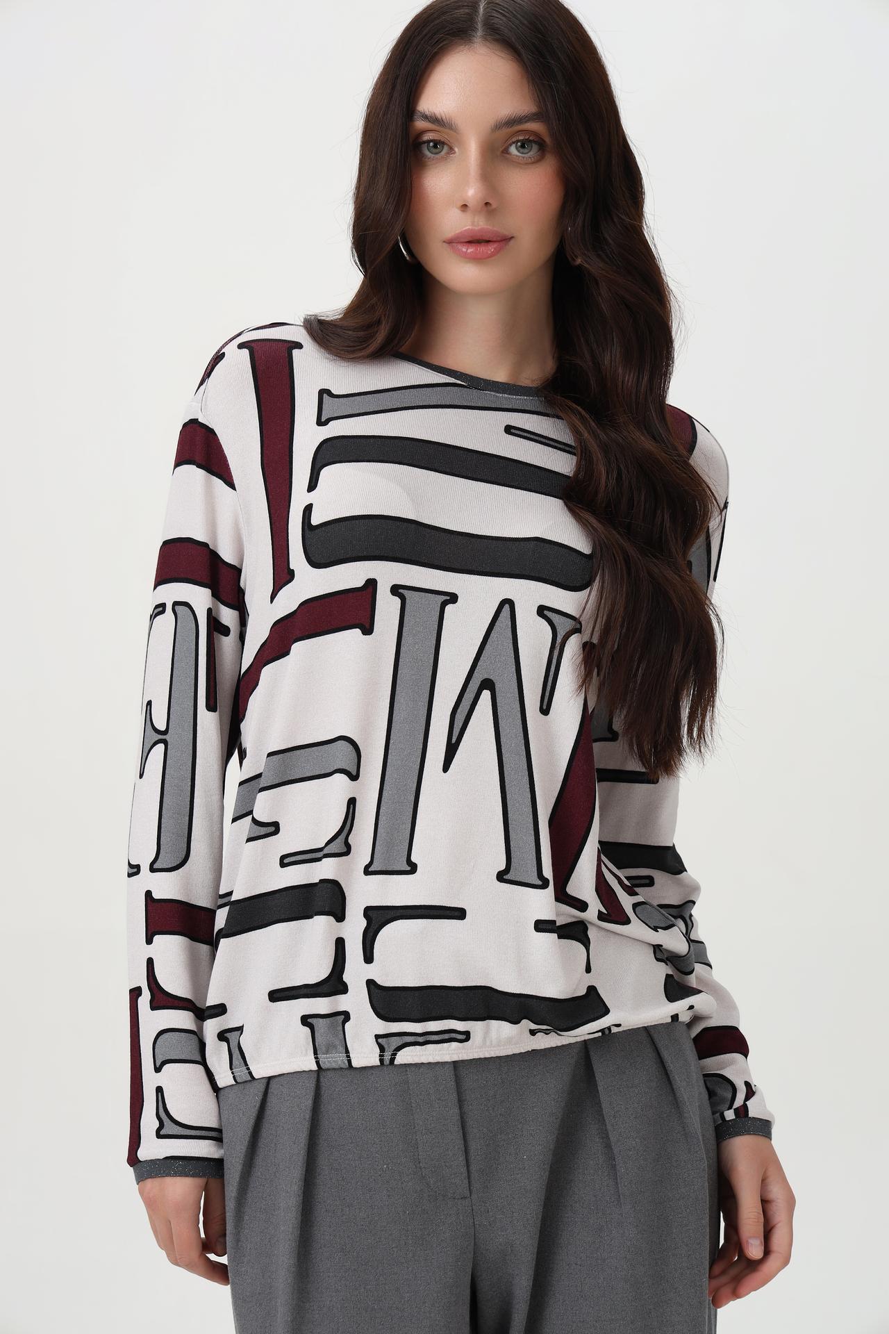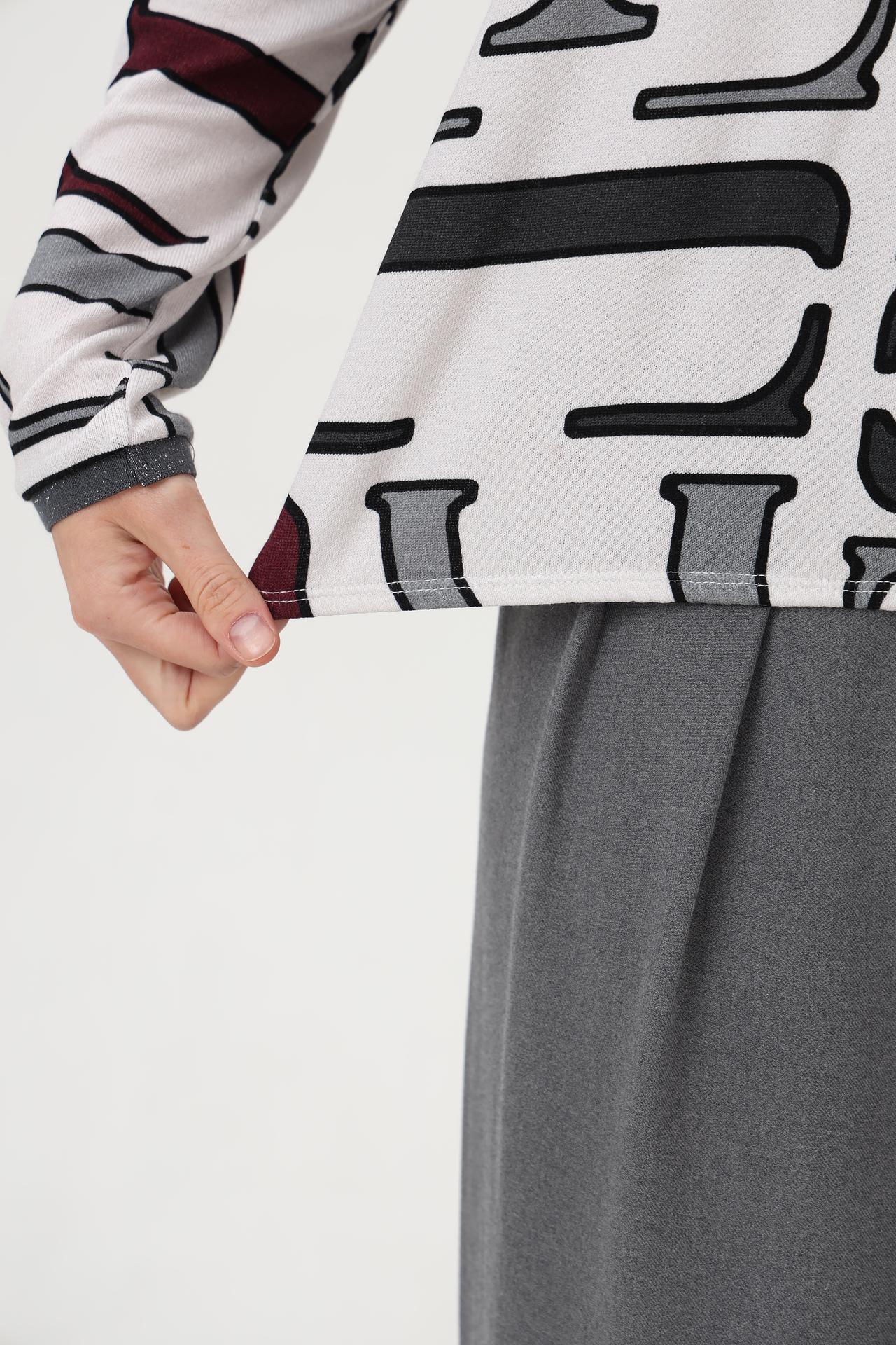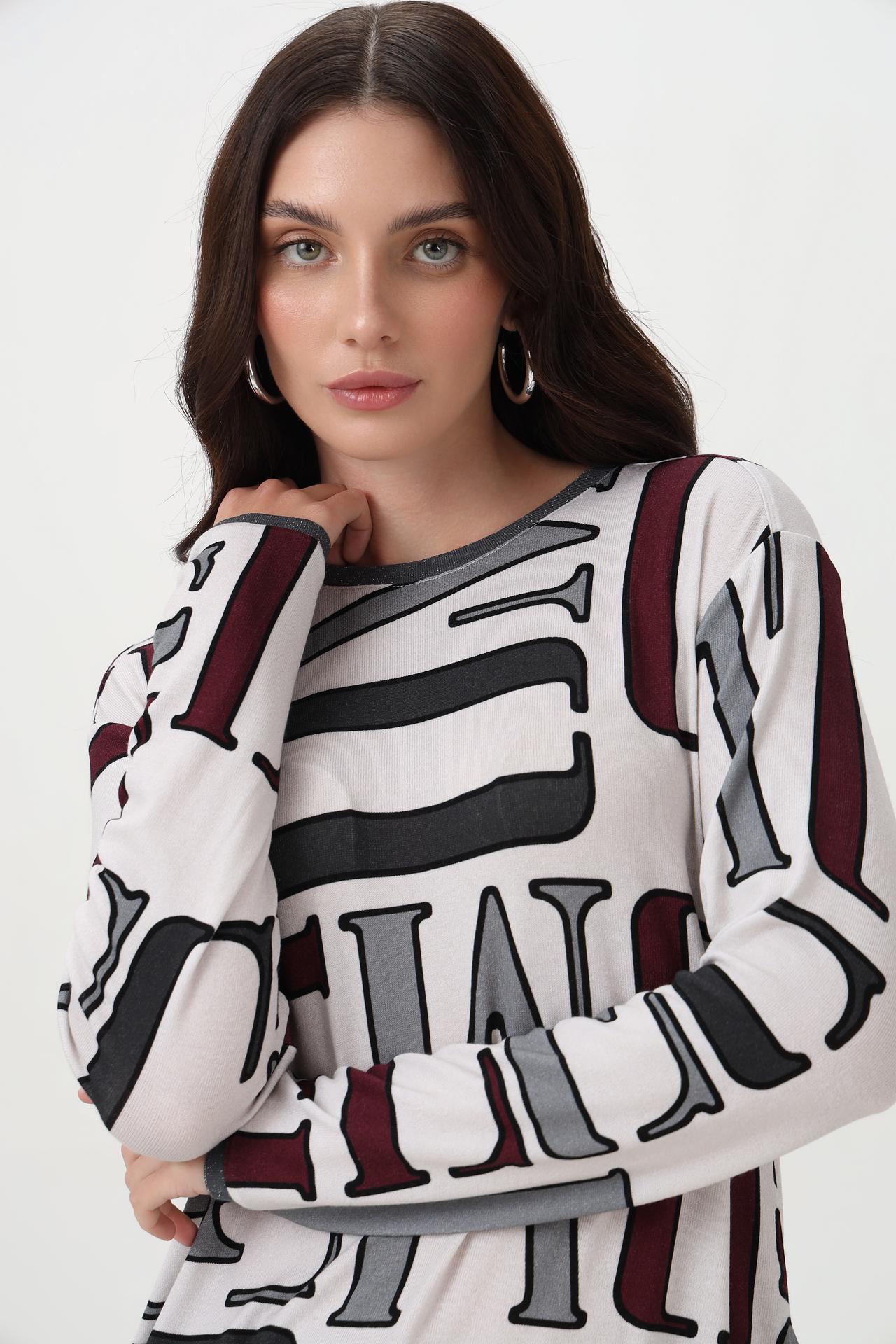- Дизайн: Современный принт с буквами в сочетании бордового, серого и черного цветов на светлом фоне. Крой модели свободный, с длинными рукавами и круглым вырезом горловины, что создает расслабленный, но в то же время элегантный образ.