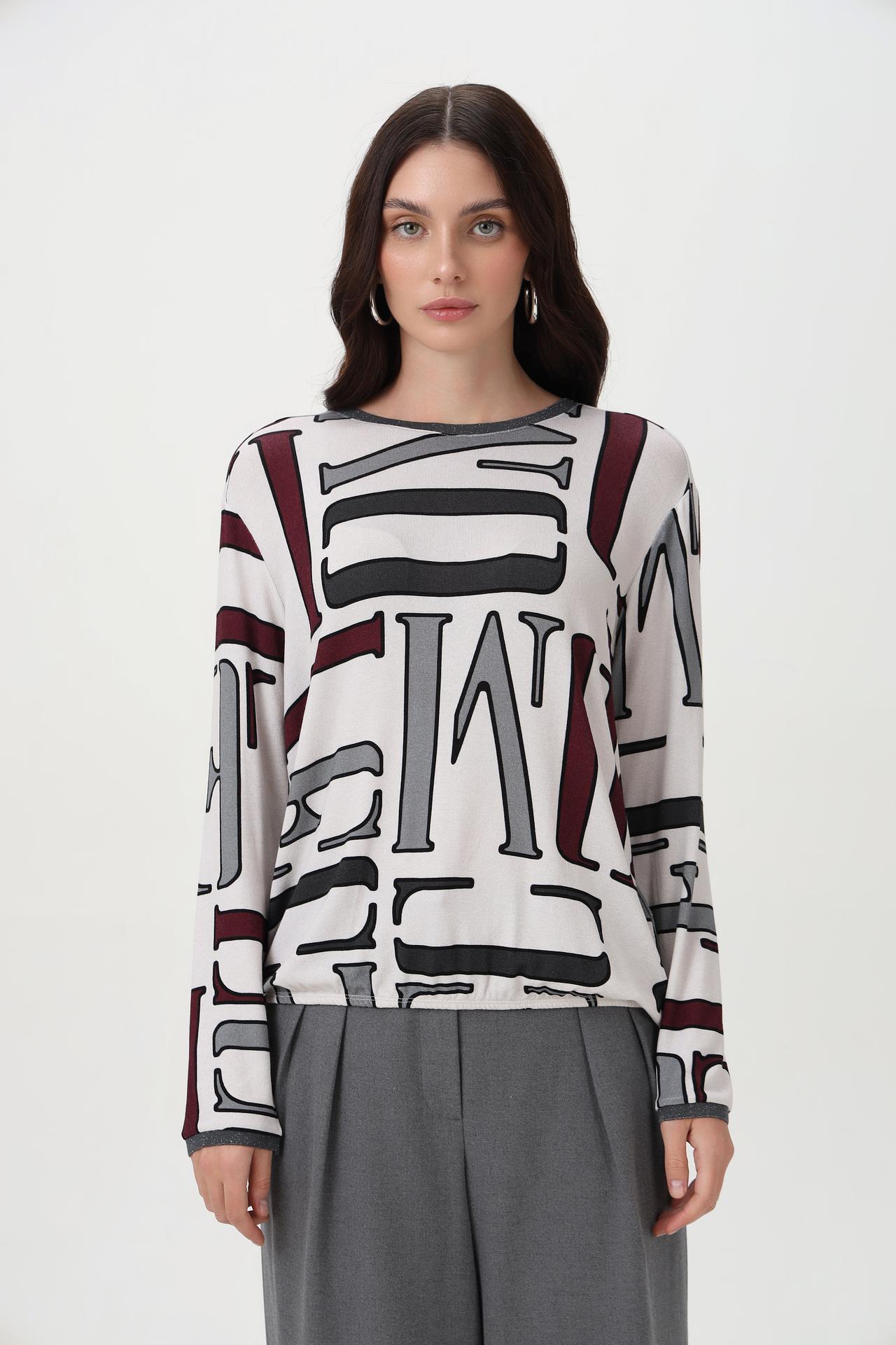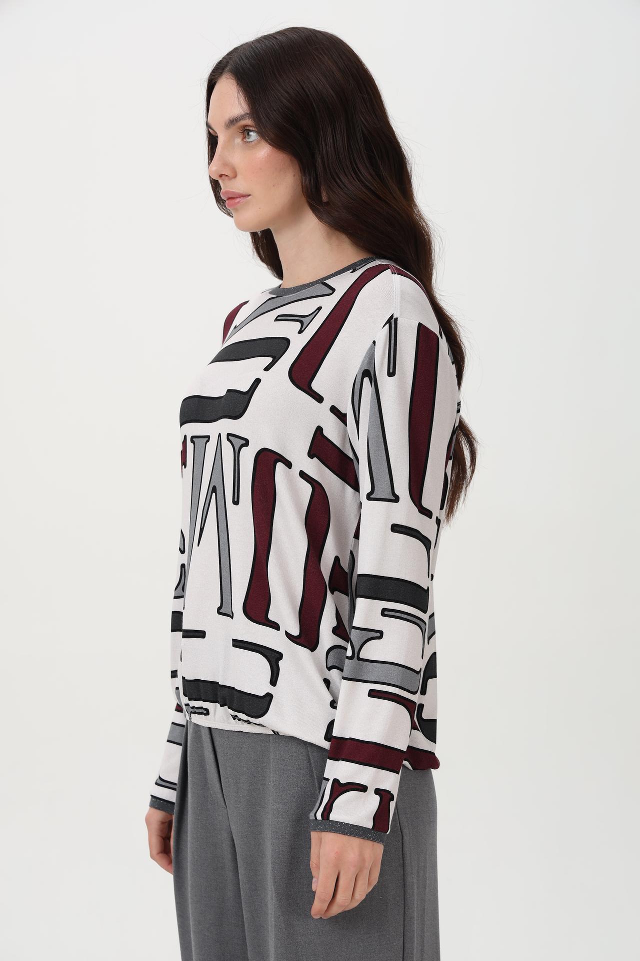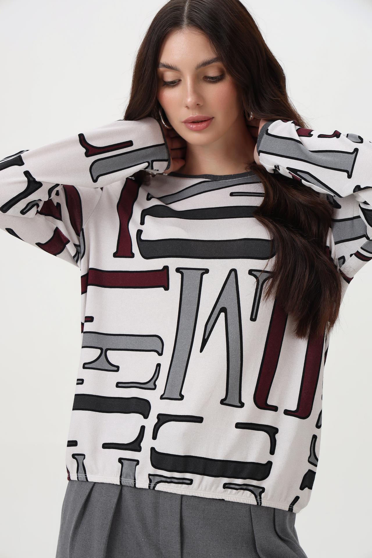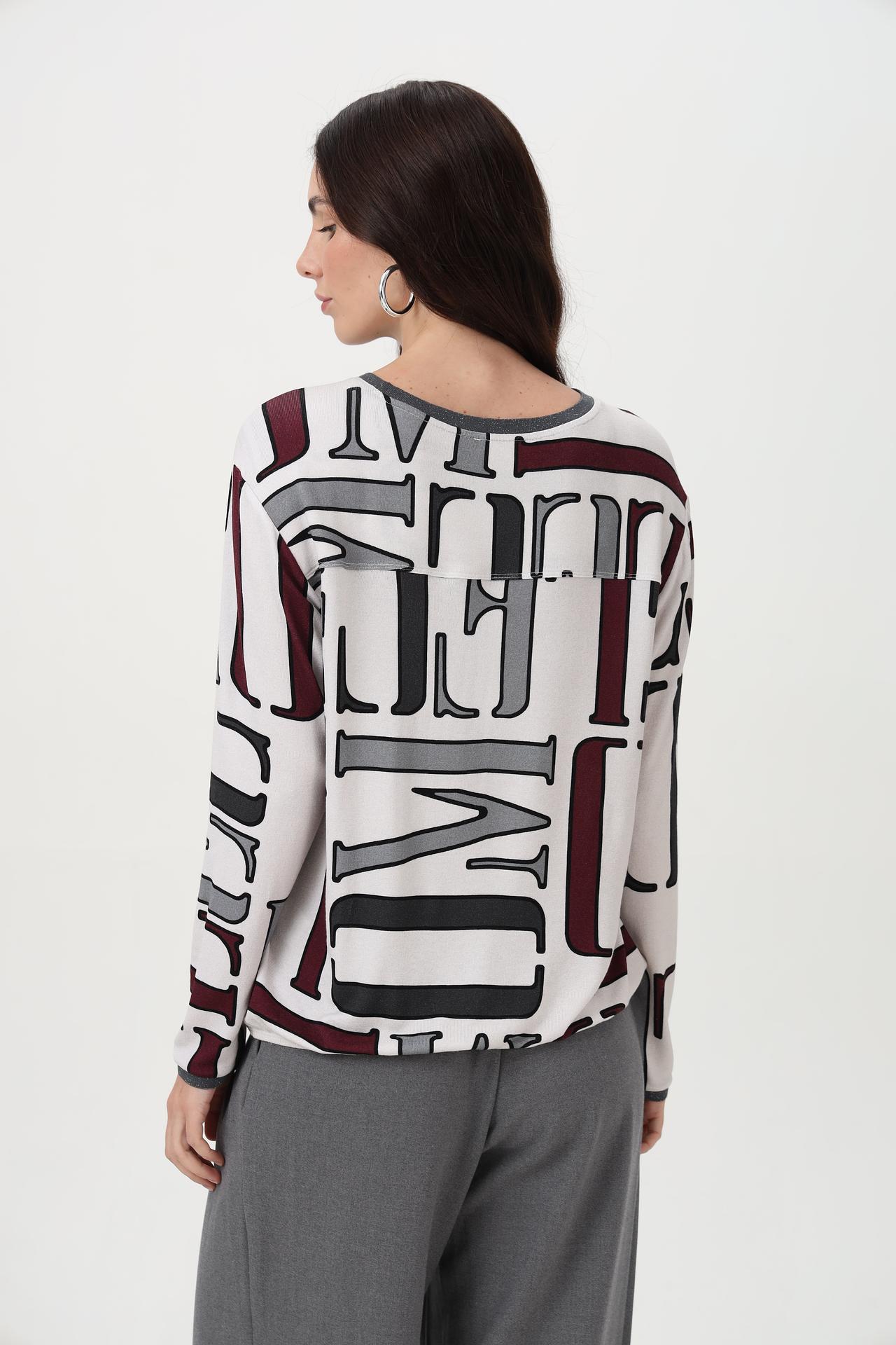 - Дизайн: Современный принт с буквами в сочетании бордового, серого и черного цветов на светлом фоне. Крой модели свободный, с длинными рукавами и круглым вырезом горловины, что создает расслабленный, но в то же время элегантный образ.